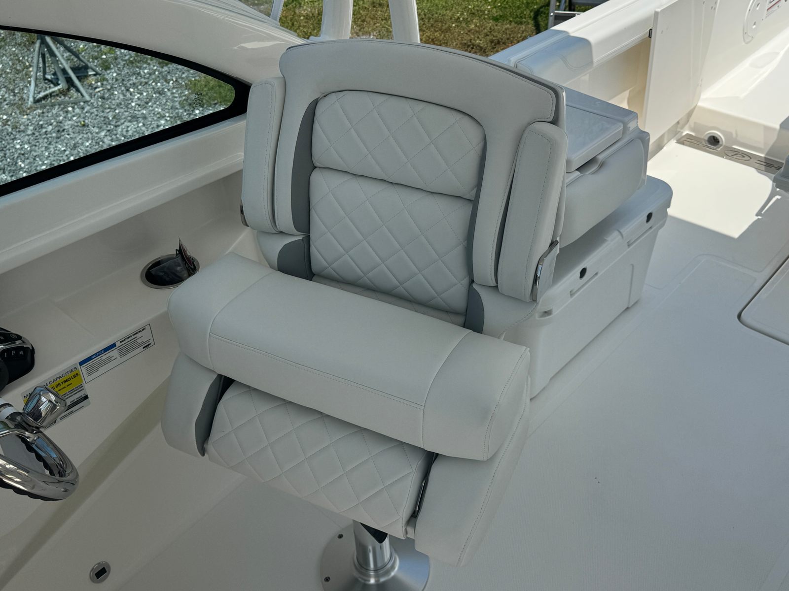The Pursuit DC 246 is loaded with premium features designed to enhance your time on the water. The upgraded Hardtop Front and Side Curtains in Stamoid White, along with the Hardtop Aft Curtain, provide excellent protection from the elements, ensuring comfort in varying weather conditions. The Garmin Electronics Package, featuring the GPSMAP 8612XSV, Airmar B75M 0-7 Degree 600-watt CHIRP Transducer, NMEA 2000 Starter Kit, Pursuit Custom Dash Panel, and VHF Radio, offers state-of-the-art navigation and communication capabilities, making every journey safer and more enjoyable.For those who love to entertain or simply relax after a day of adventure, the DC 246 boasts a Premium Stereo Upgrade by JL Audio, complete with a 6 Channel DSP Amp, Subwoofer, four Sport Speakers with blue backlighting, an external antenna, and a Sirius Receiver with a three-month subscription. The mid-level cockpit accent lights in LED blue (four in total) create a vibrant and inviting atmosphere for evening cruises or dockside gatherings.Additional features include a removable transom mount ski tow for watersports enthusiasts, a folding transom seat on the portside for added seating flexibility, an upholstery upgrade to white/gray for a modern and luxurious look, a starboard windshield wiper with fresh water wash for clear visibility, and a cadet gray instrument cover to protect your controls from the elements.