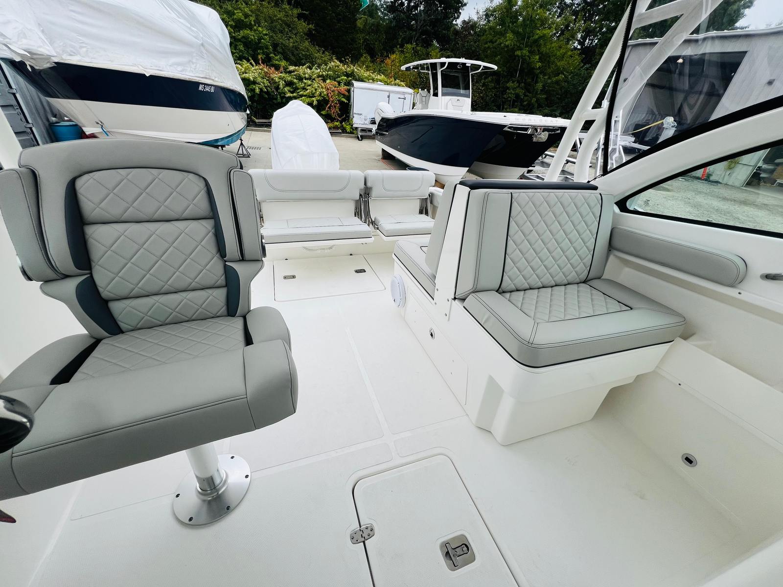 The Pursuit DC 246 is loaded with features designed to enhance your boating experience. The anchor windlass system with remote allows for easy anchoring, making it simple to find the perfect spot to relax or fish. Underwater lights, specifically two all-color Sea Blaze Quattro Spectrum units, create a captivating glow beneath the waterline, perfect for evening cruises or entertaining guests after sunset. The electric fresh water head, complete with a 6-gallon holding tank, adds convenience and comfort for longer outings. Mid-level cockpit accent lights, with four LED blue fixtures, provide stylish illumination and enhance the boat’s modern aesthetic.The thoughtful design extends to every detail, from the ergonomic helm layout to the plush seating arrangements. The Sea Salt upholstery is both durable and comfortable, ensuring that every passenger can relax in style. The Coastal Sunrise Interior Package brings a warm and inviting atmosphere to the cockpit and cabin, making the Pursuit DC 246 a true home away from home on the water.