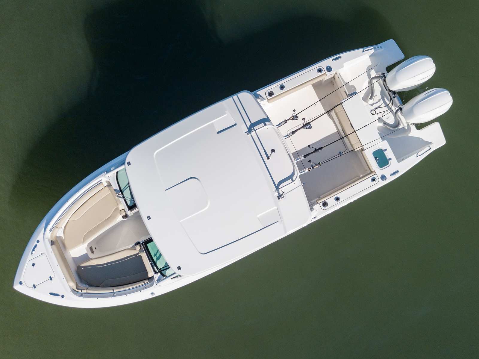 This dual console boat for sale is as practical as it is luxurious. The ample storage options ensure you have plenty of space for gear, water toys, and personal items, keeping the deck clutter-free and organized. The efficient twin Yamaha engines offer impressive fuel economy for their class, so you can spend more time on the water and less time at the fuel dock. Docking and maneuvering are a breeze thanks to the advanced joystick control and electronic steering, making the DC 266 an excellent choice for boaters of all experience levels.The stowable sunshades and versatile seating configurations allow you to quickly adapt the boat to your needs, whether you’re seeking shade, sun, or extra space for guests. The hardtop-mounted rod holders keep your fishing gear secure and ready for action, while the LED accent lighting adds a touch of elegance and safety during evening outings.