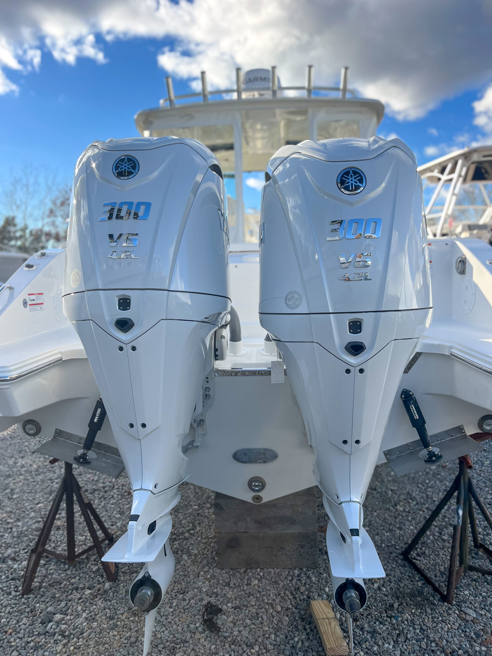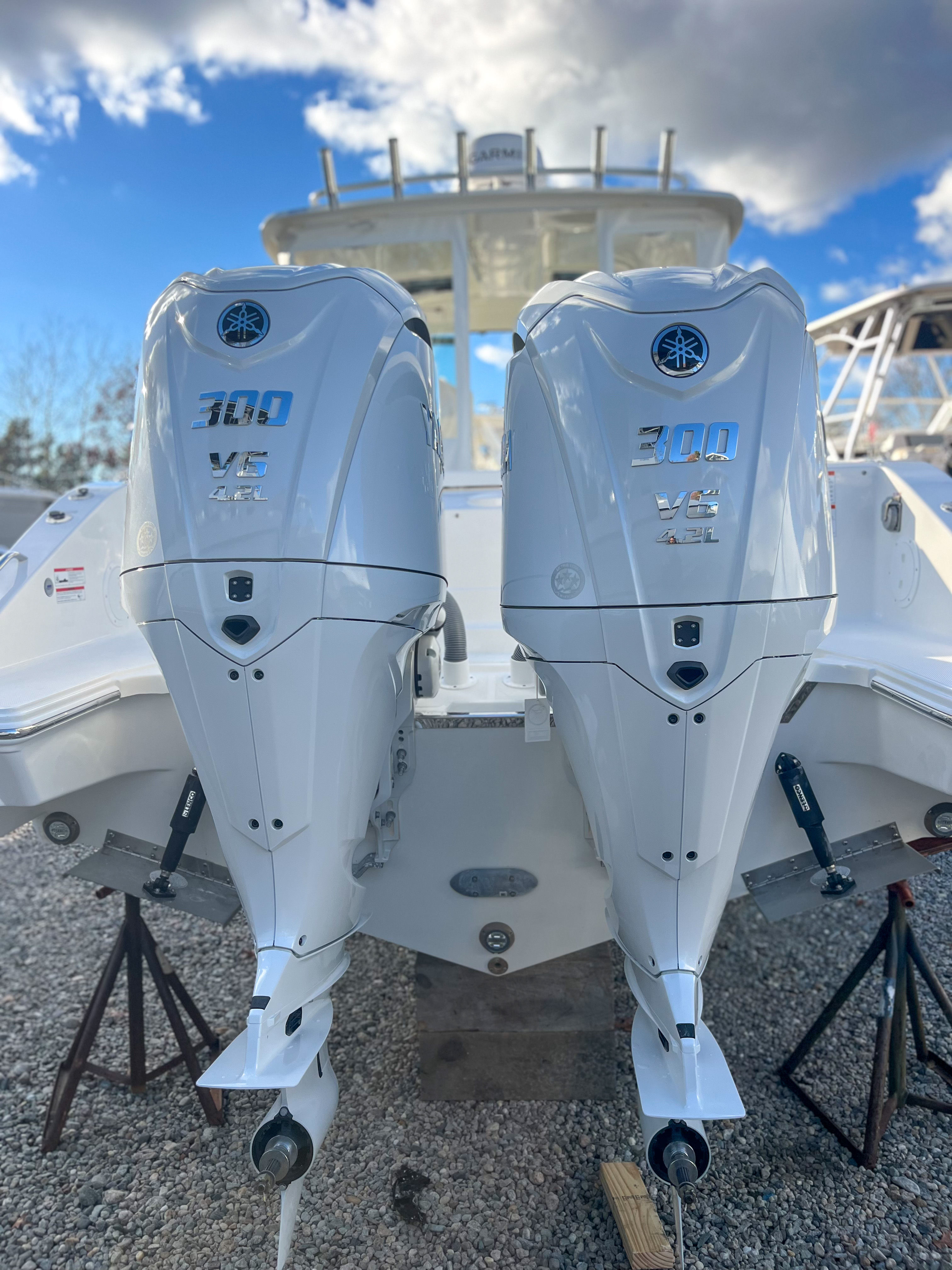 - Twin Yamaha® Digital F300 V6 Offshore (Pearlescent White) w/Integrated Digital Electric Steering (DES) and Helm Master® EX Digital Electronic Control (DEC) (does not include joystick control), Multifunction Display Interface and Manual Engine Flushing System