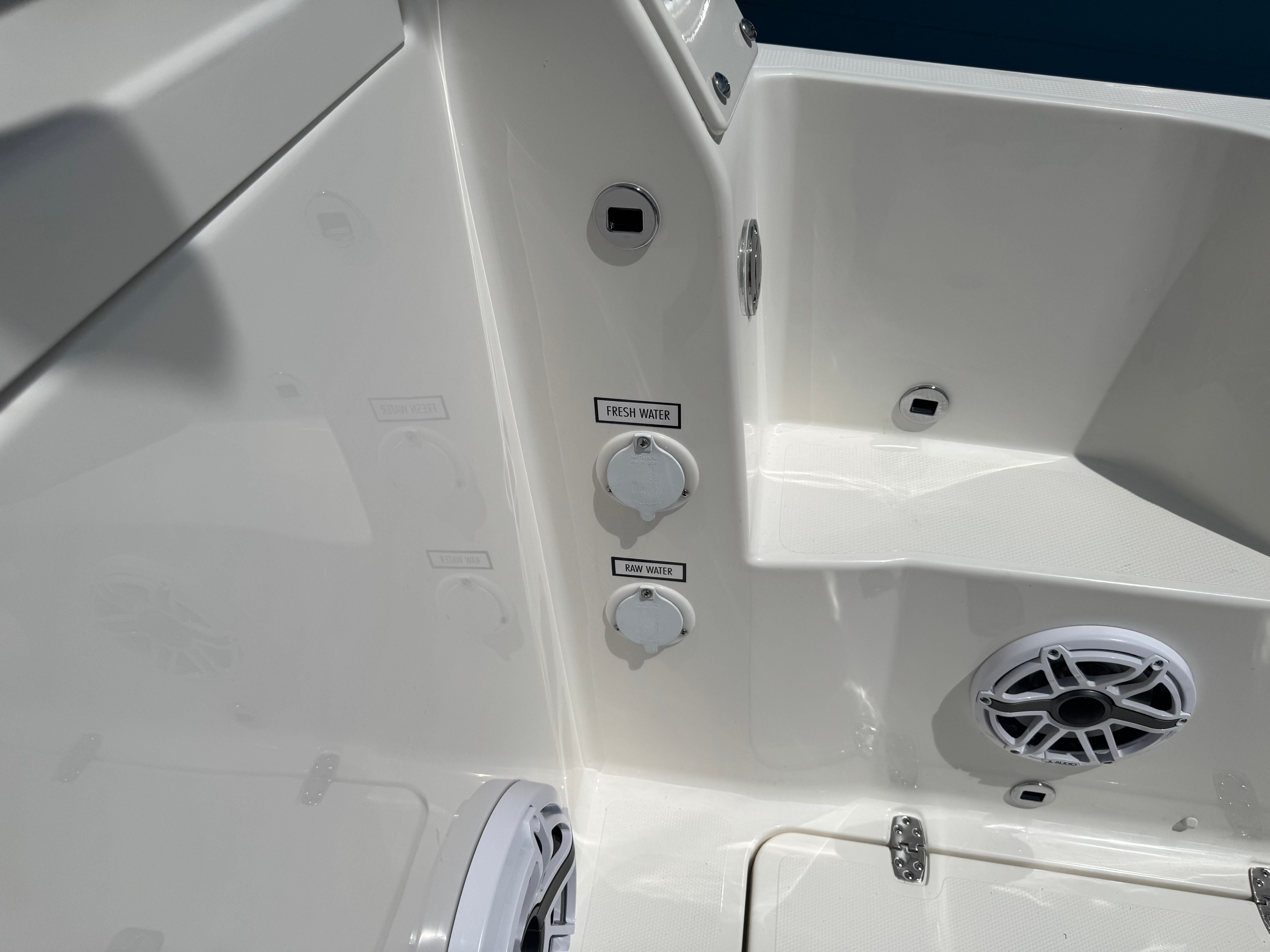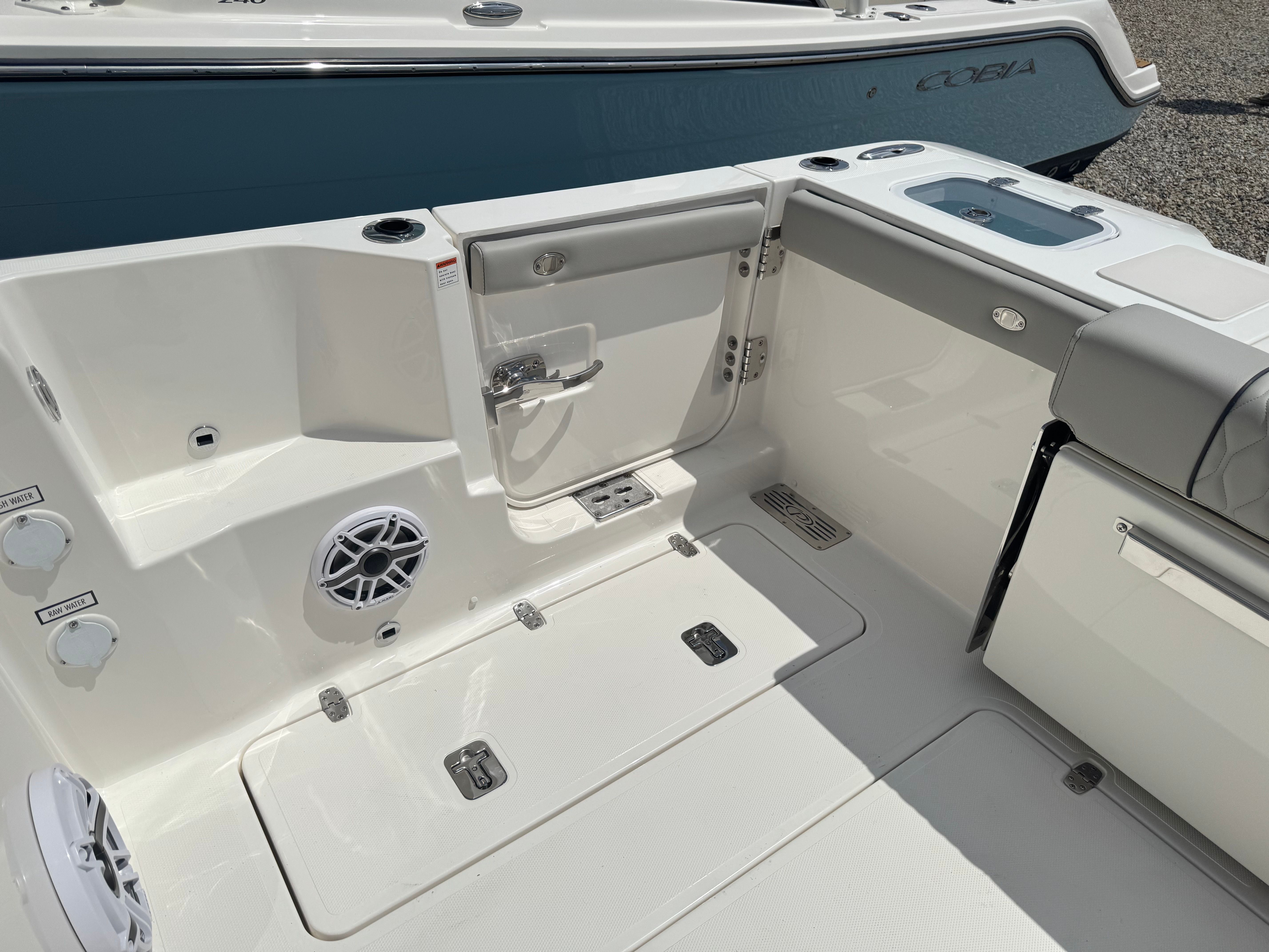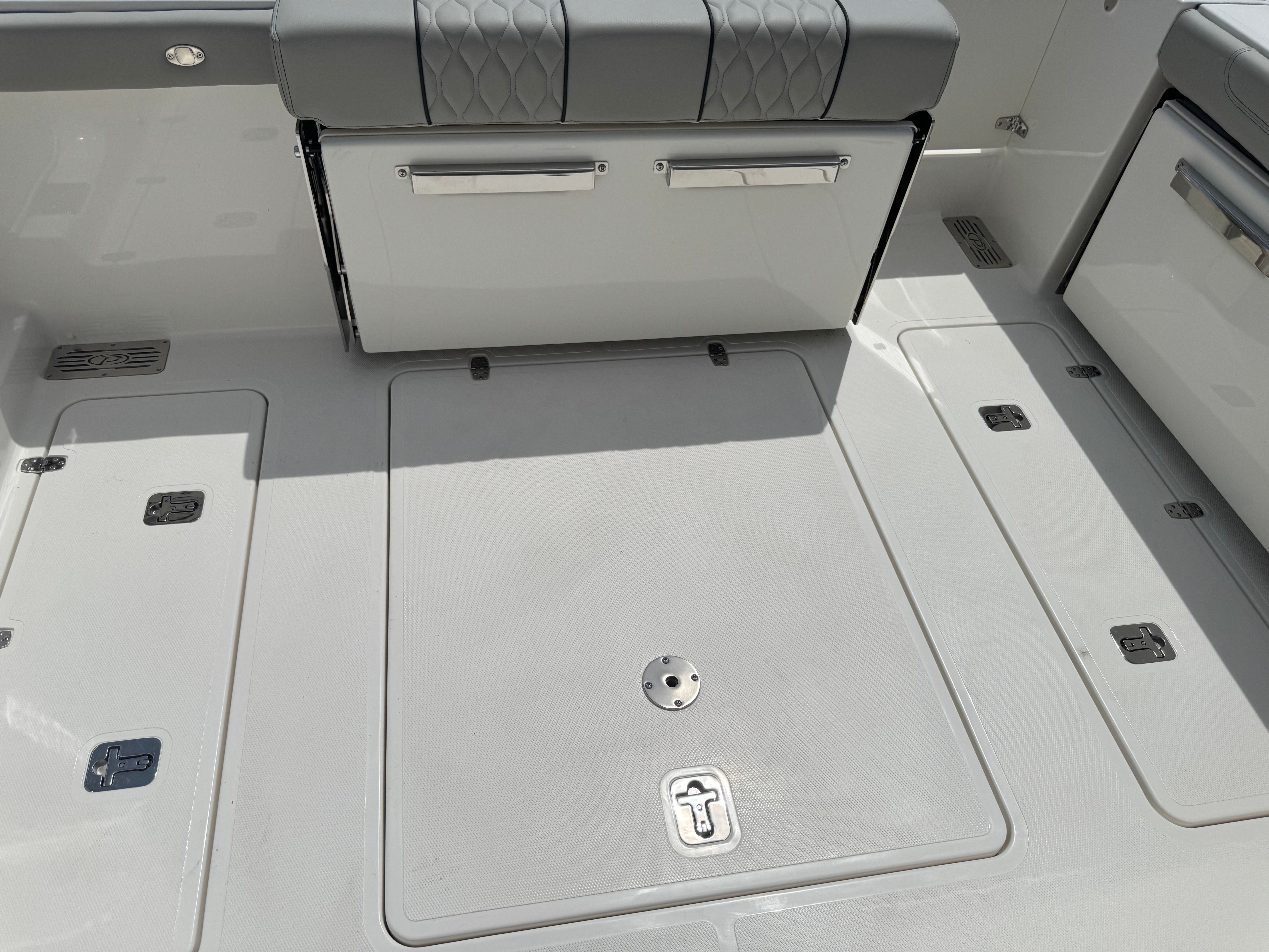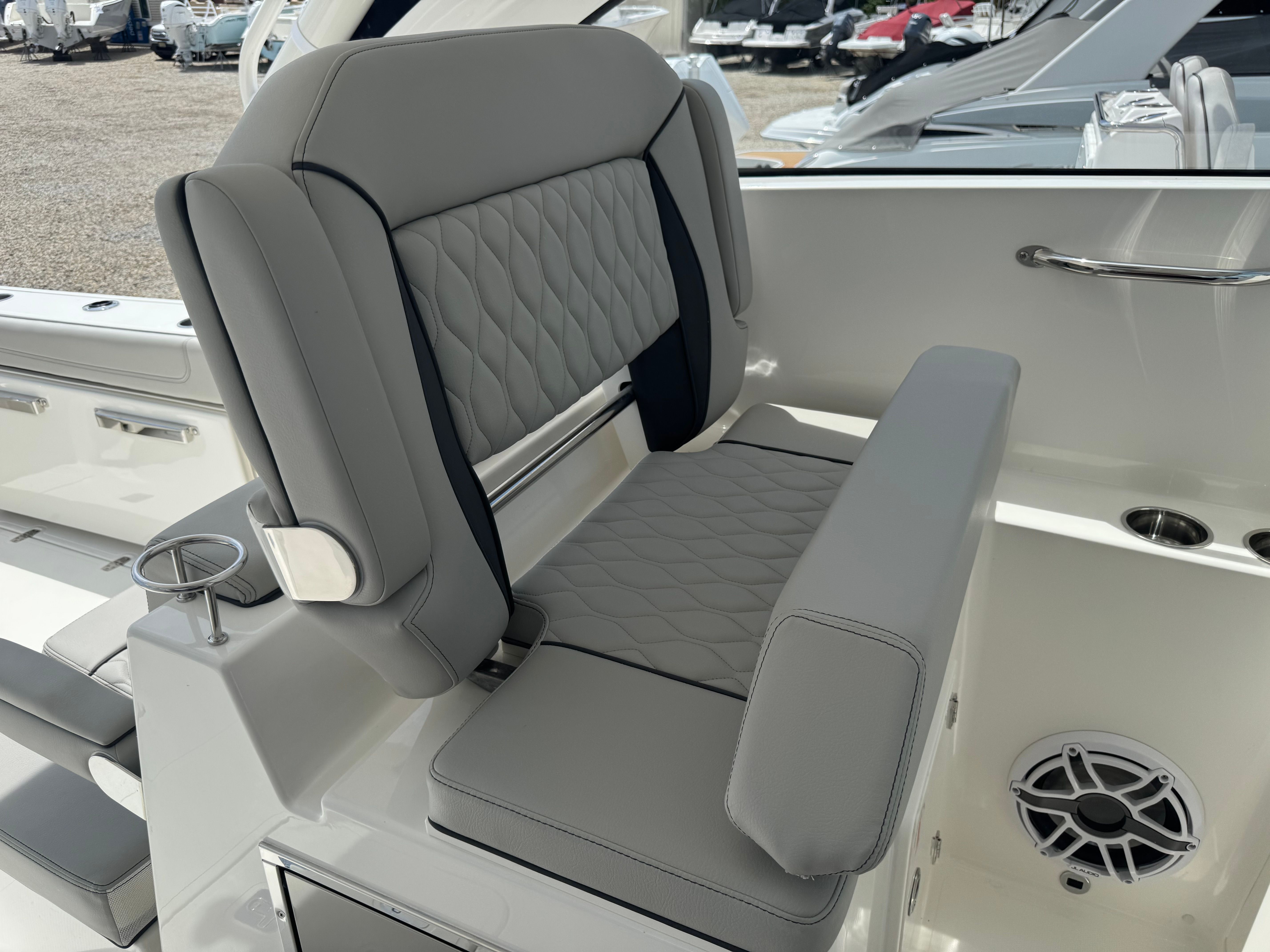 The Pursuit DC 306 is loaded with premium features designed to enhance your boating lifestyle. The multifunction display interface puts navigation and system controls at your fingertips, allowing you to monitor and manage every aspect of your journey with ease. The 120V/60Hz 30 Amp dockside power with cord ensures you have reliable shore power for all your onboard needs, from charging devices to running appliances.For those who love to entertain, the DC 306 offers a premium stereo upgrade featuring JL Audio components, including a custom-tuned 6-channel DSP amplifier, subwoofer, four M6 Sport speakers with blue backlighting, and an external antenna. The Sirius receiver, complete with a three-month subscription, ensures you have access to your favorite music and entertainment wherever you go.Ambiance is elevated with three all-color Sea Blaze Quattro Spectrum underwater lights, creating a captivating glow beneath the waterline for evening cruises or dockside gatherings. The bow table, which converts into a sun pad with a cushion, provides versatile seating and lounging options for guests. The 12V 2.3 cubic foot stainless steel refrigerator/freezer (replacing the standard tackle storage) offers convenient cold storage for refreshments and snacks, making it easy to keep everyone comfortable and satisfied during long days on the water. The fiberglass cockpit table with dedicated storage adds another layer of functionality, ensuring you have space for dining, games, or simply relaxing with friends and family.