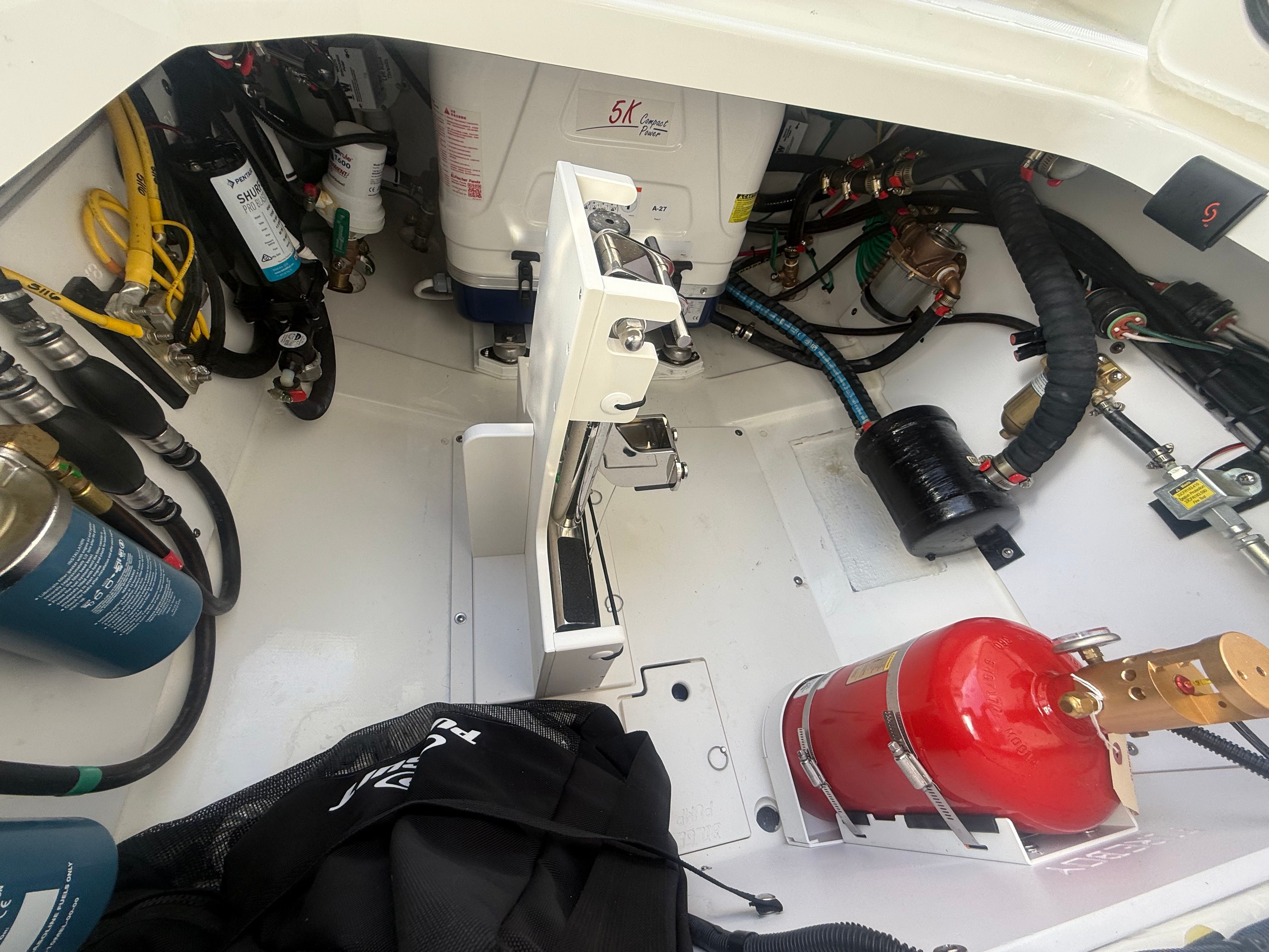 The Pursuit DC 326 is loaded with premium features designed to enhance your time on the water. The hull side in fresh white and the black bootstripe create a striking visual appeal, while the black canvas provides both style and protection. The carbon-finished helm is ergonomically designed for optimal control and visibility, ensuring a comfortable and commanding position at the wheel. The Sea Salt and Tranquil Sea upholstery not only looks stunning but also offers plush seating for you and your guests.For those who love to entertain, the 110V/60Hz cockpit grill with a drip pan is perfect for preparing delicious meals right on board. The onboard generator ensures you have reliable power for all your electrical needs, while the 12V, 1.7 cu. ft. cooler with a chill plate under the aft-facing seat keeps your beverages and snacks perfectly chilled throughout the day. The air conditioning package provides a cool and comfortable environment, even on the hottest summer days, making every outing a pleasure.