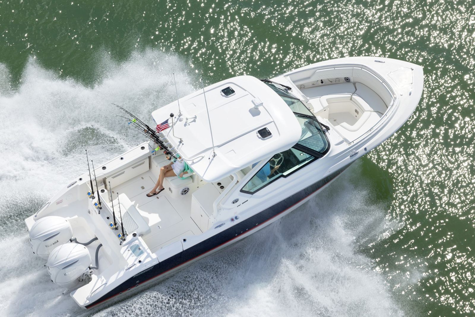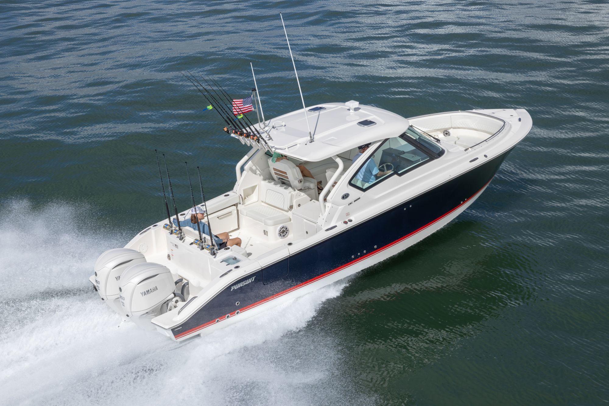 Owning the Pursuit DC 326 means embracing a lifestyle of fun, relaxation, and adventure. The spacious dual console layout offers plenty of seating and open areas for family and friends to gather, ensuring everyone has room to enjoy the ride. The Tranquil Sea interior creates a serene environment, perfect for unwinding after a day of excitement. The advanced Yamaha® engine systems and joystick control make handling the boat a breeze, even for those new to boating, while the integrated technology ensures a safe and enjoyable experience every time you set out. The cooler with chill plate and teak table make entertaining effortless, allowing you to host memorable gatherings on the water. With the stowable sunshade, you can customize your comfort, enjoying sunny days or seeking shade as needed. The hardtop rod holders add versatility for fishing trips, making the DC 326 a true all-rounder for recreation and leisure.