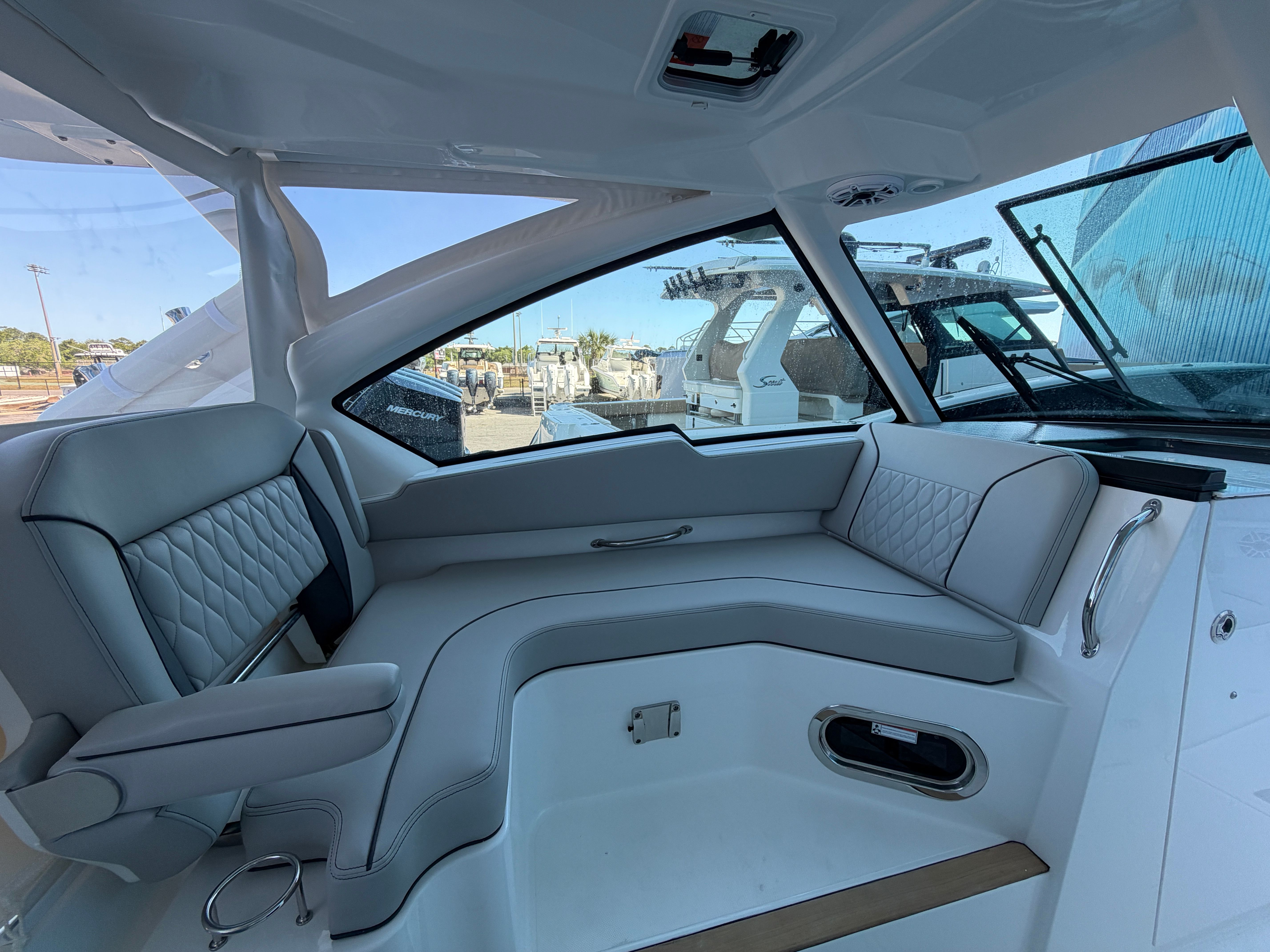 The Pursuit DC 326 is as practical as it is luxurious. The 12V cooler with chill plate keeps your food and drinks fresh, eliminating the need for bulky coolers and making it easy to entertain on the go. The bridgedeck teak table with storage offers a convenient place to enjoy meals or play games, while the ample seating ensures everyone has a comfortable spot to relax.Docking and maneuvering are made simple thanks to the responsive twin Yamaha engines, and the boat’s thoughtful design provides plenty of storage for gear, water toys, and personal items. The durable canvas and Stamoid covers protect your investment from the elements, while the carbon helm adds a touch of modern sophistication to the helm station. Every feature is designed to make ownership easy and enjoyable, so you can focus on making memories on the water.
