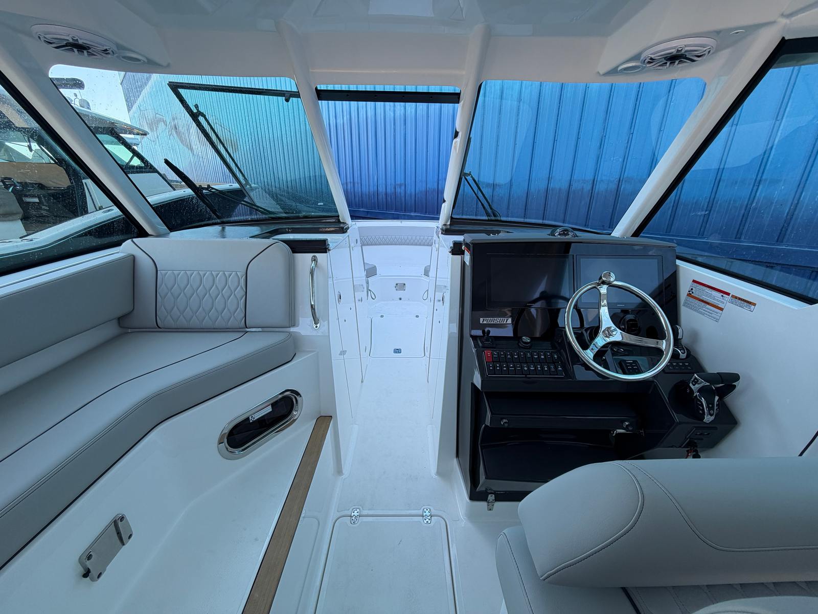 The Pursuit DC 326 is packed with special features designed to enhance your boating experience. Among its standout amenities is a 12V, 1.7 cu. ft. cooler with a chill plate conveniently located under the aft-facing seat, keeping your refreshments perfectly chilled throughout the day. The bow tonneau cover upgrade in white Stamoid provides added protection and style, while the Garmin Radar Dome GMR Fantom 24 offers advanced navigation and safety capabilities for confident cruising.Enjoy shade and comfort with the custom retractable Makefast sunshade, which operates with a simple touch, allowing you to easily adjust your environment as the sun moves across the sky. The aft curtain upgrade in white Stamoid adds another layer of protection from the elements, ensuring you and your guests stay comfortable in any weather. The navy canvas and carbon helm create a sophisticated and modern aesthetic, while the premium stereo upgrade delivers crystal-clear sound for your favorite music on the water.For those who appreciate fine craftsmanship, the bridgedeck teak table with storage is a luxurious touch, providing a perfect spot for dining or socializing. Every detail of the DC 326 is thoughtfully designed to maximize comfort, convenience, and enjoyment.