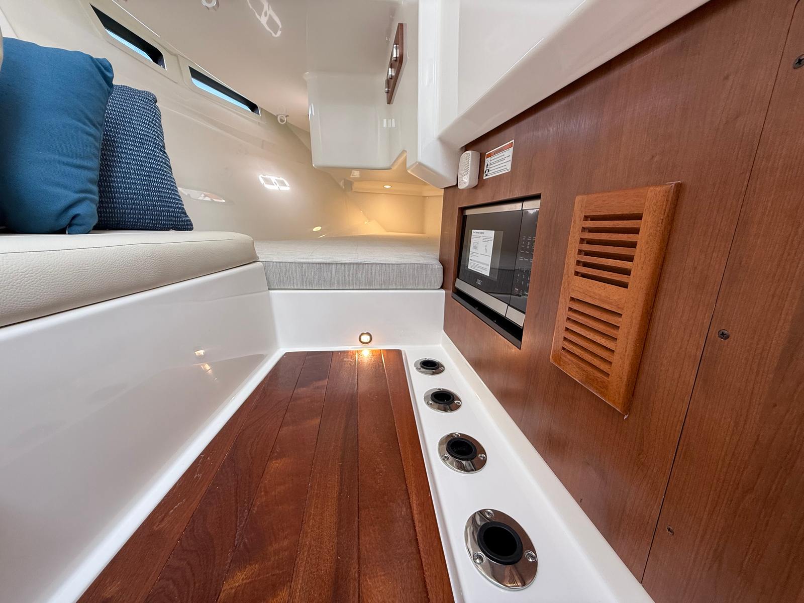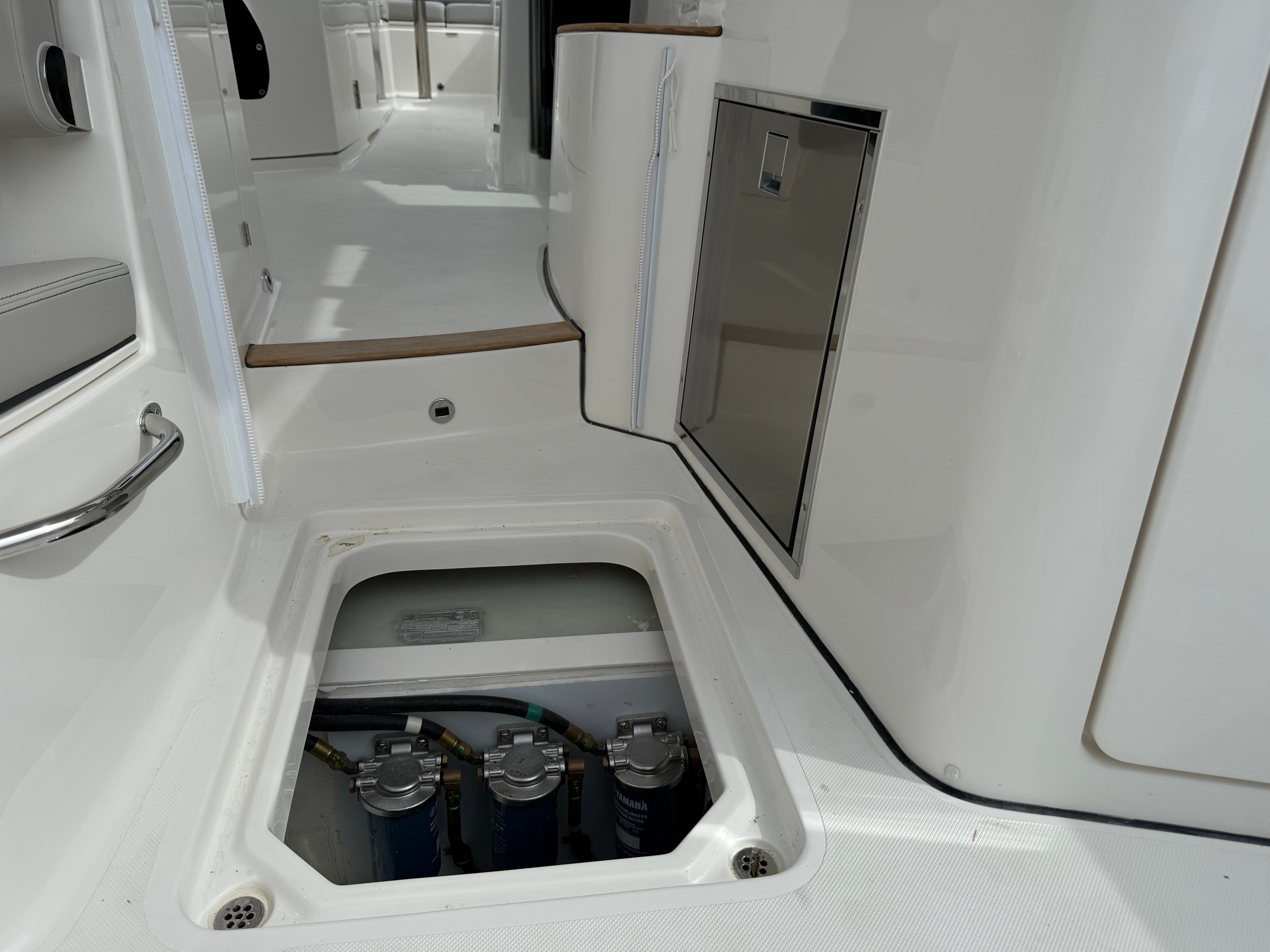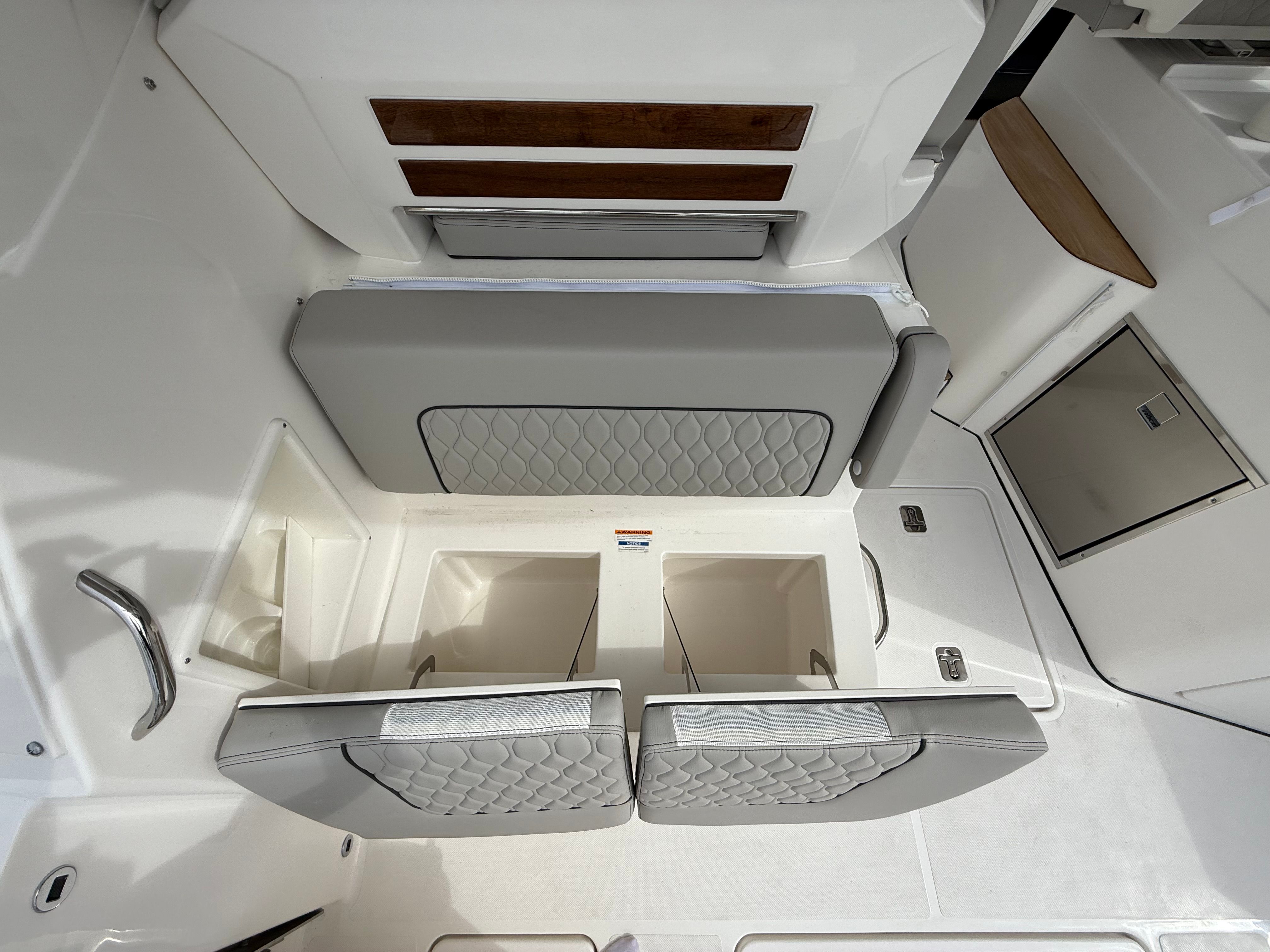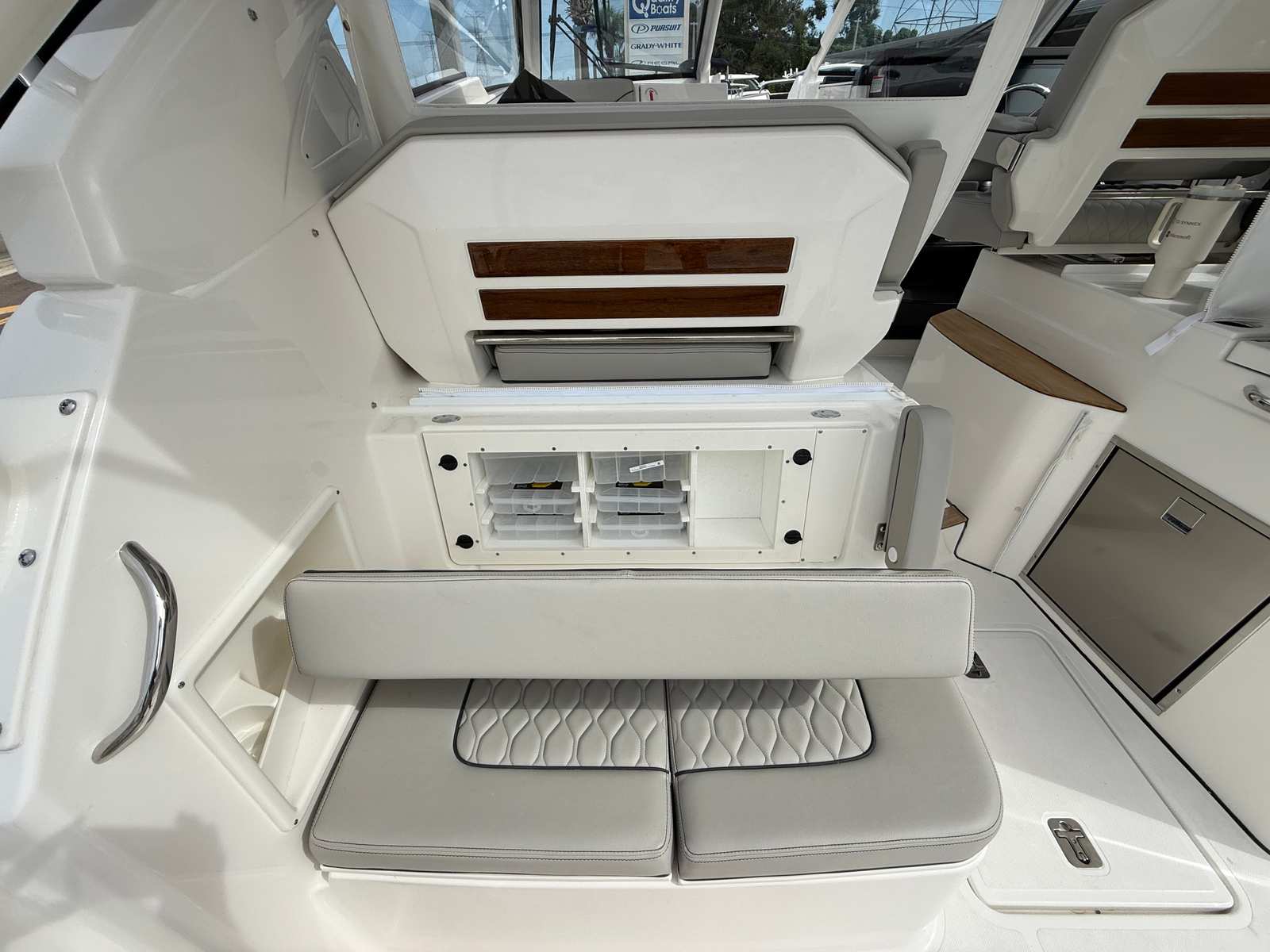 The Pursuit DC 365 is as practical as it is luxurious. Its generous length and smart layout offer ample storage for gear, supplies, and personal items, keeping the deck clutter-free and organized. Docking is simplified by the boat’s responsive handling and advanced navigation systems, making it easy to maneuver in tight spaces or busy marinas.Fuel efficiency is enhanced by the modern Yamaha engines, allowing you to spend more time on the water and less time refueling. The integrated tables and storage solutions make entertaining effortless, while the air-conditioned cockpit ensures comfort during long days at sea. Whether you’re planning a fishing trip, a family picnic, or a sunset cruise, the DC 365 adapts to your needs, providing a seamless and enjoyable boating experience.