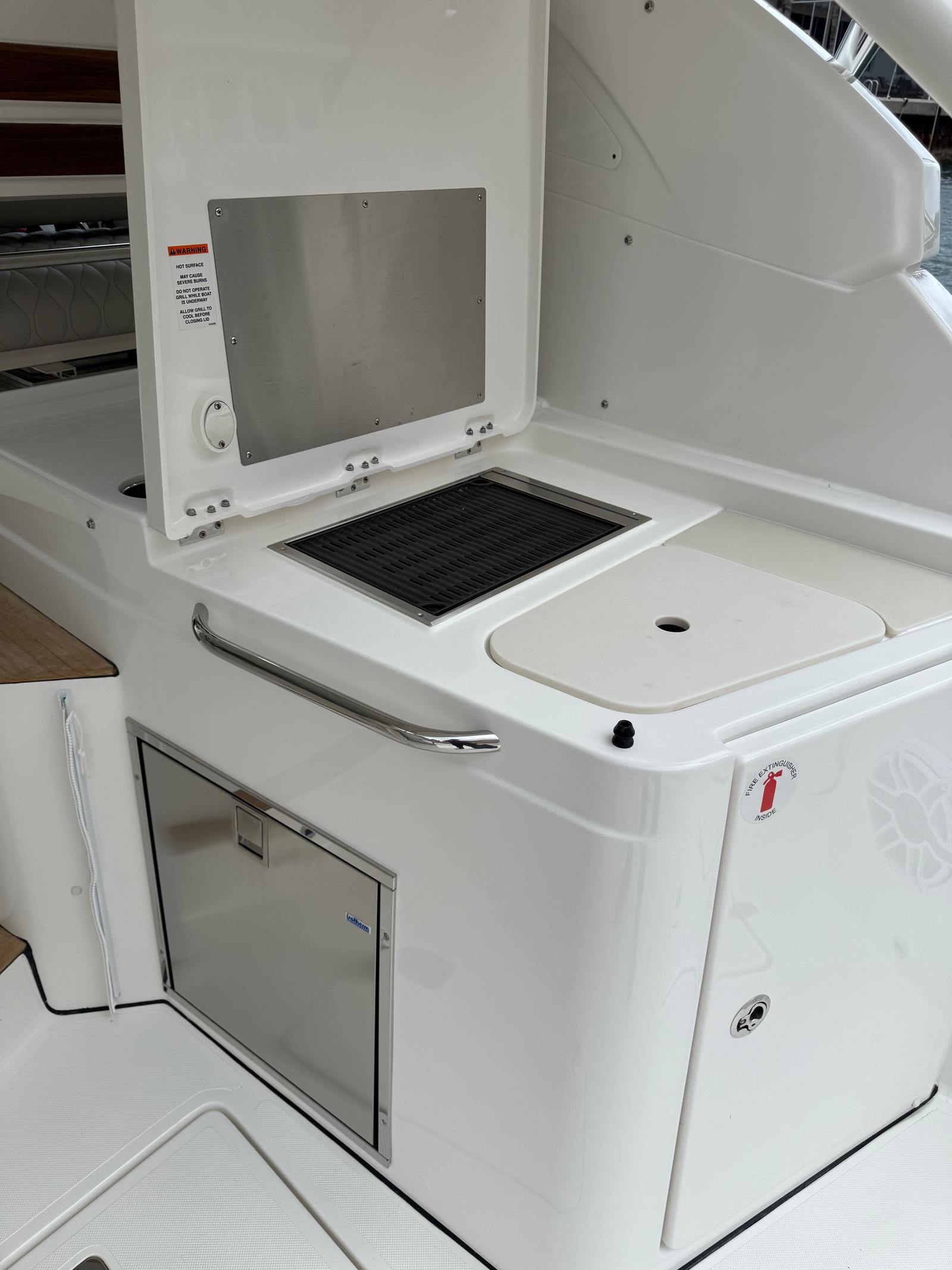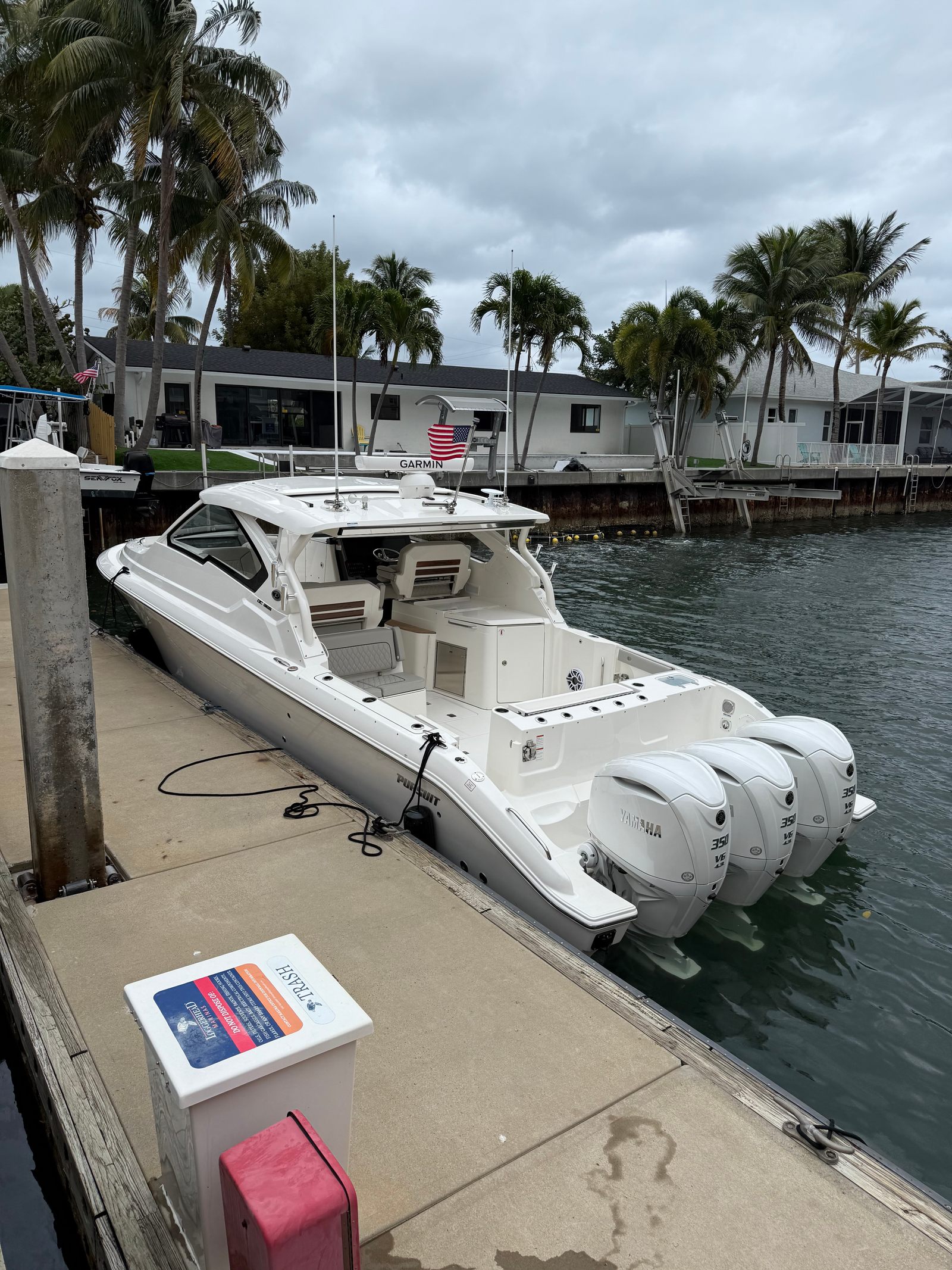 Practicality meets luxury in the Pursuit DC 365. Its generous length and well-designed layout offer ample storage for gear, supplies, and personal items, making it easy to keep your boat organized and clutter-free. The triple engine setup not only delivers impressive speed but also enhances maneuverability, making docking and navigating tight spaces a breeze. Fuel efficiency is optimized through advanced Yamaha engineering, allowing you to spend more time on the water and less time refueling.The hardtop-mounted LED spotlight ensures safe and easy docking after sunset, while the zone-controlled audio system lets you customize the listening experience in different areas of the boat. Whether you’re planning a weekend getaway or a spontaneous day trip, the Pursuit DC 365 is equipped to handle all your boating needs with style and ease.