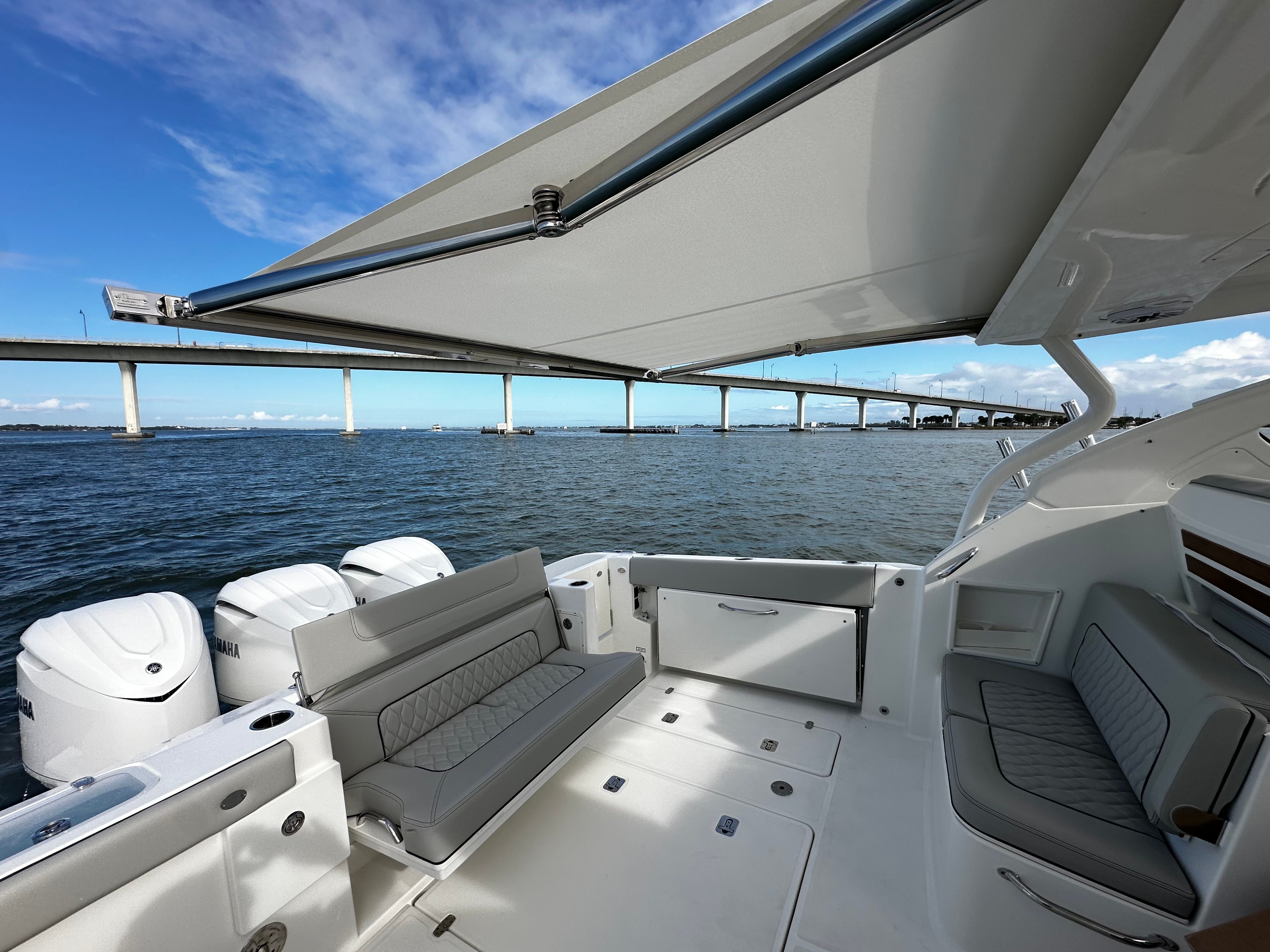 The Pursuit DC 365 is loaded with special features that enhance both functionality and enjoyment. The triple Yamaha Pearl White F350 engines not only provide impressive power but also add a touch of elegance to the boat’s overall aesthetic. The Seakeeper Gyro Stabilization System ensures a smooth and comfortable ride, making long days on the water more enjoyable for everyone on board. The hull’s fresh white color, complemented by the platinum boot stripe and accent, gives the boat a striking appearance that’s sure to impress.Inside, the Tranquil Sea interior package creates a relaxing and upscale environment, perfect for unwinding after a day of adventure. The cockpit is equipped with air conditioning, ensuring comfort even on the hottest days. The helm features a hardtop-mounted LED spotlight for enhanced visibility during nighttime excursions, while all color spectrum underwater lights add a dramatic and customizable ambiance to your evenings on the water. The upgraded amplifier and speakers with zone control and Sirius capability provide premium sound quality, allowing you to set the perfect mood for any occasion.