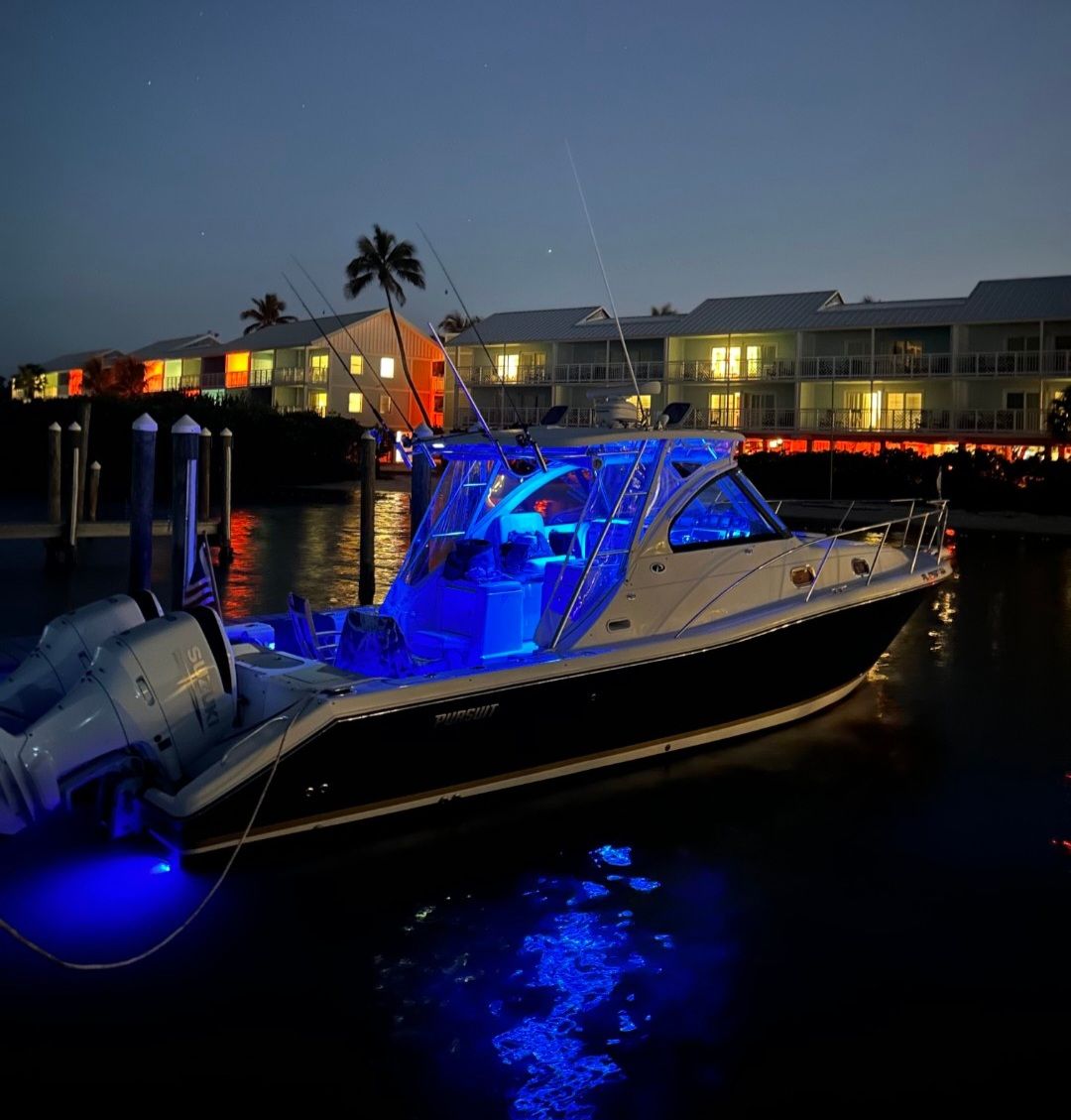Fishing/Cockpit: 45-gallon live well, insulated fish box with macerator, bait prep station, tackle storage, and transom door.