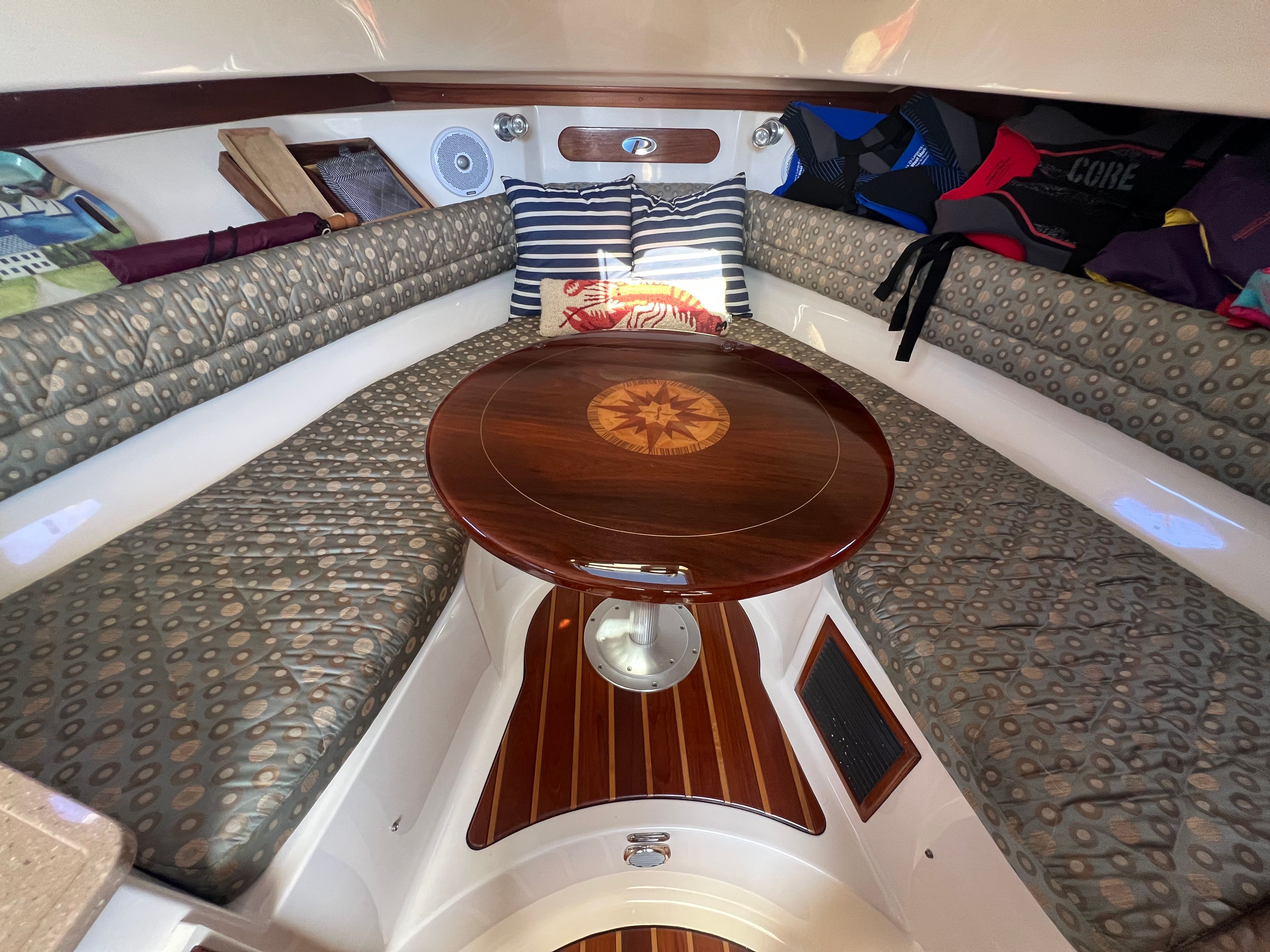 Seating: Port-side L-lounge; Fold-away transom bench seat; Deluxe helm seat with flip-up bolster.