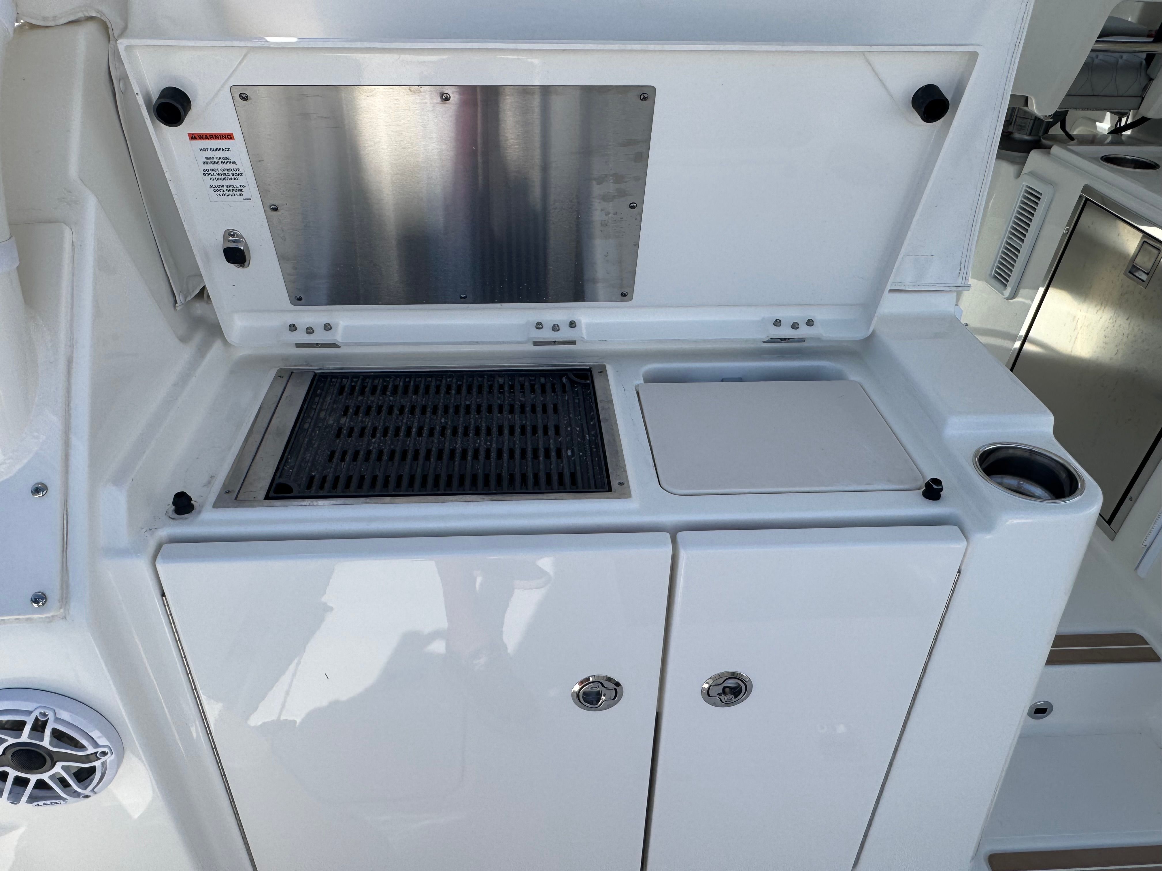 Practicality is at the core of the Pursuit OS 325’s design. The Yamaha Joystick Control with Set Point and Autopilot makes docking and maneuvering in tight spaces a breeze, reducing stress and increasing confidence for captains of all experience levels. The dedicated storage for the teak table ensures that your deck remains uncluttered, while the stowable sunshade can be easily deployed or stored as needed.The air conditioning systems in both the cabin and cockpit provide relief on hot days, making overnight stays or long cruises more enjoyable. The thoughtfully arranged seating and ample storage options make it easy to bring along everything you need for a day of fishing, swimming, or simply relaxing on the water. The Pursuit OS 325 is designed to make every aspect of boat ownership easier and more enjoyable, from maintenance to maneuverability.