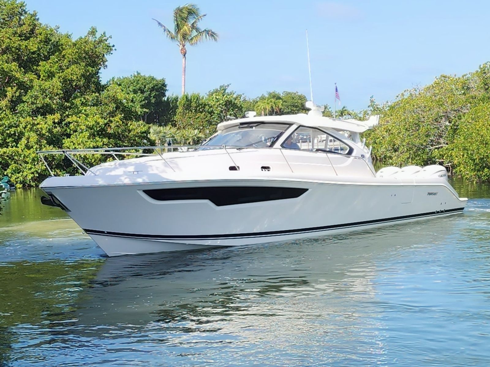 The Pursuit OS 405 is as practical as it is luxurious. Its 43-foot length provides ample storage for gear, water toys, and provisions, making it ideal for extended trips or spontaneous outings. The intuitive helm layout, enhanced by dual Garmin widescreen displays, simplifies navigation and monitoring, allowing you to focus on enjoying your time on the water. Docking and maneuvering are made easier with the responsive triple-engine configuration, giving you confidence in tight spaces and busy marinas. The protective Stamoid curtains and sunpad cover help safeguard your investment and keep the boat looking pristine, season after season.