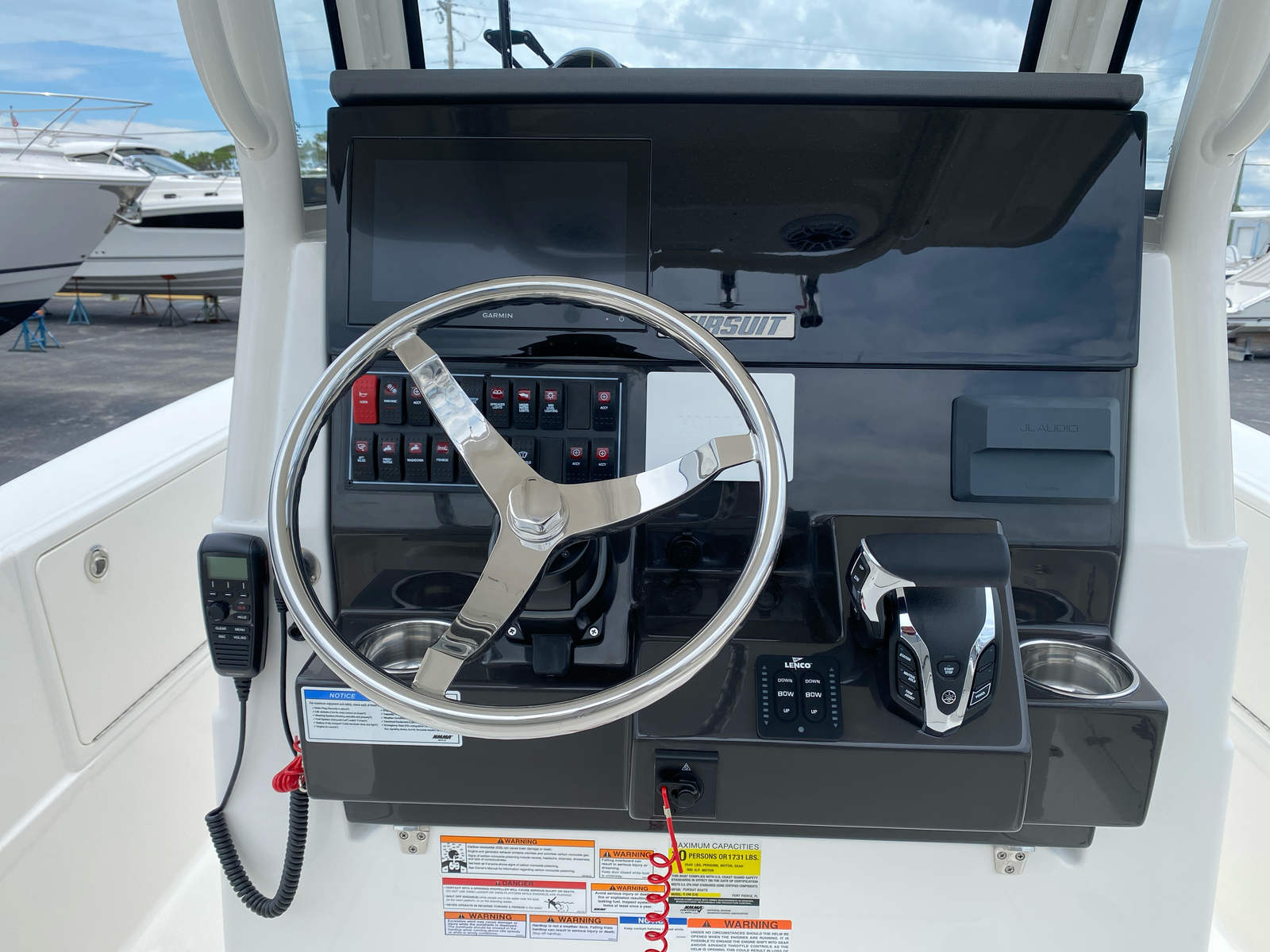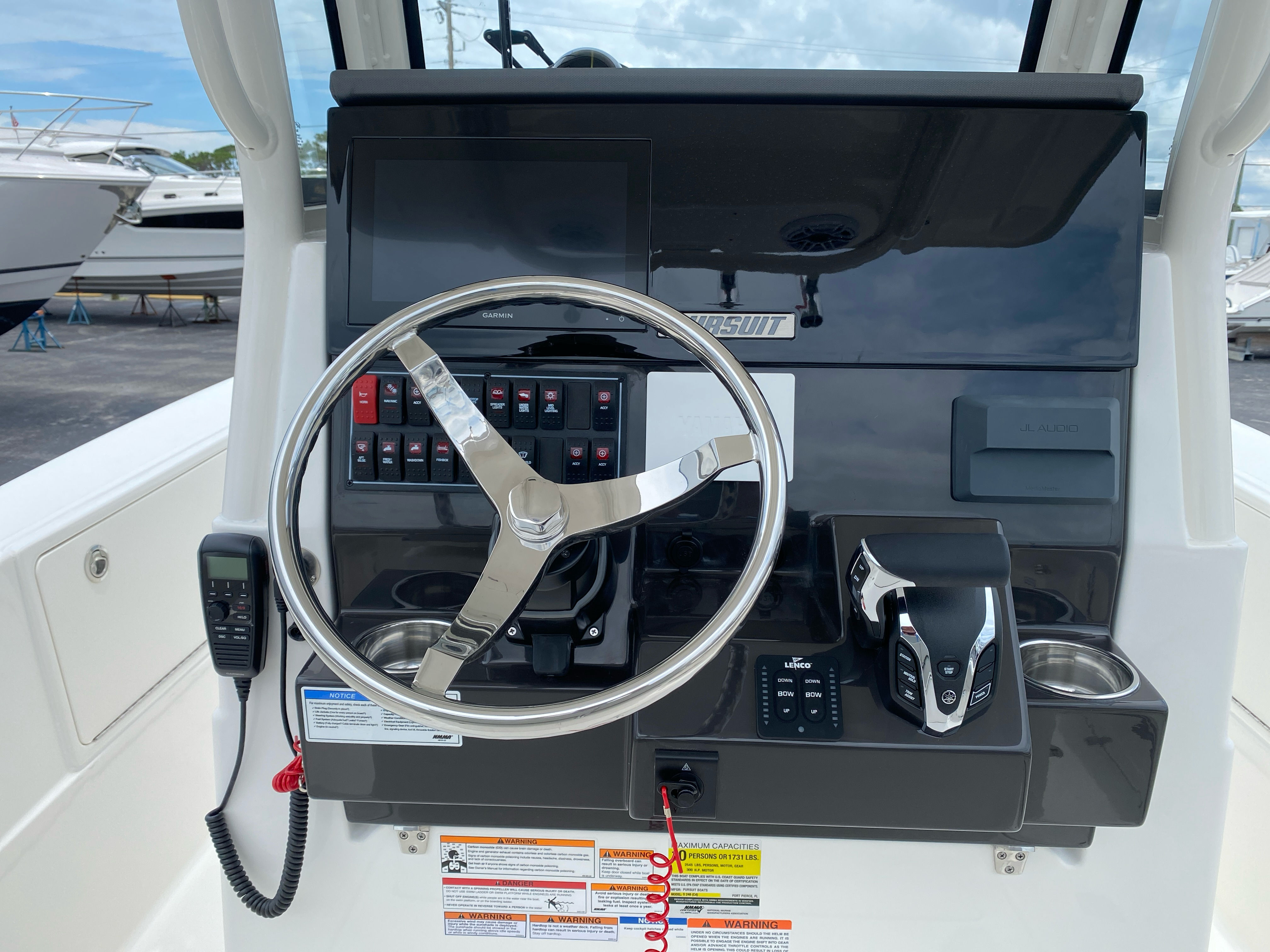 The 2026 Pursuit S 248 is packed with premium features that elevate your boating experience. Enjoy the convenience of the upgraded electric forward head and holding tank, offering modern comfort and privacy for extended trips. The black leaning post cover not only protects your seating but also adds a stylish accent to the cockpit. Relax on the forward poly sunpad filler and cushion, perfect for soaking up the sun or lounging with friends and family.Anchoring is effortless with the anchor windlass add-on, allowing for quick and secure mooring in your favorite spots. As the sun sets, the underwater lights—three all-color Sea Blaze Quattro Spectrum units—illuminate the water beneath, creating a mesmerizing ambiance for evening cruises or dockside gatherings.Music lovers will appreciate the stereo premium upgrade, featuring a custom-tuned 6-channel DSP amp, two 8-inch subwoofers, and six 6.5-inch JL Audio speakers with upgraded sport grills and blue backlighting. The system includes SiriusXM with an external antenna and a three-month subscription, ensuring your favorite tunes are always on deck. The fresh water system, complete with an aft cockpit shower and a 20-gallon tank, adds a touch of convenience for rinsing off after a swim or cleaning up after a day of fishing.