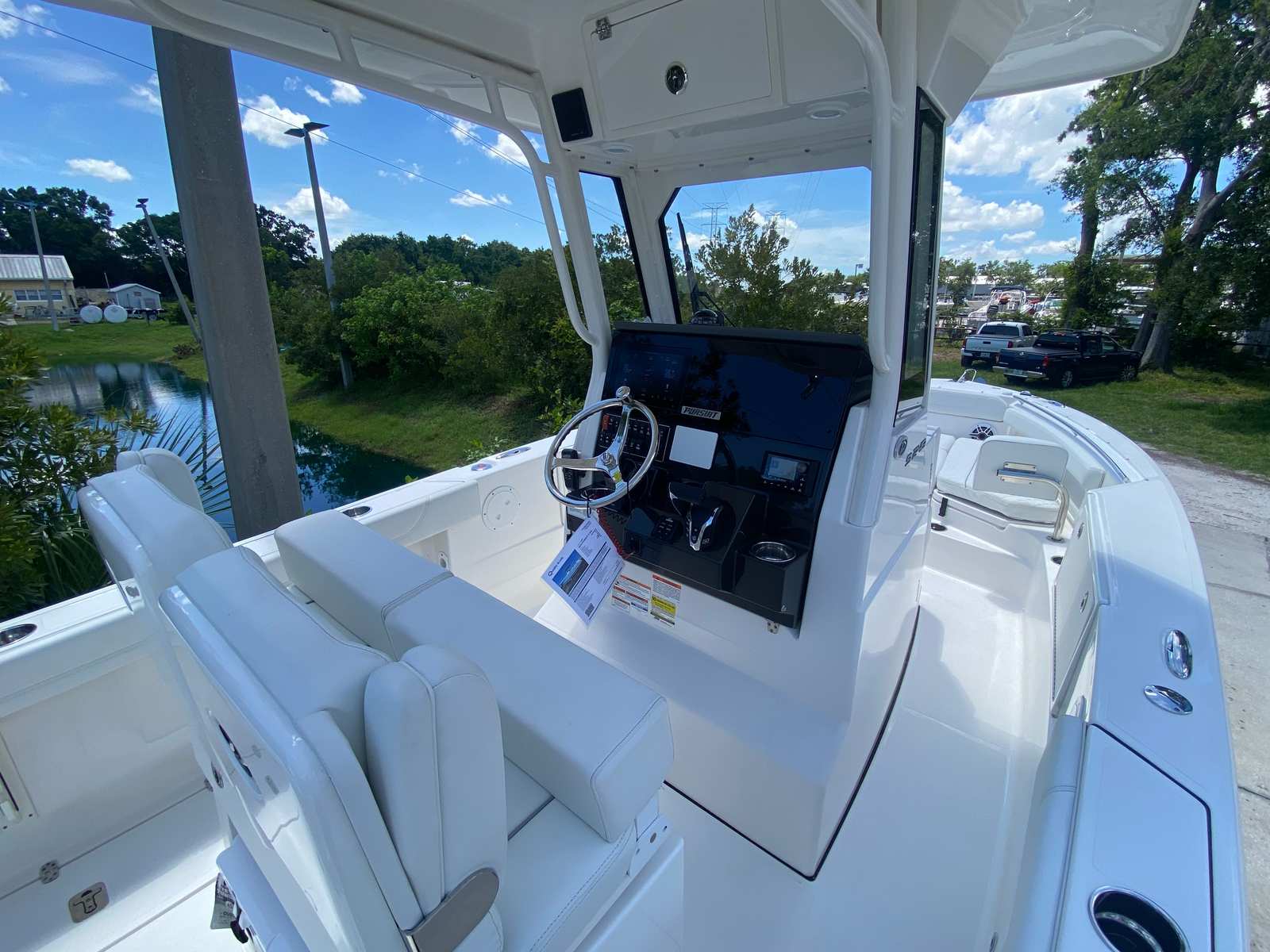 The Pursuit S 248 is packed with premium features that enhance both functionality and comfort. One of the standout amenities is the forward Med style sunshade, which is stowable and crafted by Suntex, providing excellent protection from the sun while maintaining an open and airy feel on deck. The bow seating area is equipped with port and starboard backrests, offering plush comfort for lounging or socializing with friends and family.A standard hardtop with select canvas options ensures you are shielded from the elements, while the hardtop liner in fresh white adds a touch of elegance to the overall design. The fresh potable water system, complete with an 18-gallon tank, ensures you have access to clean water for rinsing off or staying hydrated during long days on the water.For those who appreciate advanced technology, the Pursuit S 248 features a Garmin widescreen 12-inch display package, providing intuitive navigation and real-time data at your fingertips. The console is further enhanced with a stainless steel portlight, adding both style and ventilation. The cadet gray instrumentation cover protects your controls and electronics, keeping them in pristine condition.Entertainment is taken to the next level with a premium stereo system, amplifier, and speakers, complete with Sirius satellite radio capability. Blue LED accent lights at mid-level (four in total) create a sophisticated ambiance for evening cruises or dockside gatherings.