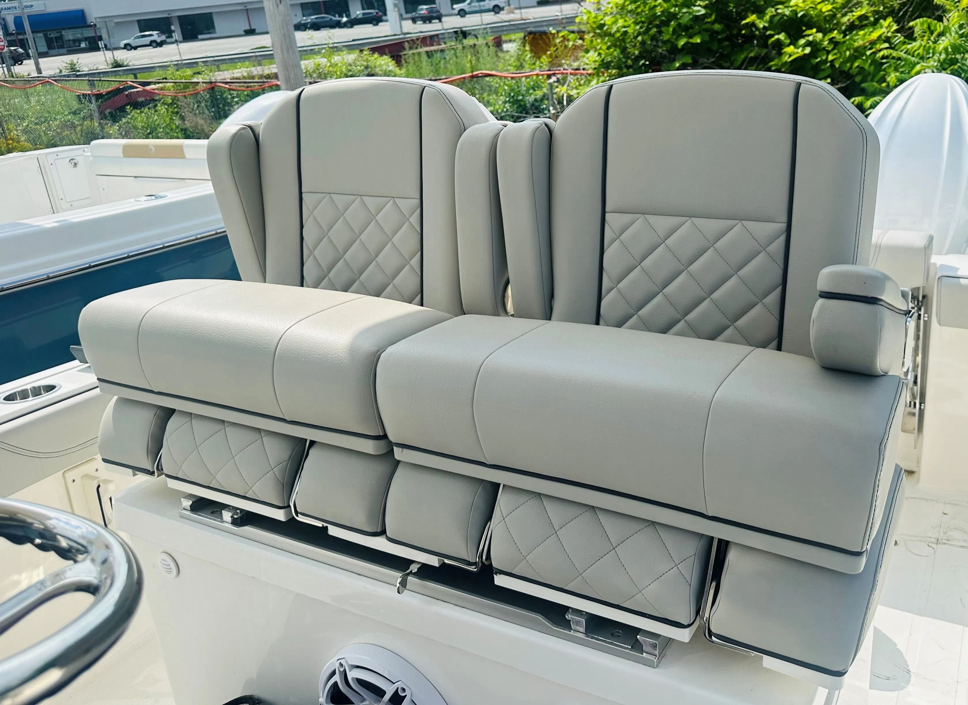 - Premium Helm Seating w/Four (4) Folding Armrests, Articulating Flip-up Bolsters, Upgraded Seat Slide with Fore/Aft Adjustments, and Edson® 316L SS Steering Wheel with Control Knob and Non-Slip Grip