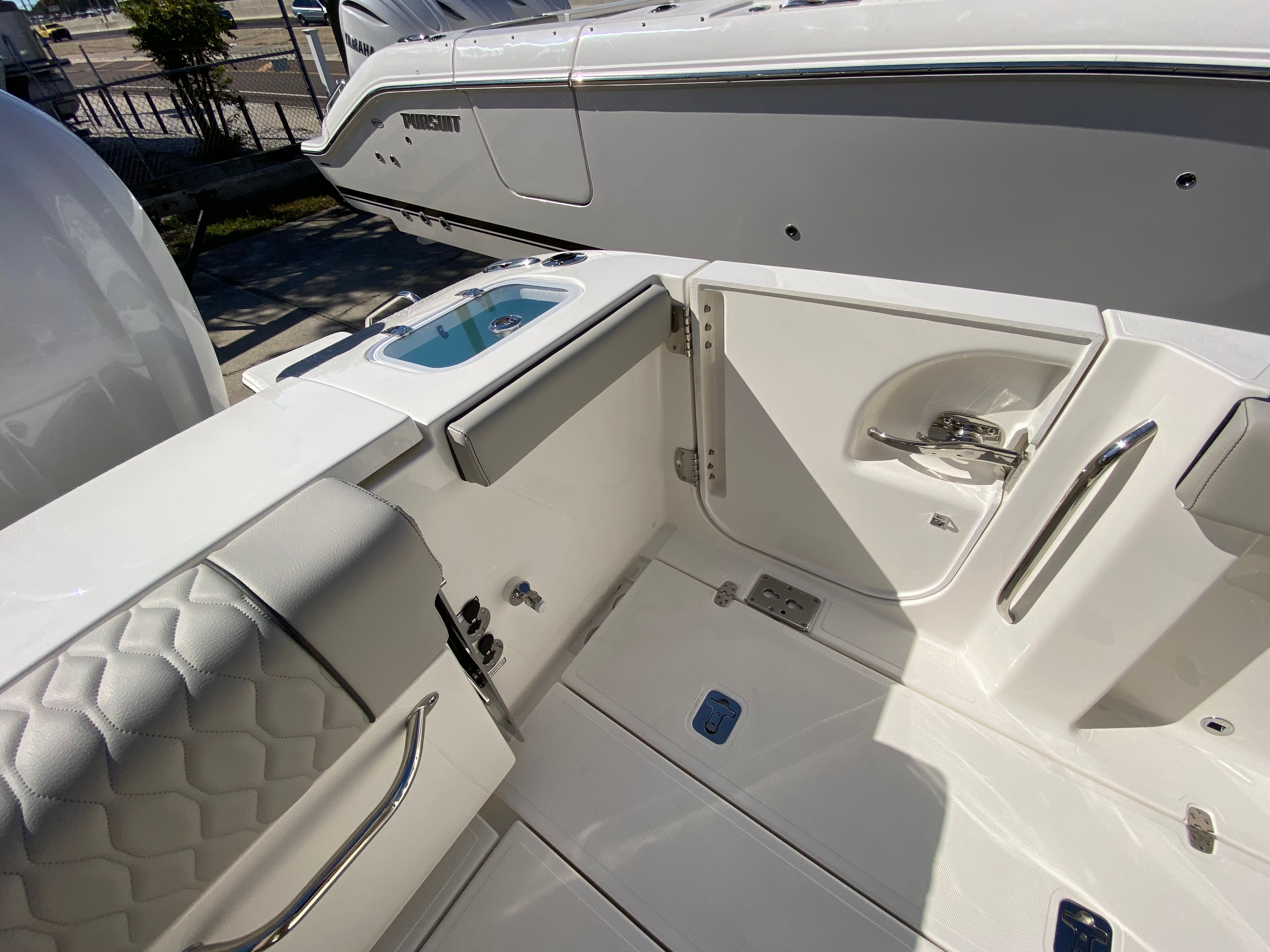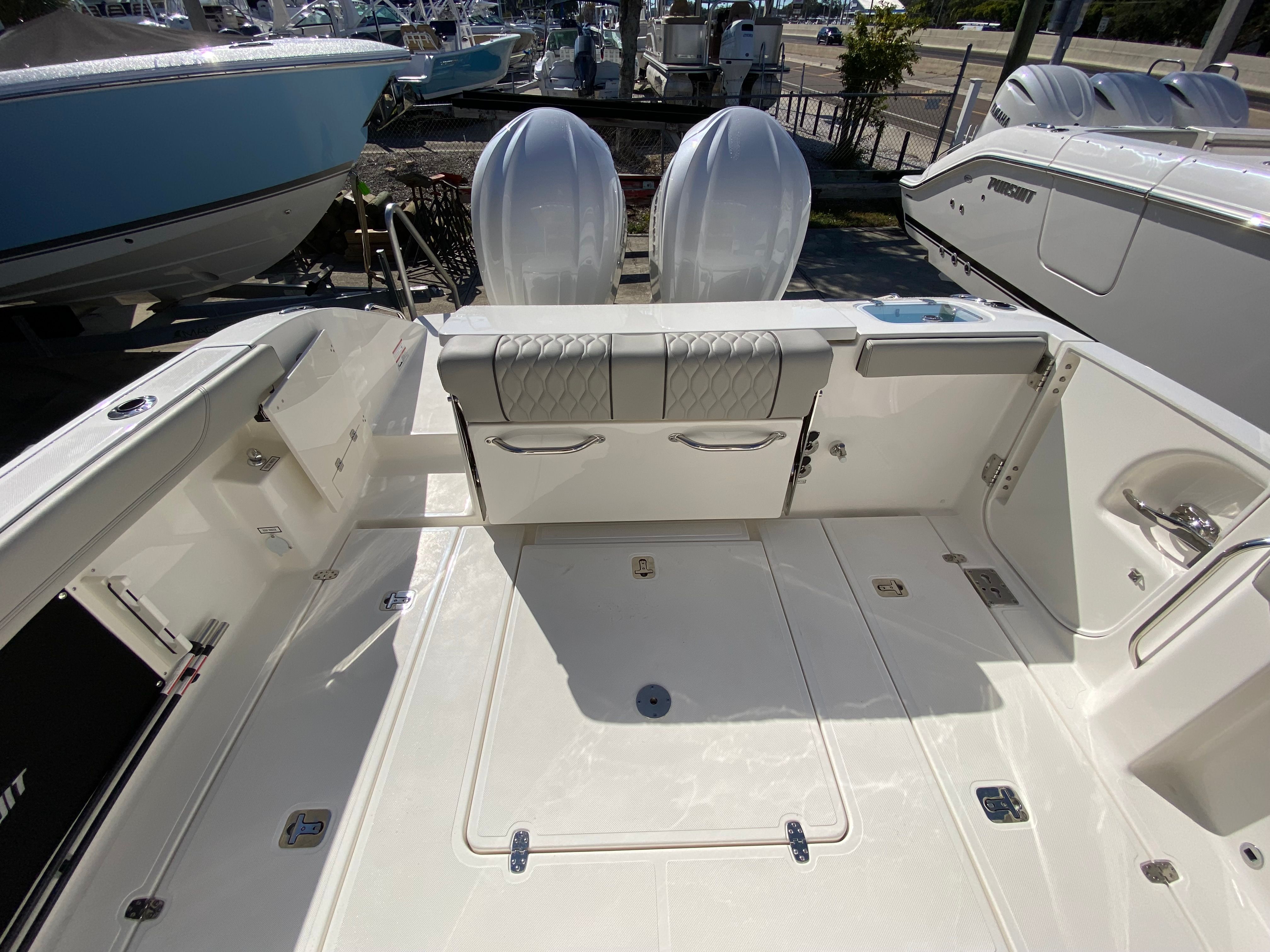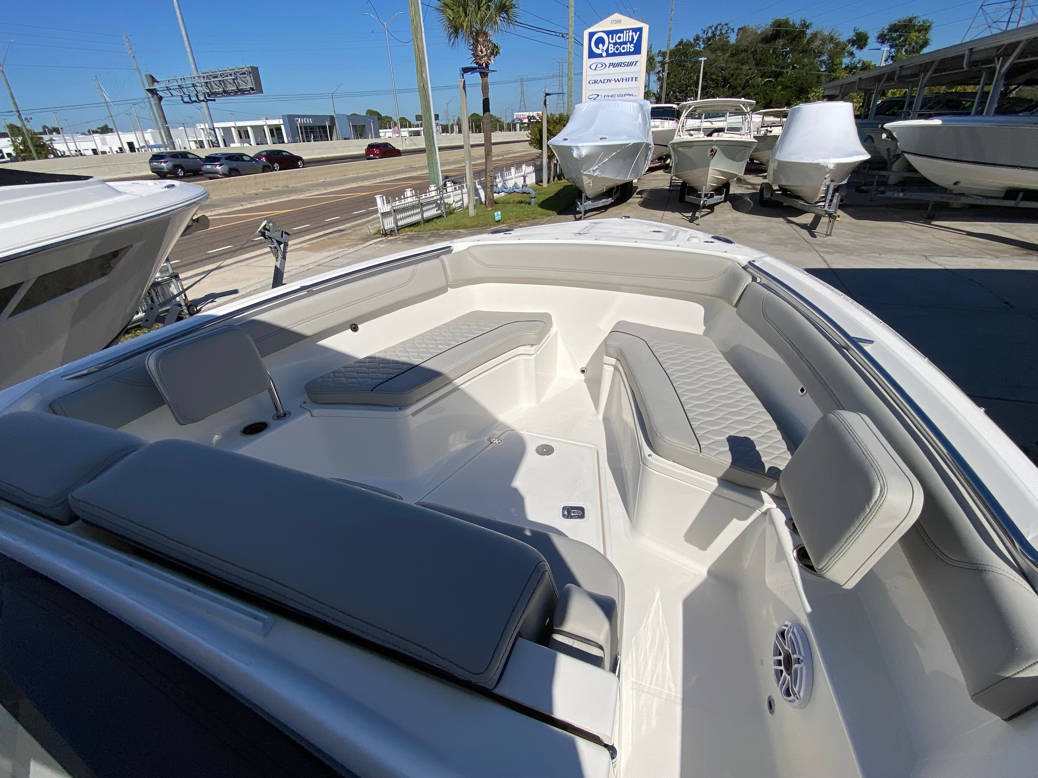 The Pursuit S 288 is as practical as it is stylish. The center console design provides excellent visibility and easy access to all areas of the boat, making it ideal for both novice and experienced boaters. The joystick control system simplifies docking, even in challenging conditions, while the side door boarding ladder ensures that everyone can get on and off the boat safely.Storage solutions are thoughtfully integrated throughout the boat, including dedicated space for the cockpit table and sunshade. The efficient layout allows you to bring along all the gear and supplies you need for a day on the water without sacrificing comfort or mobility. The combination of performance, maneuverability, and user-friendly features makes the S 288 a smart choice for anyone seeking a versatile and reliable center console boat for sale.