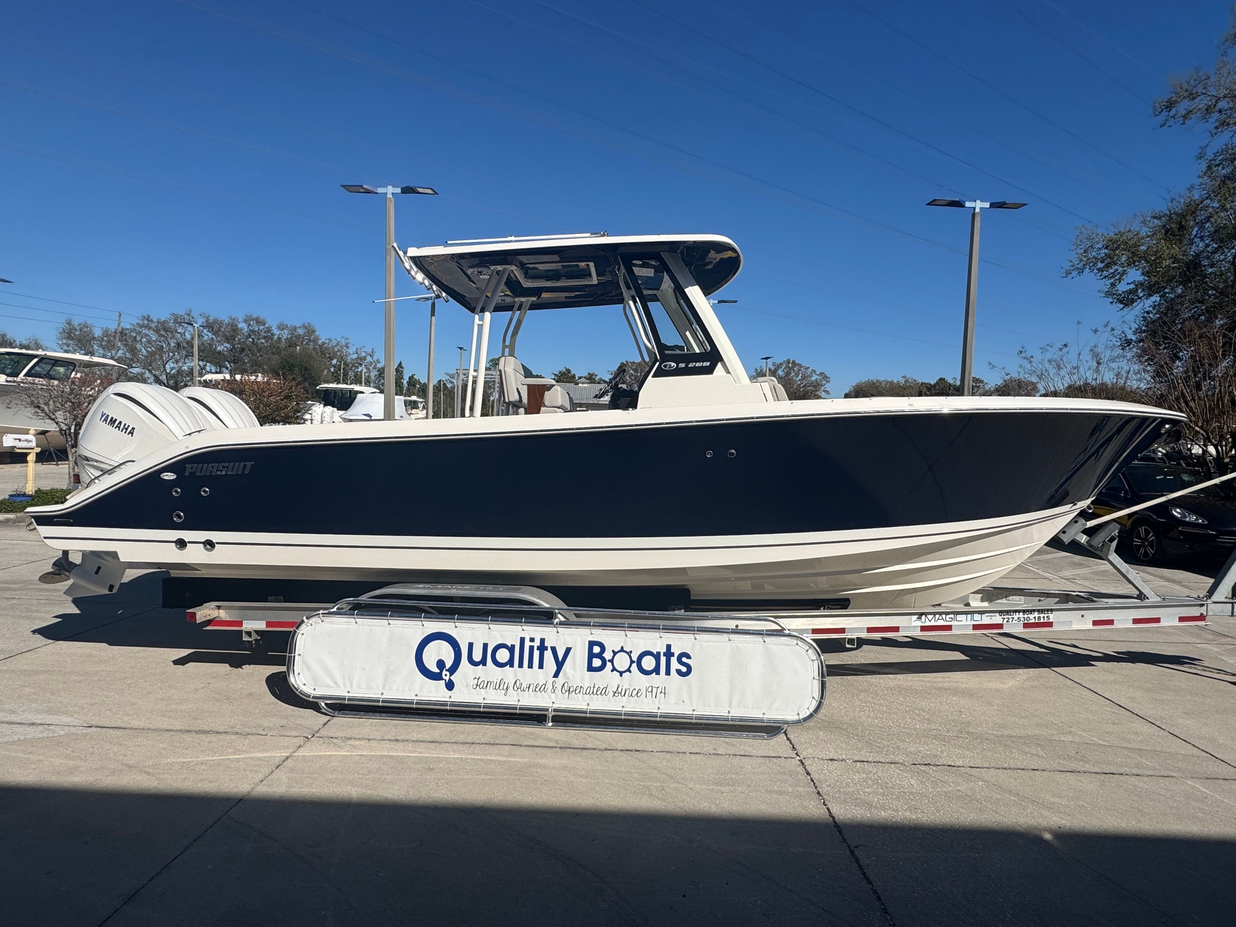 The 2025 Pursuit S 288 Center Console boat stretches to an impressive 30 feet in length, offering ample space for relaxation, entertainment, and on-water activities. With its sleek Flag Blue hull color and stylish Boot Stripe in Arctic White/Quartz Gray, this boat commands attention at every marina and on every waterway. The new condition ensures you will be the first to enjoy all the modern amenities and advanced engineering that Pursuit is renowned for. The S 288 model is meticulously crafted to deliver a seamless blend of style and substance, making it a top contender among Center Console boats for sale.