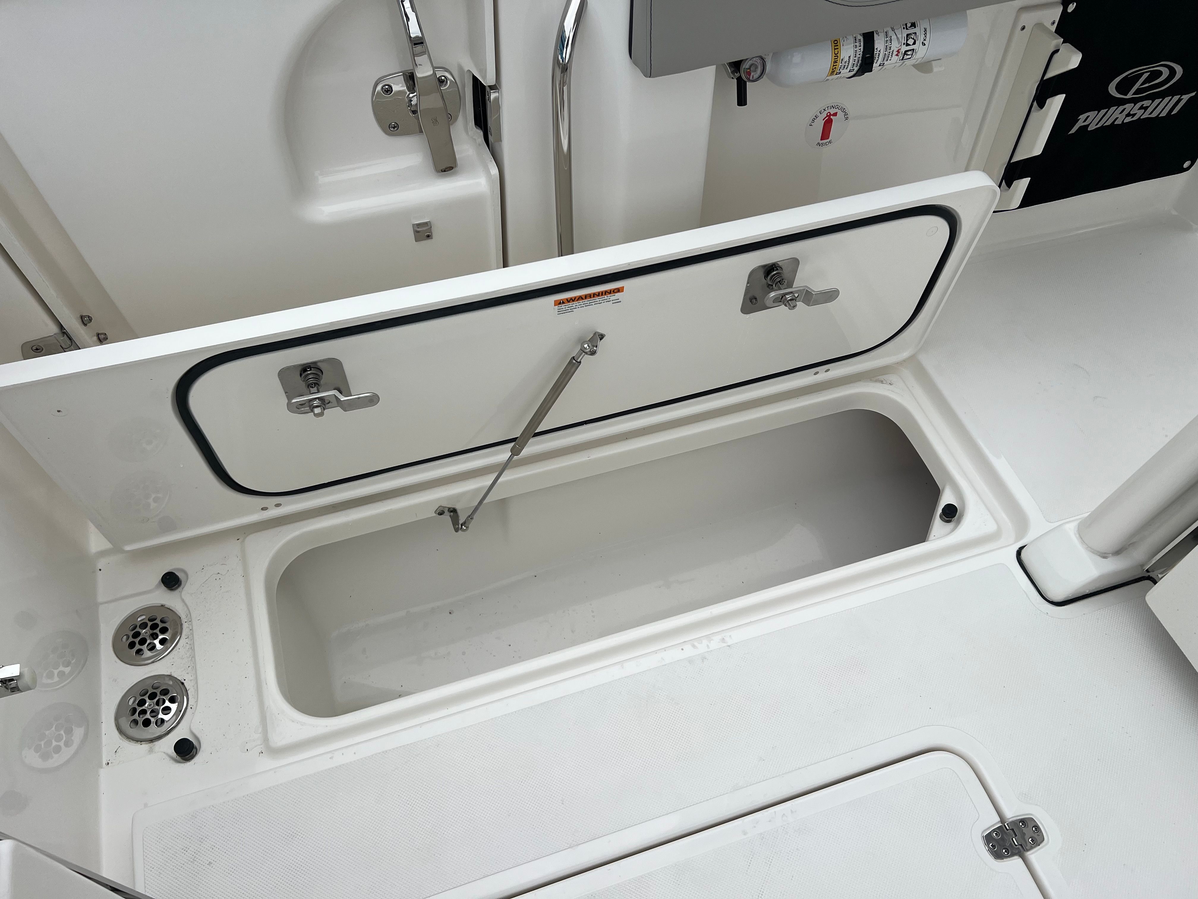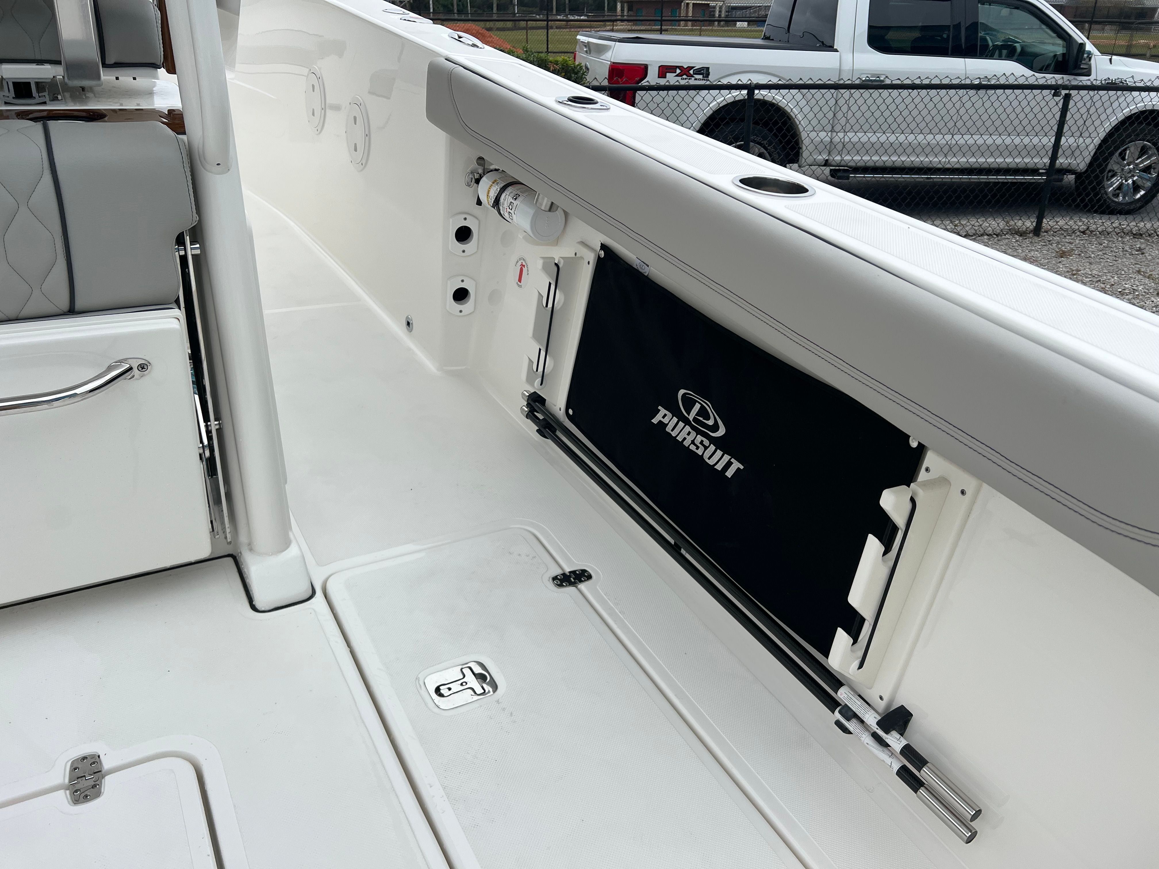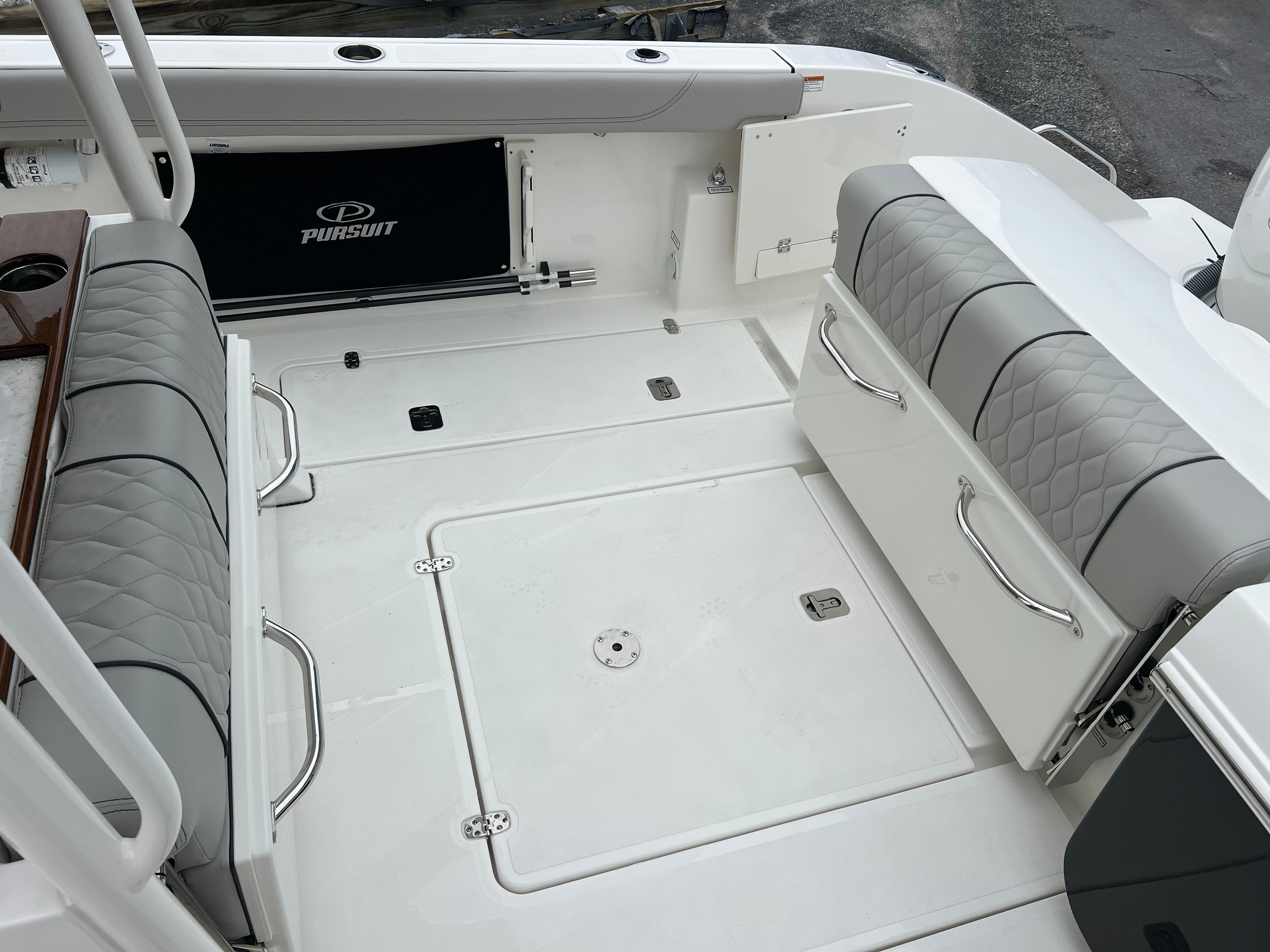 Practicality meets luxury in the Pursuit S 288 Center Console. The side door boarding ladder makes it easy for guests of all ages to board and disembark, while the cockpit table offers a versatile space for meals, games, or relaxing with a cold drink. The instrument cover and helm seat cover protect key areas from wear and tear, reducing maintenance and preserving the boat’s pristine appearance. The hardtop liner provides shelter from the elements, ensuring a comfortable environment regardless of the weather.Storage is thoughtfully integrated throughout the boat, allowing you to stow fishing gear, water toys, and personal items securely. The twin Yamaha engines deliver impressive fuel efficiency, helping you maximize your time on the water without frequent refueling stops. Maneuvering in tight spaces is a breeze thanks to the Yamaha® Joystick Control, making this Center Console boat for sale an excellent choice for both novice and experienced boaters.