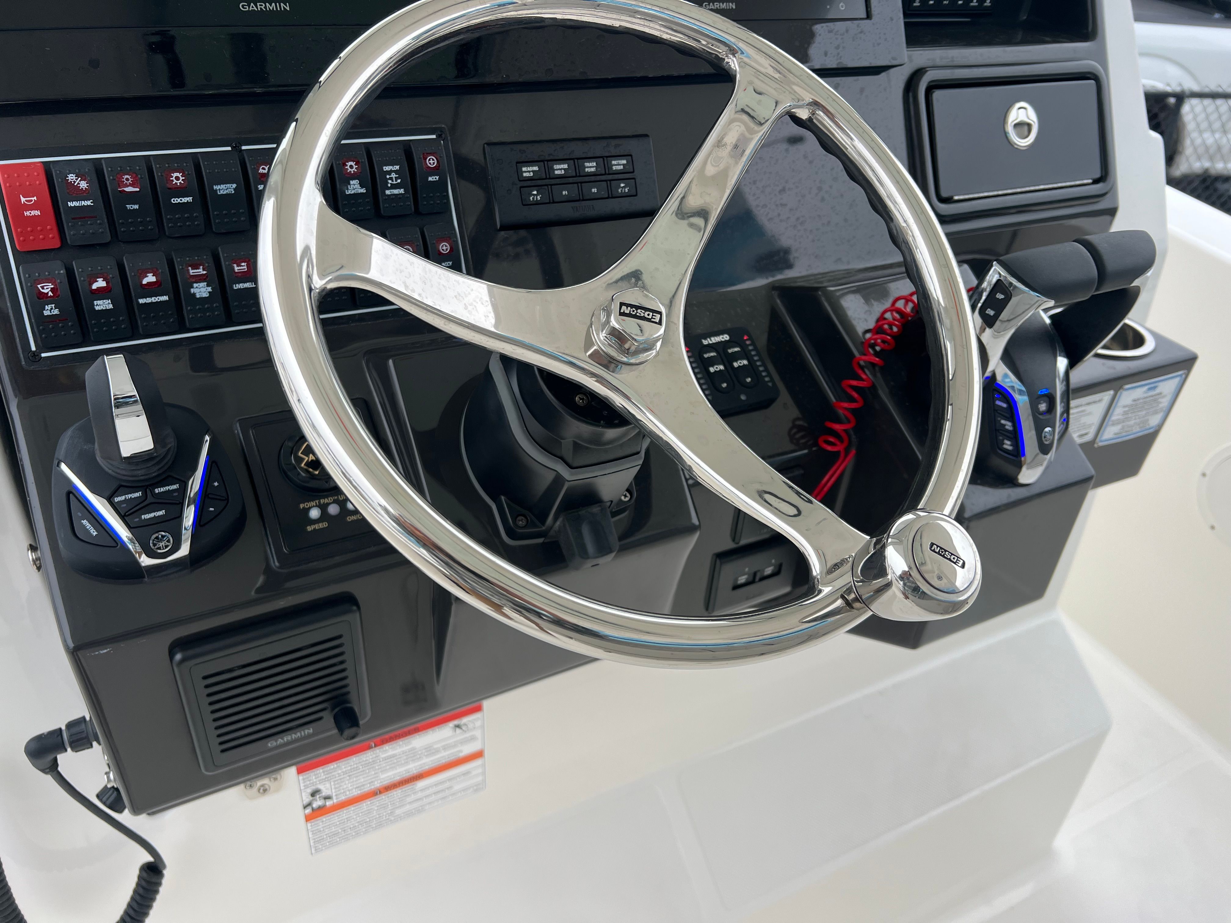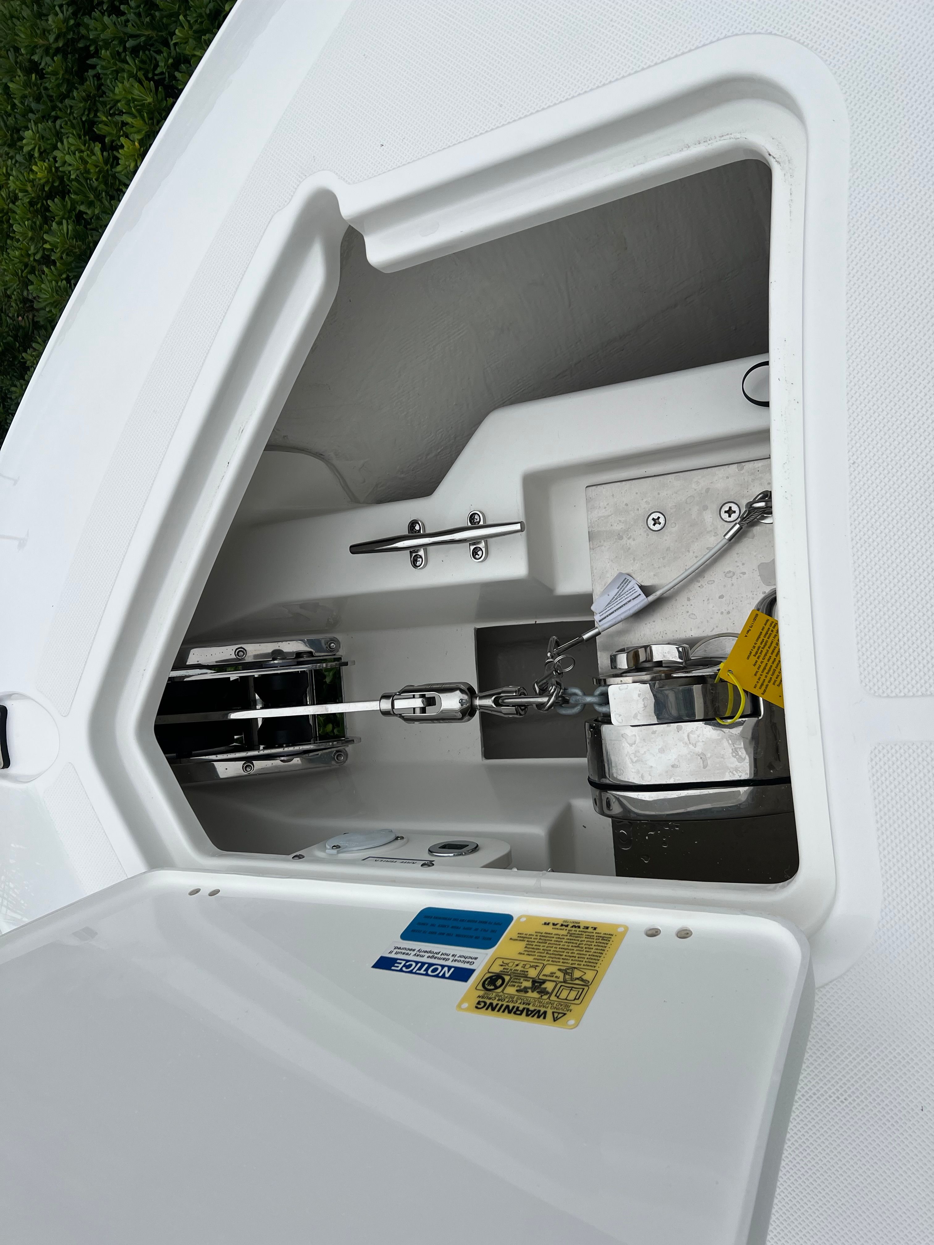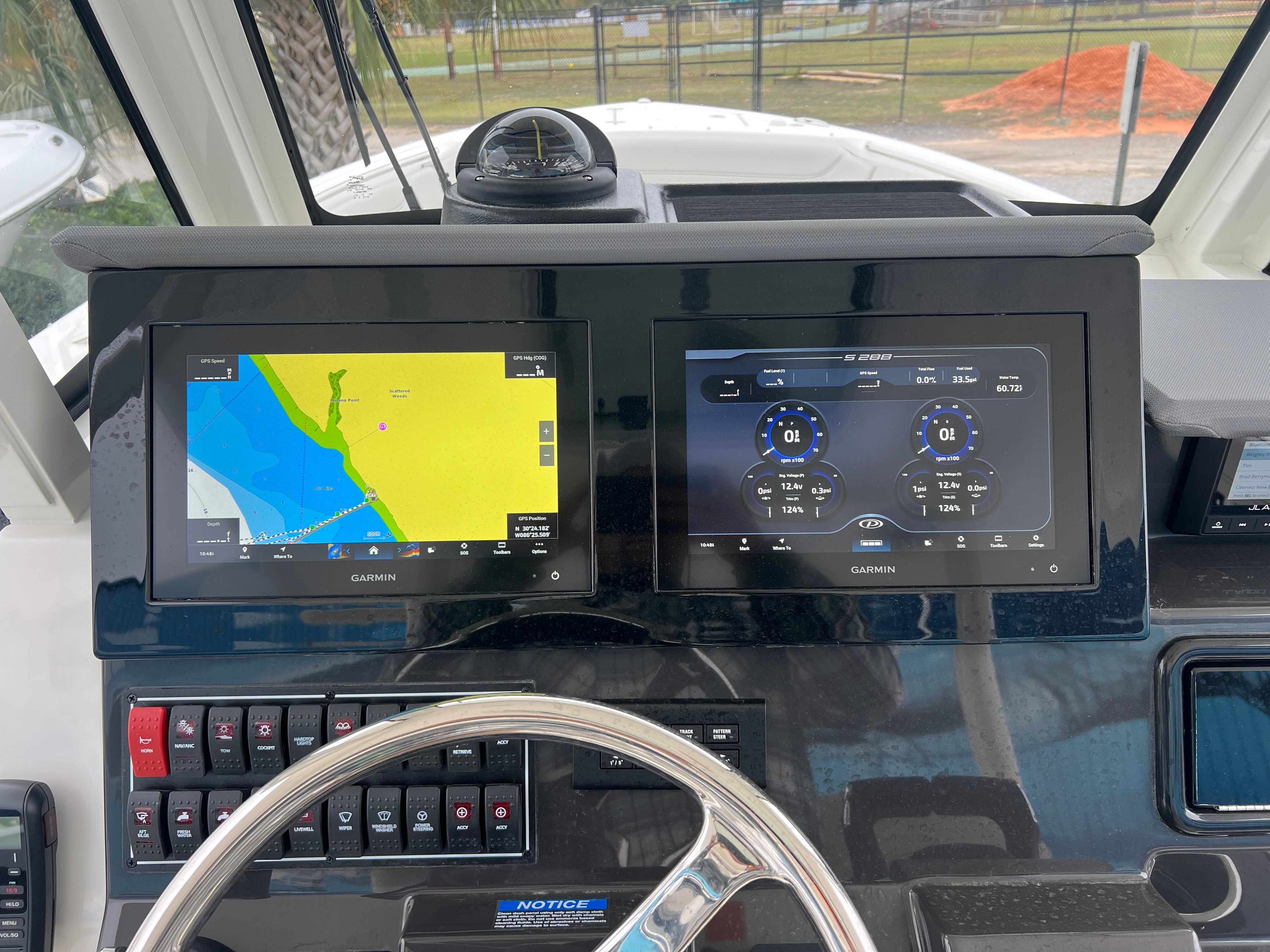 Practicality meets luxury in the Pursuit S 288 Center Console. The side door boarding ladder makes it easy for guests of all ages to board and disembark, while the cockpit table offers a versatile space for meals, games, or relaxing with a cold drink. The instrument cover and helm seat cover protect key areas from wear and tear, reducing maintenance and preserving the boat’s pristine appearance. The hardtop liner provides shelter from the elements, ensuring a comfortable environment regardless of the weather.Storage is thoughtfully integrated throughout the boat, allowing you to stow fishing gear, water toys, and personal items securely. The twin Yamaha engines deliver impressive fuel efficiency, helping you maximize your time on the water without frequent refueling stops. Maneuvering in tight spaces is a breeze thanks to the Yamaha® Joystick Control, making this Center Console boat for sale an excellent choice for both novice and experienced boaters.
