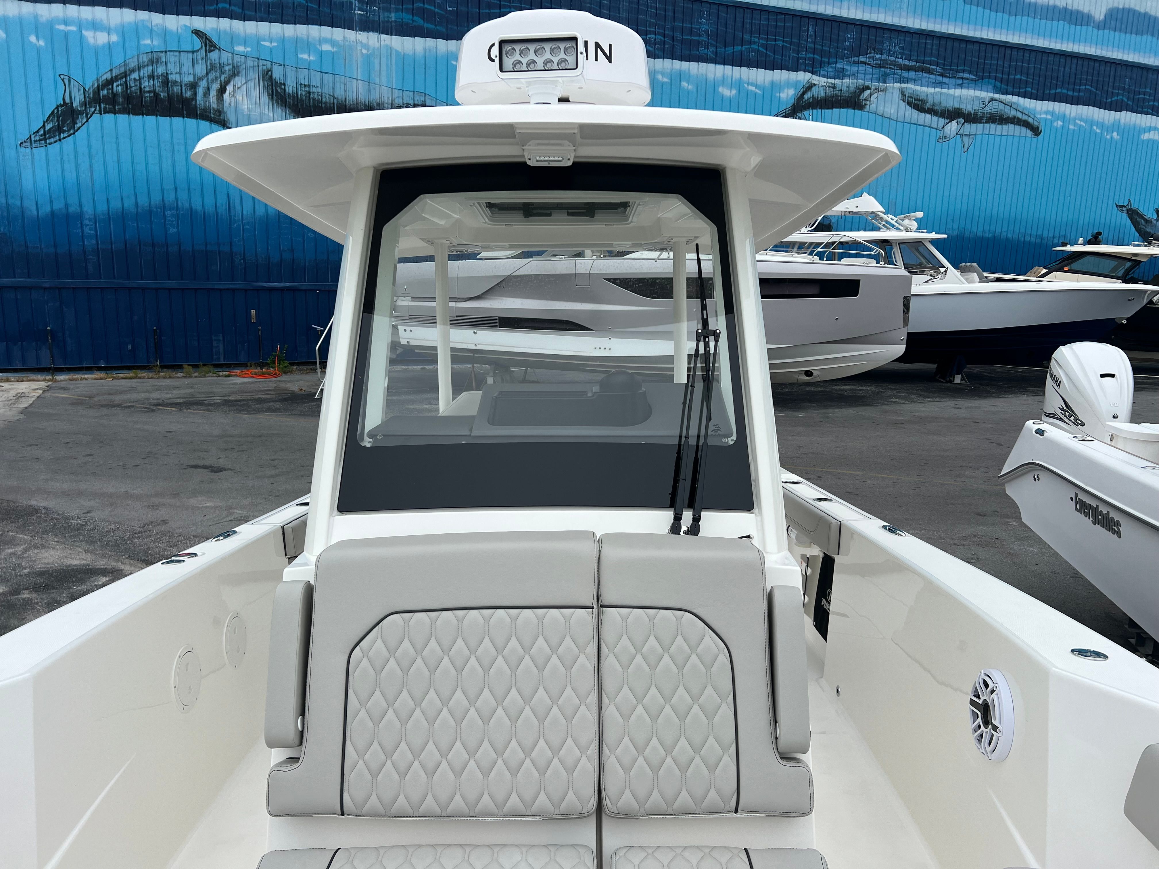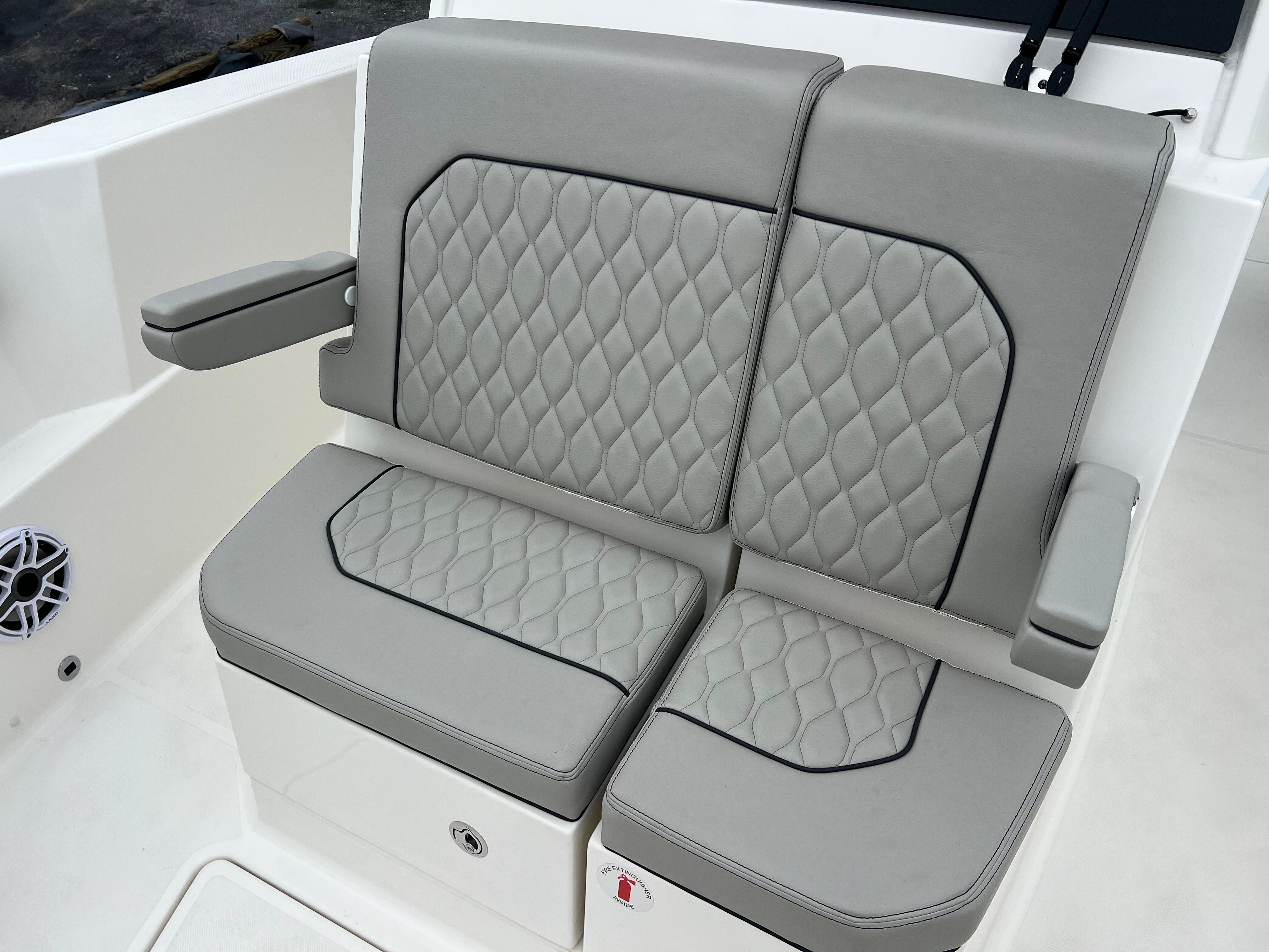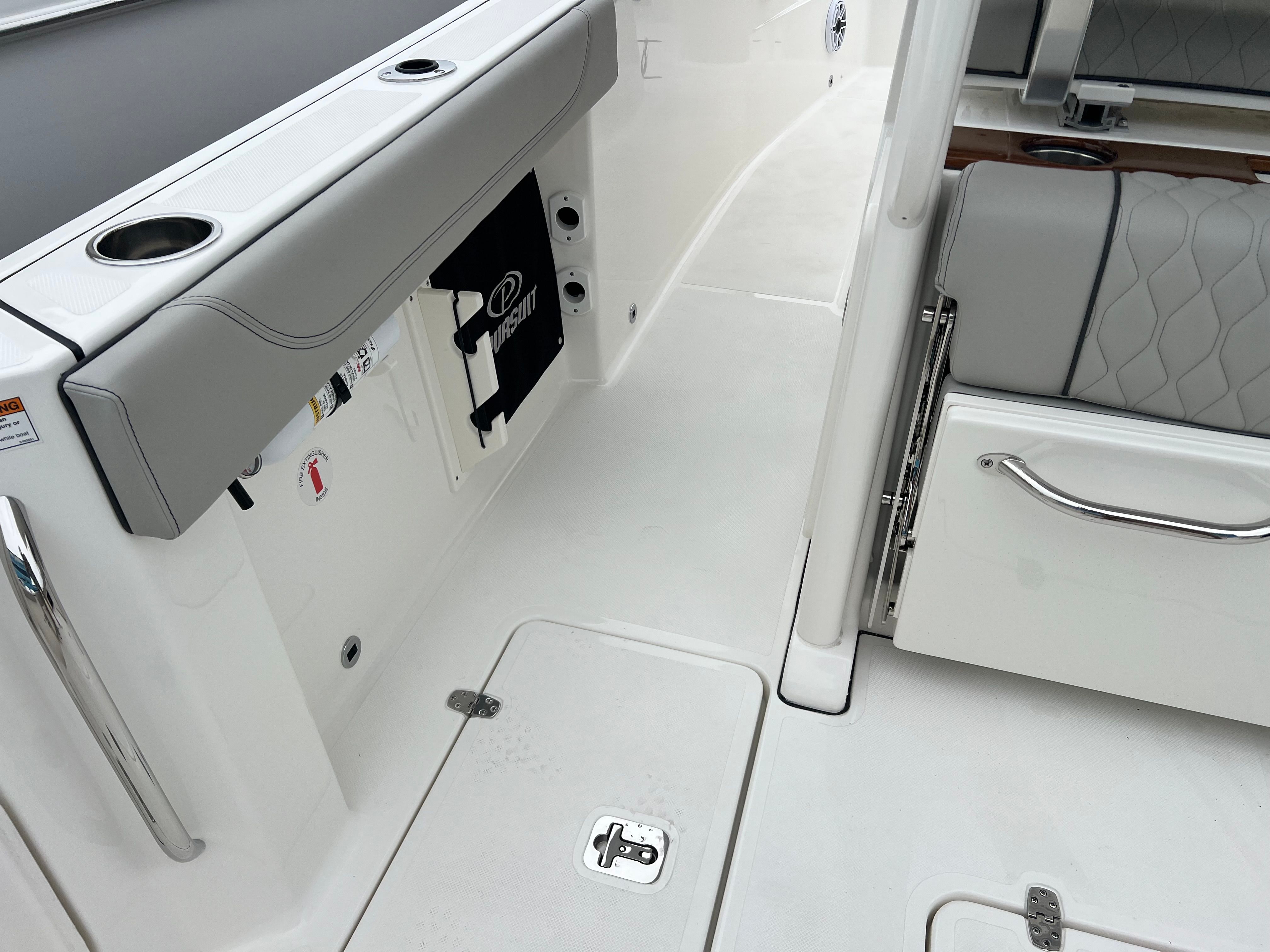 The Pursuit S 288 Center Console is packed with premium features designed to enhance your boating experience. The Bow Mediterranean Style Sunshade provides a comfortable retreat from the sun, perfect for relaxing with family and friends. The cockpit table, crafted from durable fiberglass and featuring dedicated storage, offers a convenient space for dining or socializing. An instrument cover in sleek black protects your helm controls, while the LED spotlight with remote control at the helm ensures visibility and safety during nighttime excursions.Boarding is made easy with the stainless steel side door boarding ladder, allowing guests to step aboard with confidence. The bow tonneau cover in black adds a touch of sophistication and protects your seating area from the elements. The helm seat cover, also in black, keeps your captain’s chair looking fresh and stylish. Every detail, from the hardtop liner to the thoughtfully designed storage solutions, reflects Pursuit’s dedication to quality and comfort.