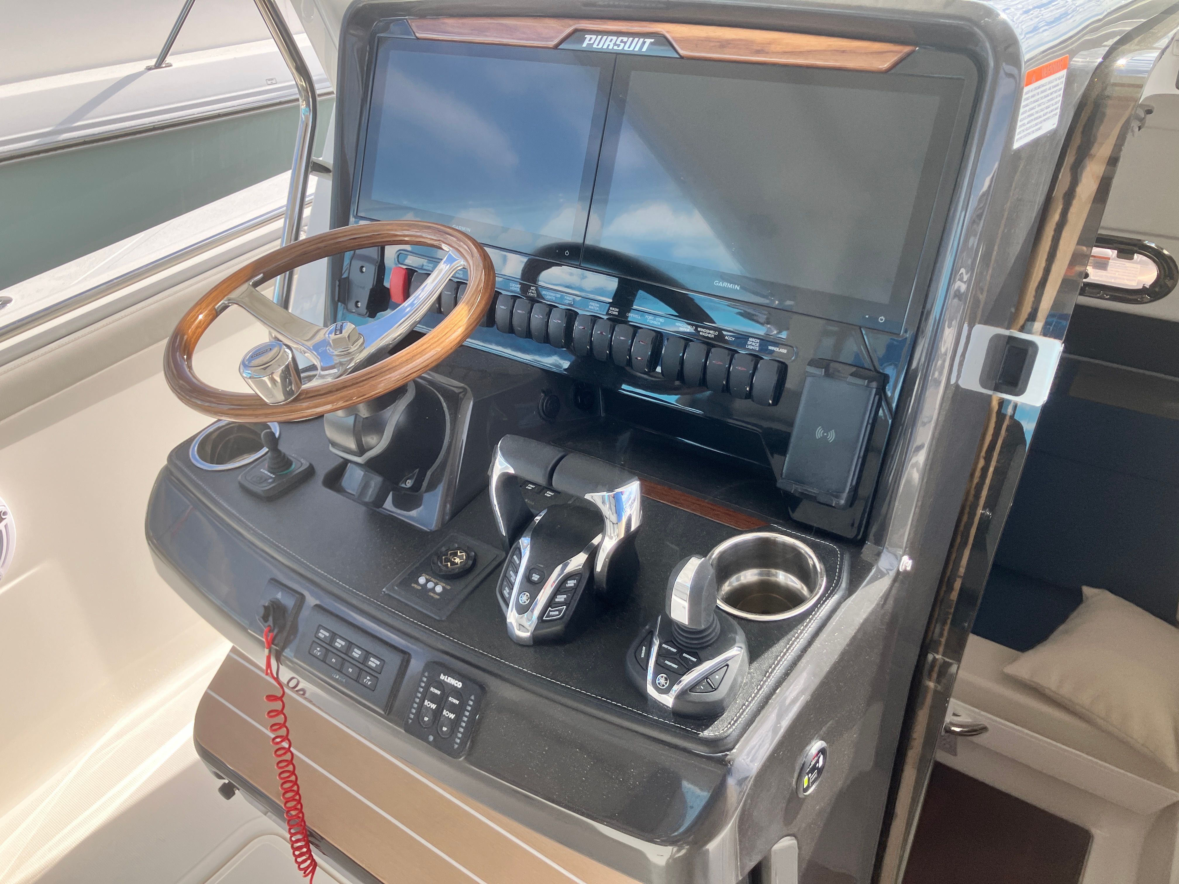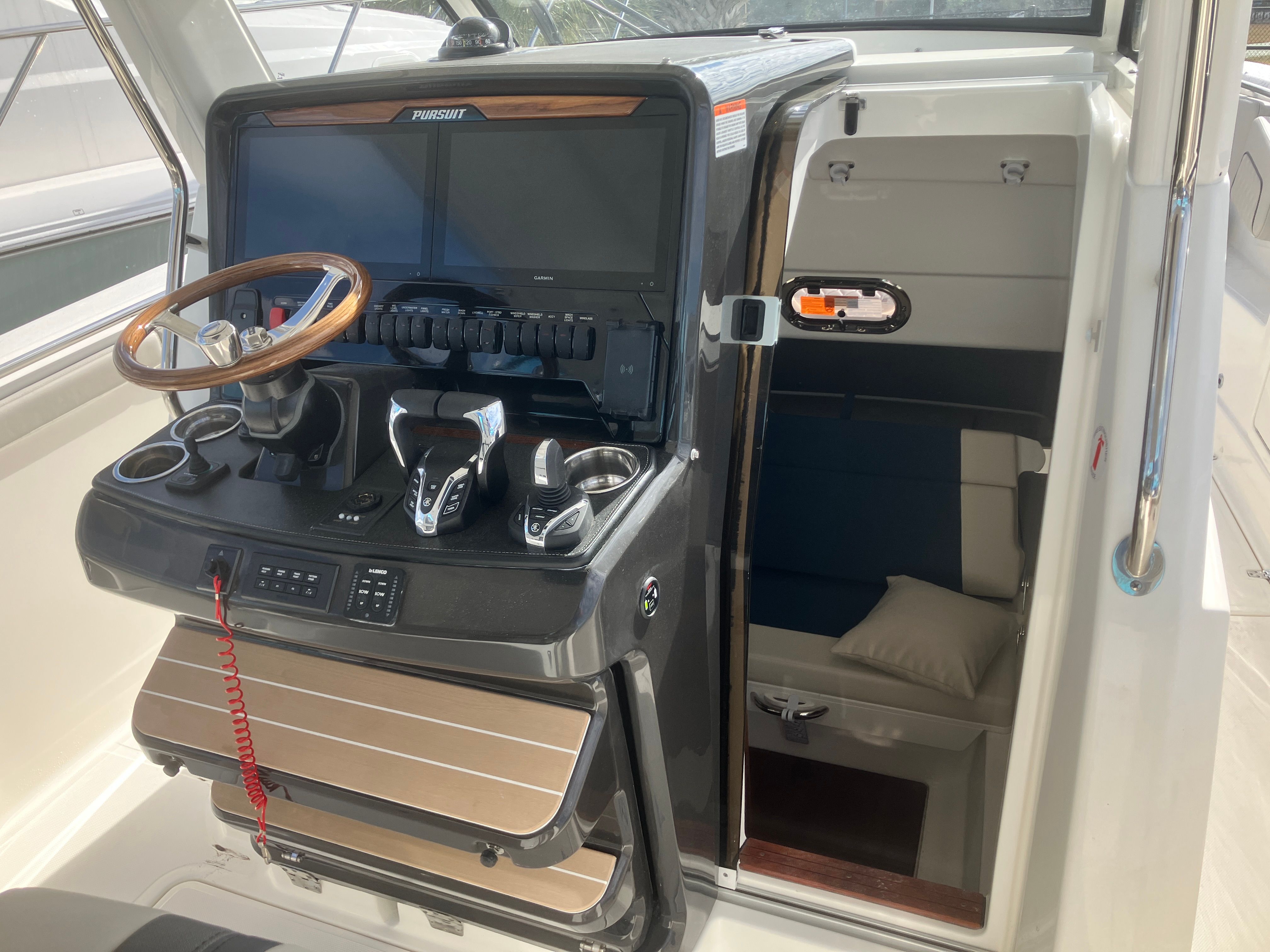 - Helm - Premium Upgrade: Edson Solid Teak Steering Wheel with Power Knob, Leather-Wrapped Dash Pad (Black), Synthetic Teak Flooring on Helm Footrest Treads and Teak Accents on Dash Storage Pockets and Entertainment Center