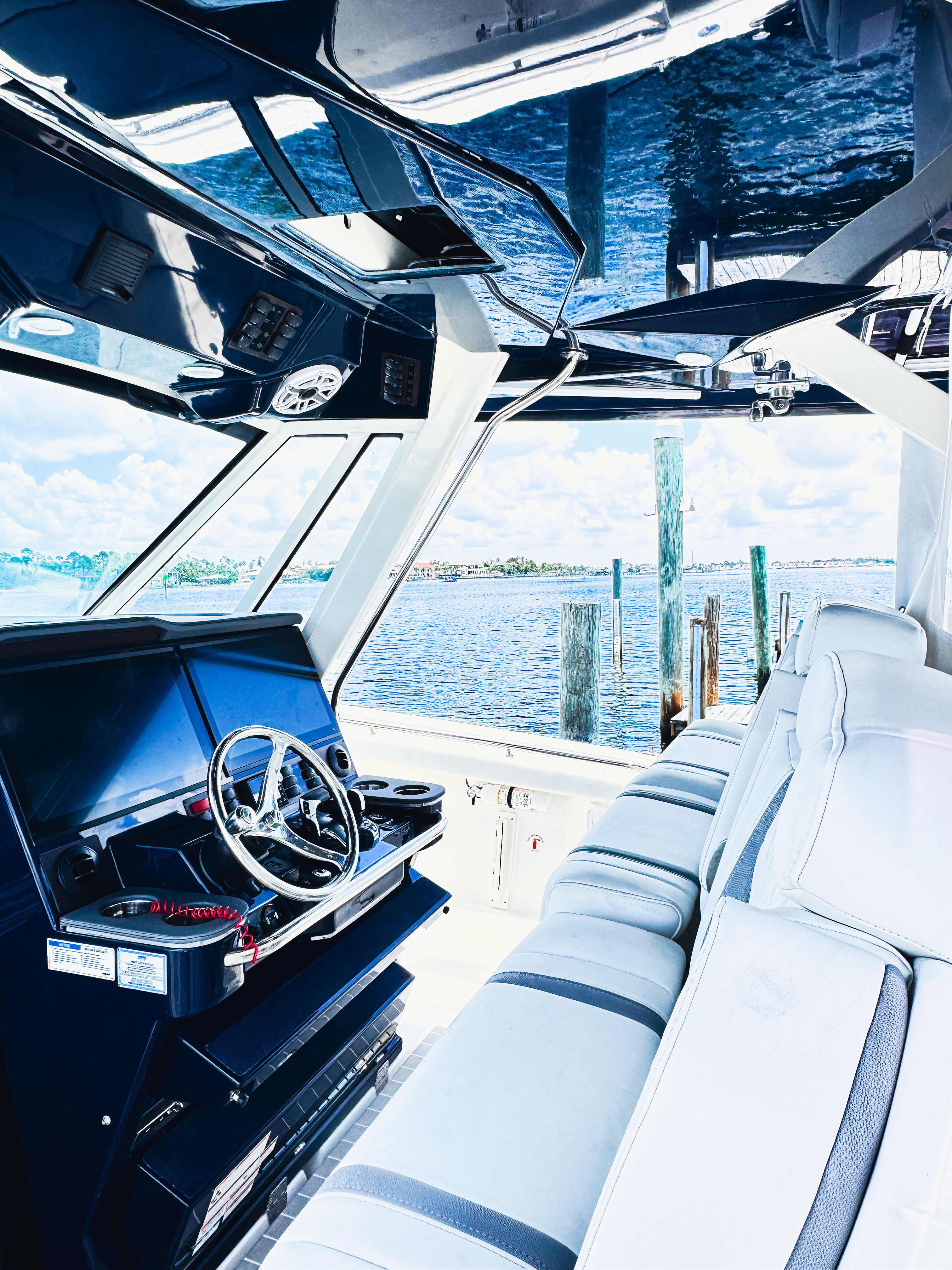 Step aboard the Pursuit S 428 and discover a world of advanced features designed to enhance your boating experience. The integrated electric steering (DES) provides effortless control, while the Helm Master® EX Digital Electronic Control (DEC) and Yamaha® Joystick Control offer full maneuverability, including Set PointTM and Autopilot capabilities for precision navigation. The multifunction display interface keeps you informed and in command, making every journey seamless and enjoyable.For added convenience, the manual engine flushing system simplifies maintenance, ensuring your engines stay in peak condition. The helm is finished in a striking Flag Blue, complemented by a Red bootstripe for a touch of sporty elegance. Enjoy the Mediterranean-style sunshade at the bow, perfect for relaxing in comfort during sunny days. The starboard in-floor fish box refrigerator/freezer with temperature control is ideal for keeping your catch fresh or storing refreshments for your guests.Luxurious touches abound, including console chaise seat covers and aft-facing seat covers in White Stamoid, a premium stereo upgrade for immersive sound, and a Garmin Radar Open Array GMR Fantom 54 for enhanced safety and navigation. The upholstery upgrade to White/Gray adds a sophisticated flair to the spacious seating areas, ensuring every moment onboard is enjoyed in style.