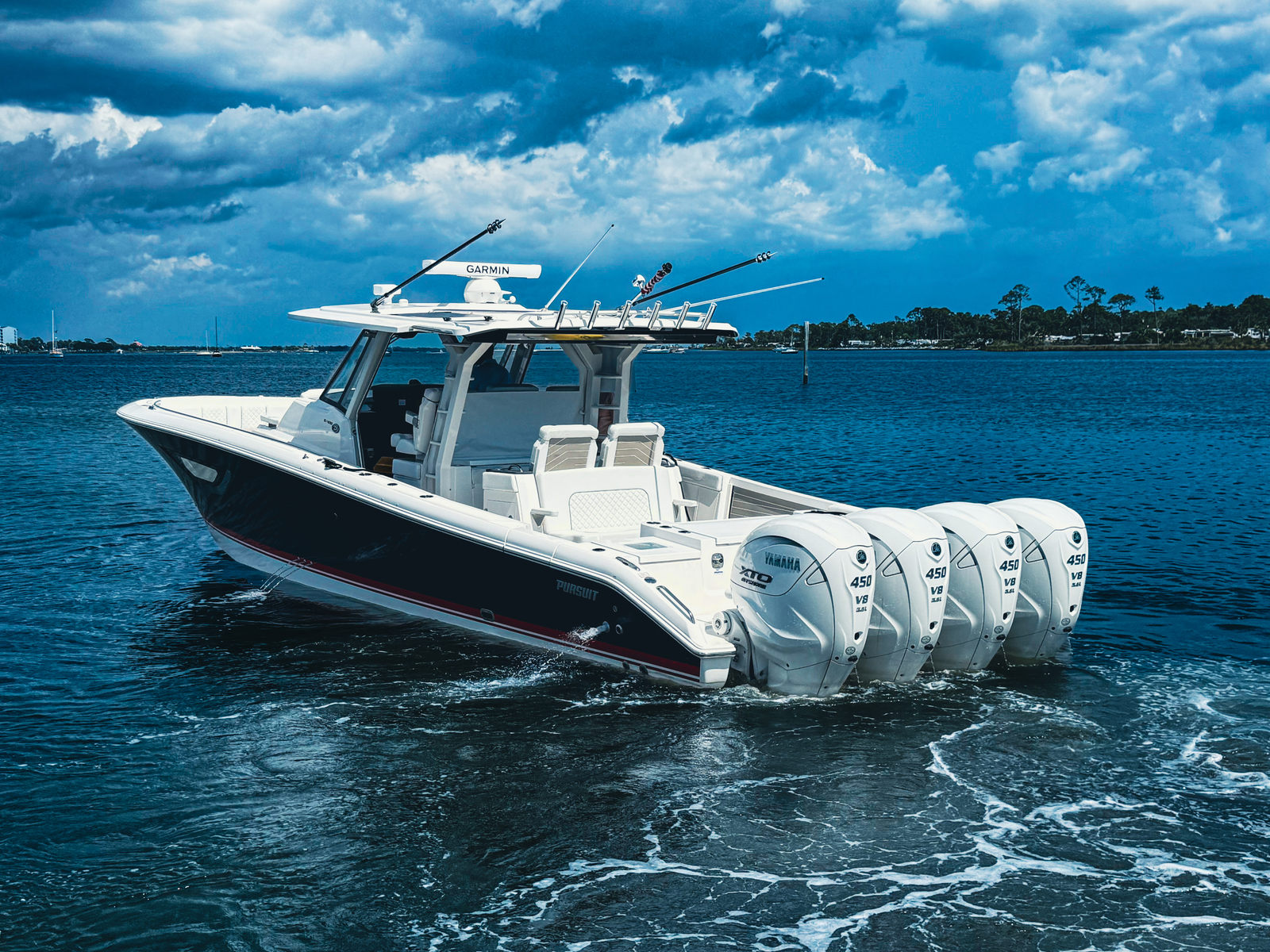 Powering the Pursuit S 428 are four robust engines, delivering a combined 1800 horsepower for unmatched speed and agility. This configuration ensures smooth acceleration, responsive handling, and the ability to tackle a wide range of water conditions with confidence. Whether you’re cruising along the coastline, heading offshore for a day of fishing, or enjoying a leisurely sunset ride, the S 428’s powerful engine setup guarantees an exhilarating and reliable performance every time you take the helm.