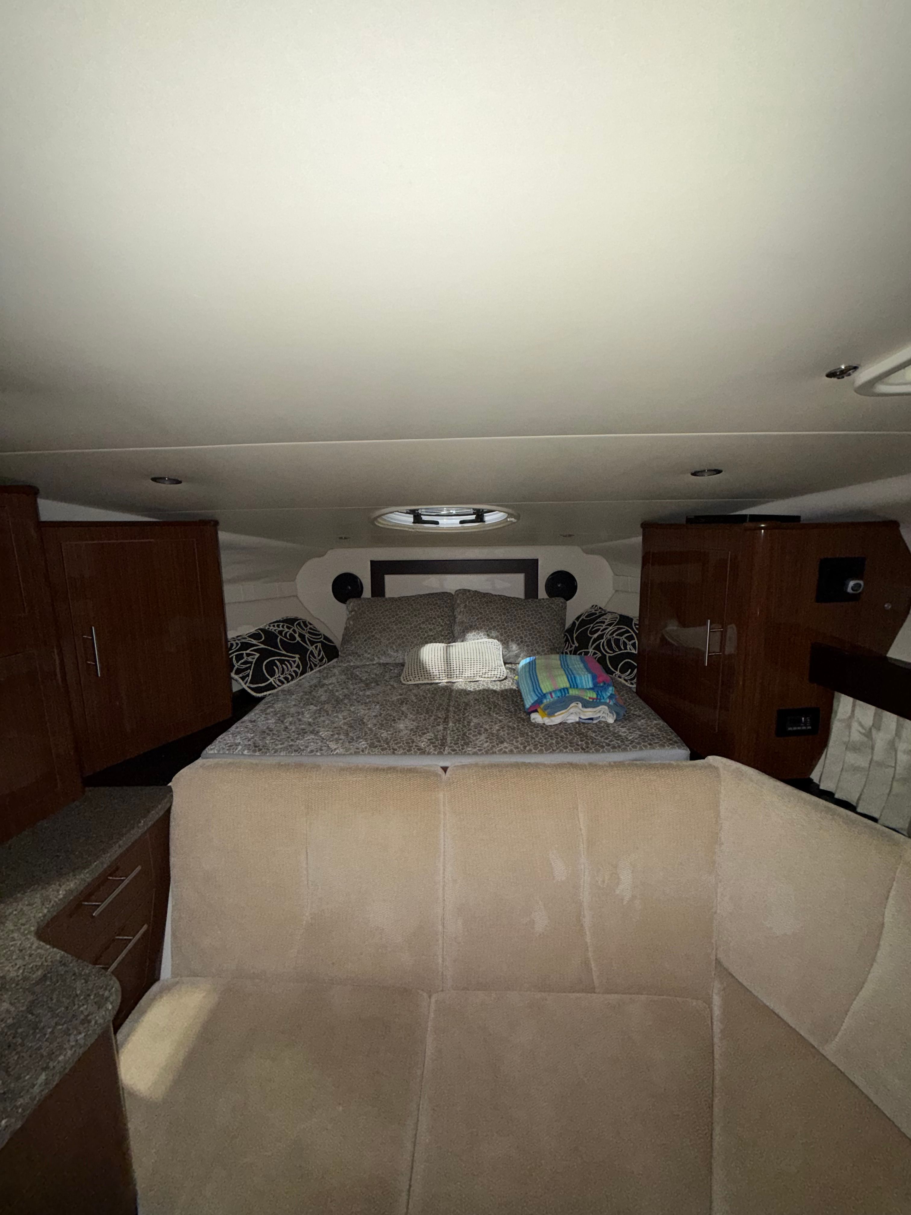 This cruiser boat for sale is equipped with a range of special features that enhance both comfort and convenience. The four onboard batteries ensure reliable power for all your electronics and amenities, while the battery charger keeps everything running smoothly during extended trips. The aft bench seat and aft cabin stateroom provide versatile seating and sleeping options, making it easy to accommodate family and friends for overnight stays or day cruises. Elegant cabinetry adds a touch of sophistication to the interior, offering practical storage solutions for your gear and personal items.The camper enclosure, featuring navy canvas that is only three years old, offers protection from the elements and extends your boating season. The cockpit carpet adds a layer of comfort underfoot, while the ample cockpit storage keeps your space organized and clutter-free. These features combine to create a welcoming environment that’s perfect for entertaining, relaxing, or simply enjoying the beauty of the water.