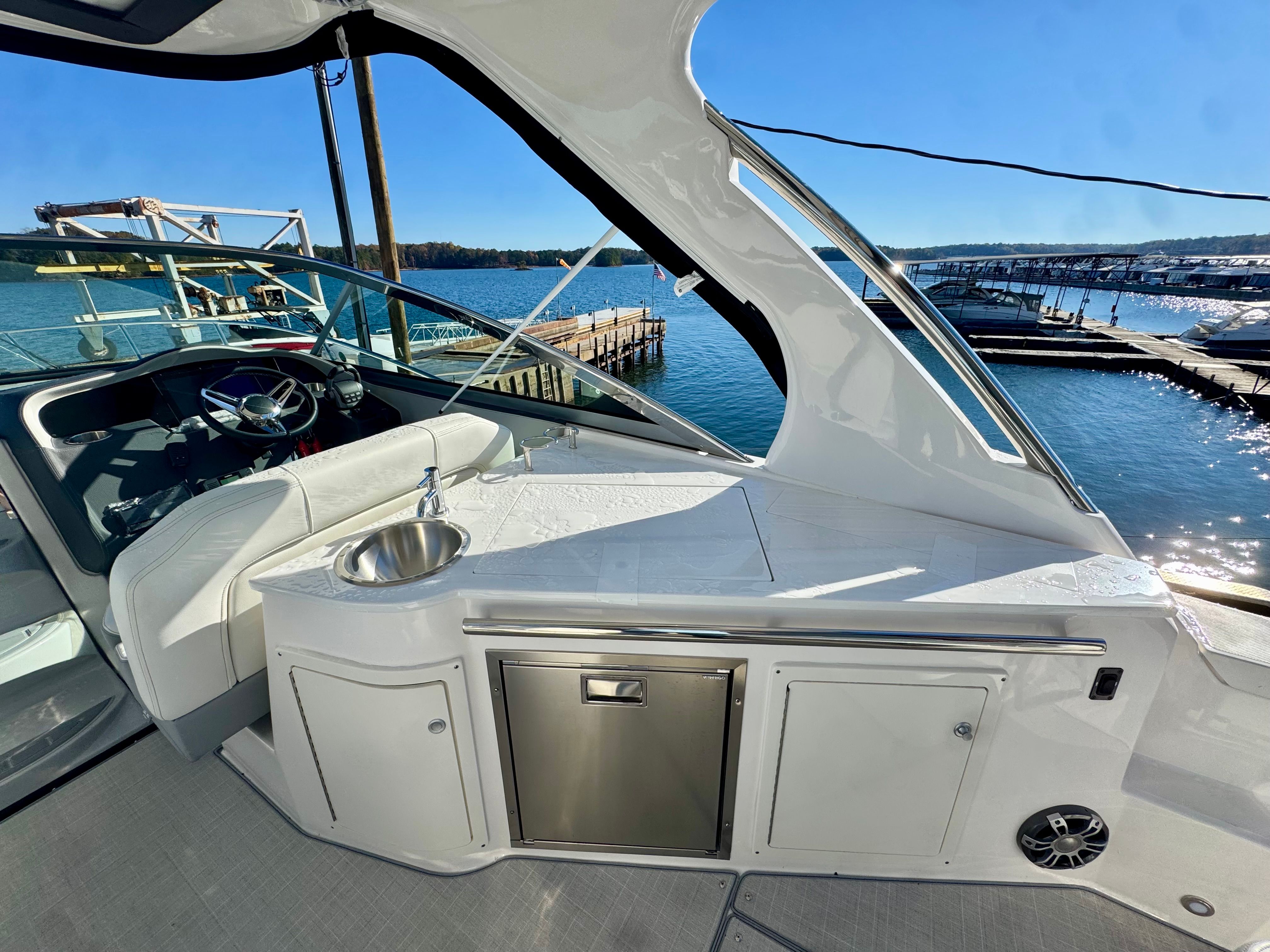 The cockpit of the 33 Express is built for socializing and relaxation, offering plush wraparound seating, a versatile wet bar, and expansive lounge space. Entertain guests in style or unwind in comfort while enjoying your surroundings from every angle.
