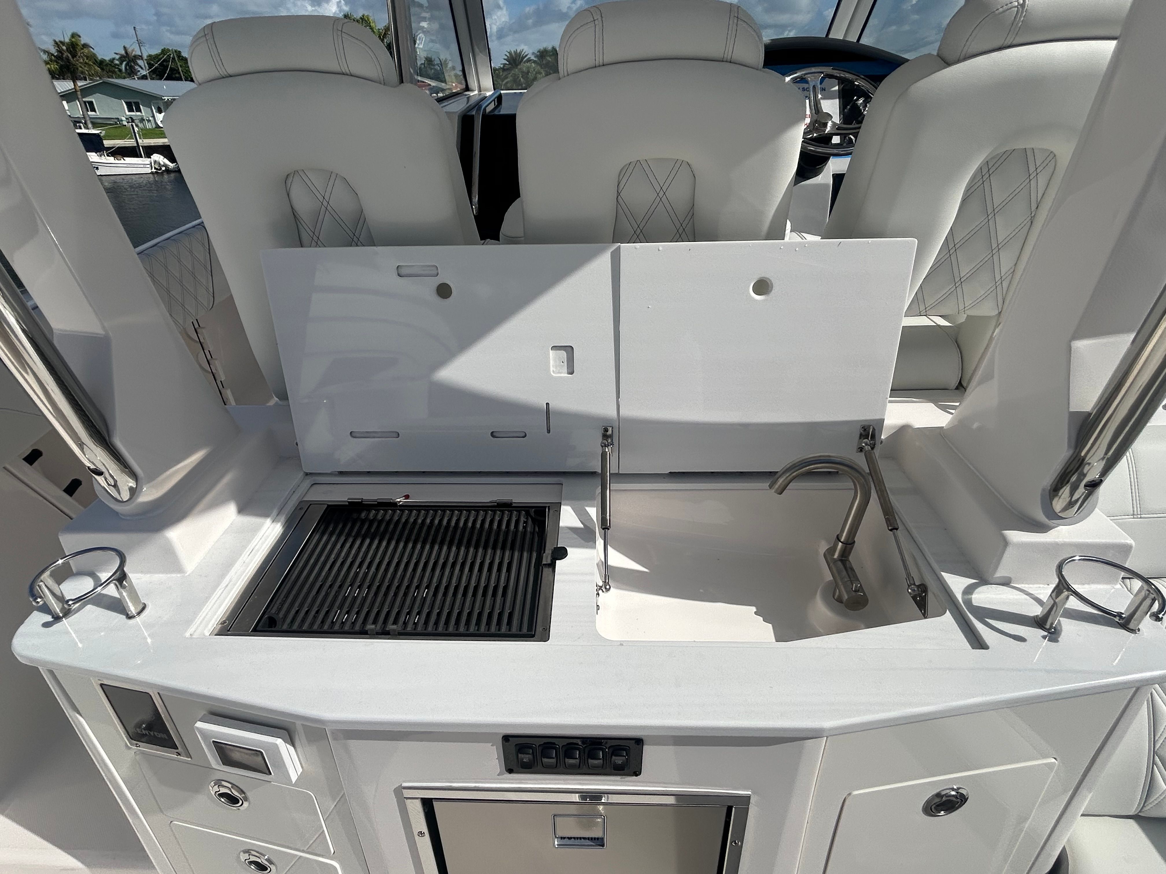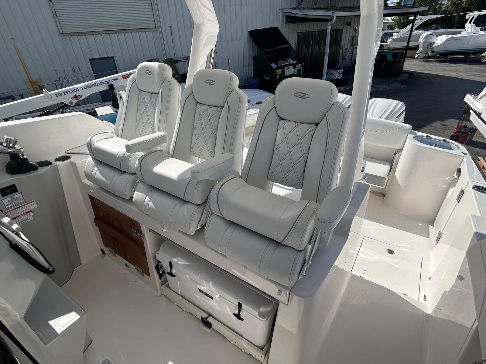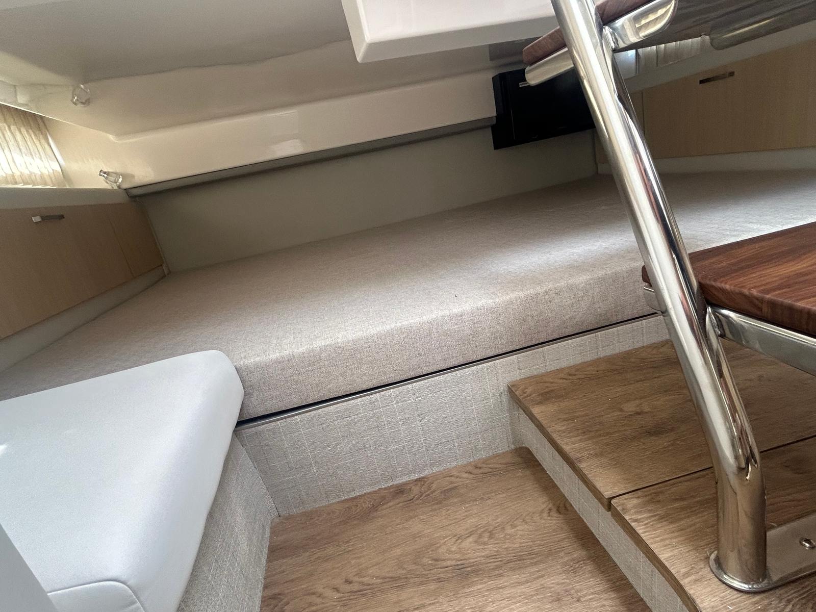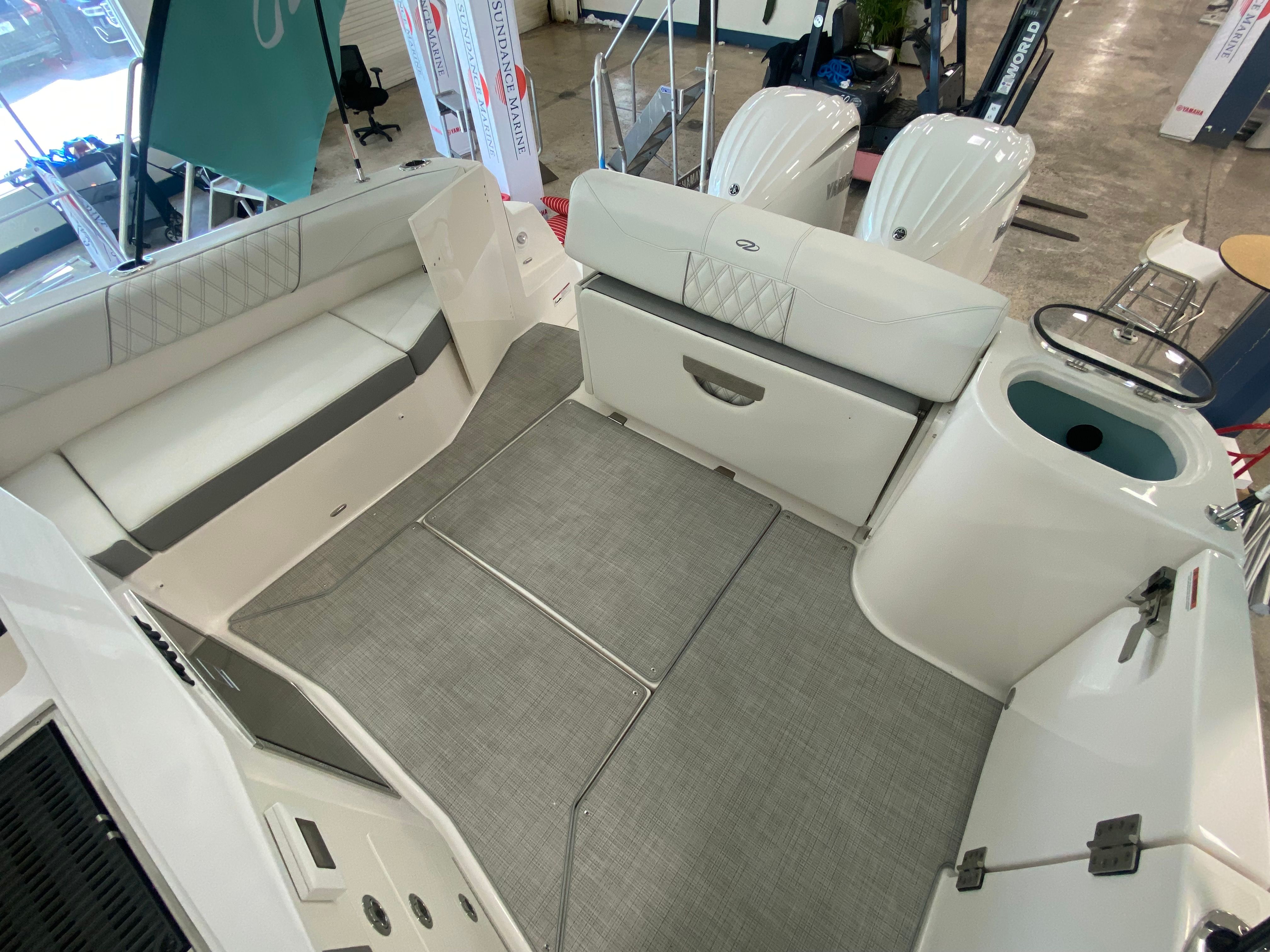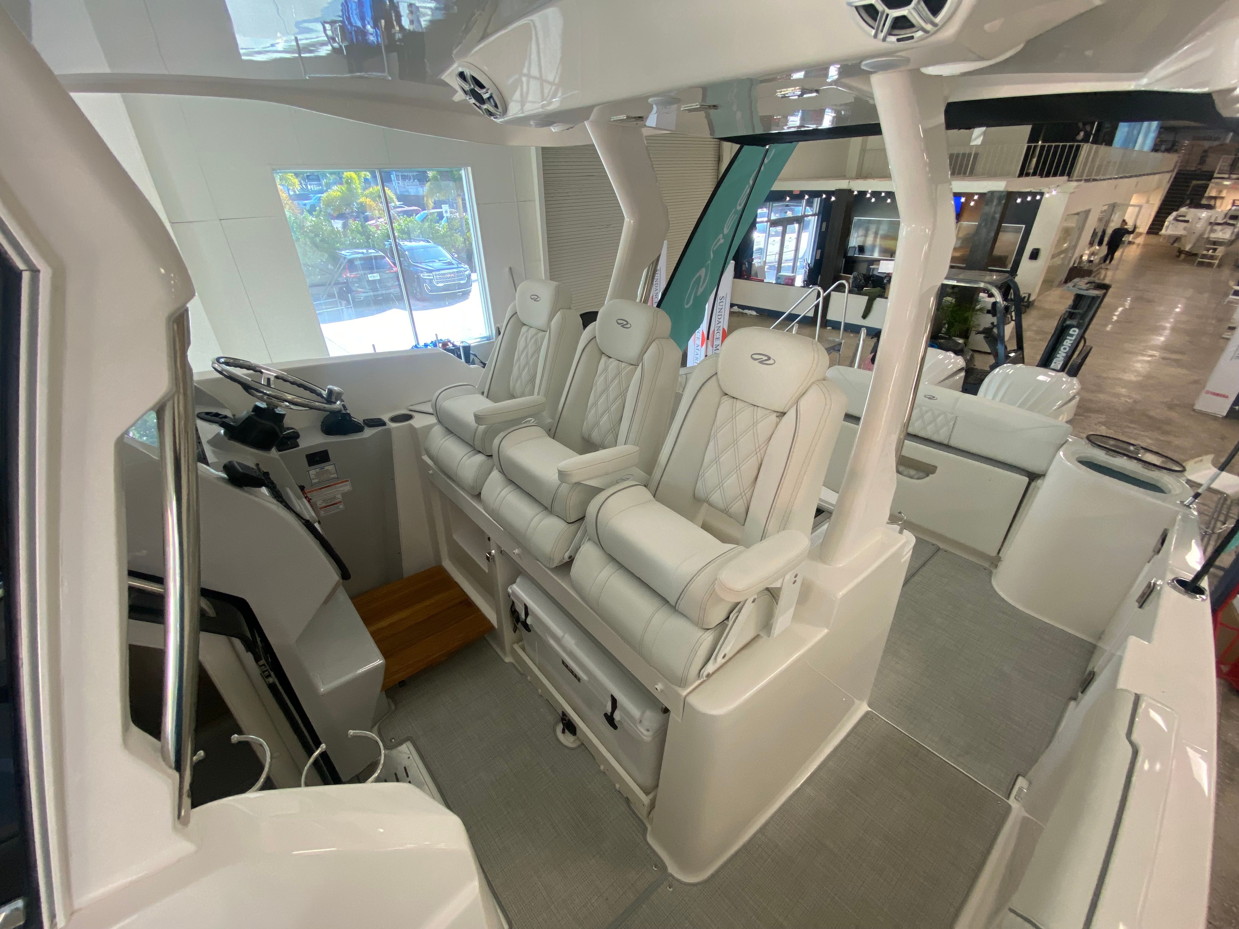 The Regal 33 SAV is packed with premium features designed to elevate your time on the water. Protect yourself from the elements with bow and cockpit covers, ensuring your boat stays in top condition regardless of the weather. The manual bow and cockpit sunshade system, finished in elegant white canvas, offers customizable shade for sunny days, keeping you and your guests cool and comfortable. Step onto the cockpit seagrass mat in a coastal design, adding a touch of style and comfort underfoot.Inside, the countertops feature the sophisticated Strato Wind finish, while the salon floor boasts toasted oak for a warm, inviting atmosphere. Enjoy the convenience of a gas 110V generator, providing reliable power for all your onboard needs. Stay cool and refreshed with integrated air conditioning, making every journey enjoyable no matter the temperature outside. These thoughtful touches set the Regal 33 SAV apart from other cruiser boats for sale, offering a truly luxurious boating experience.