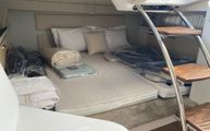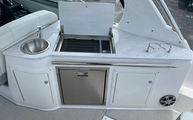 Features wraparound seating, a teak cockpit table, and an integrated wet bar with refrigerator and sink—perfect for entertaining.