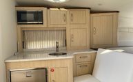 Includes refrigerator, microwave, cooktop, and plenty of storage for extended stays.