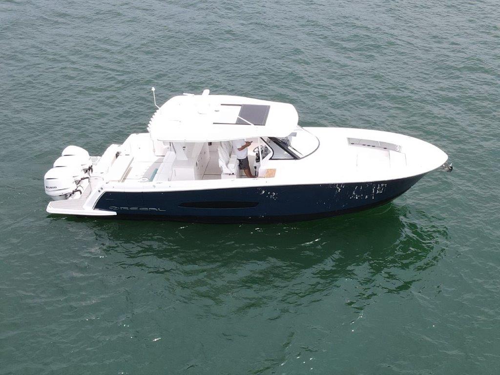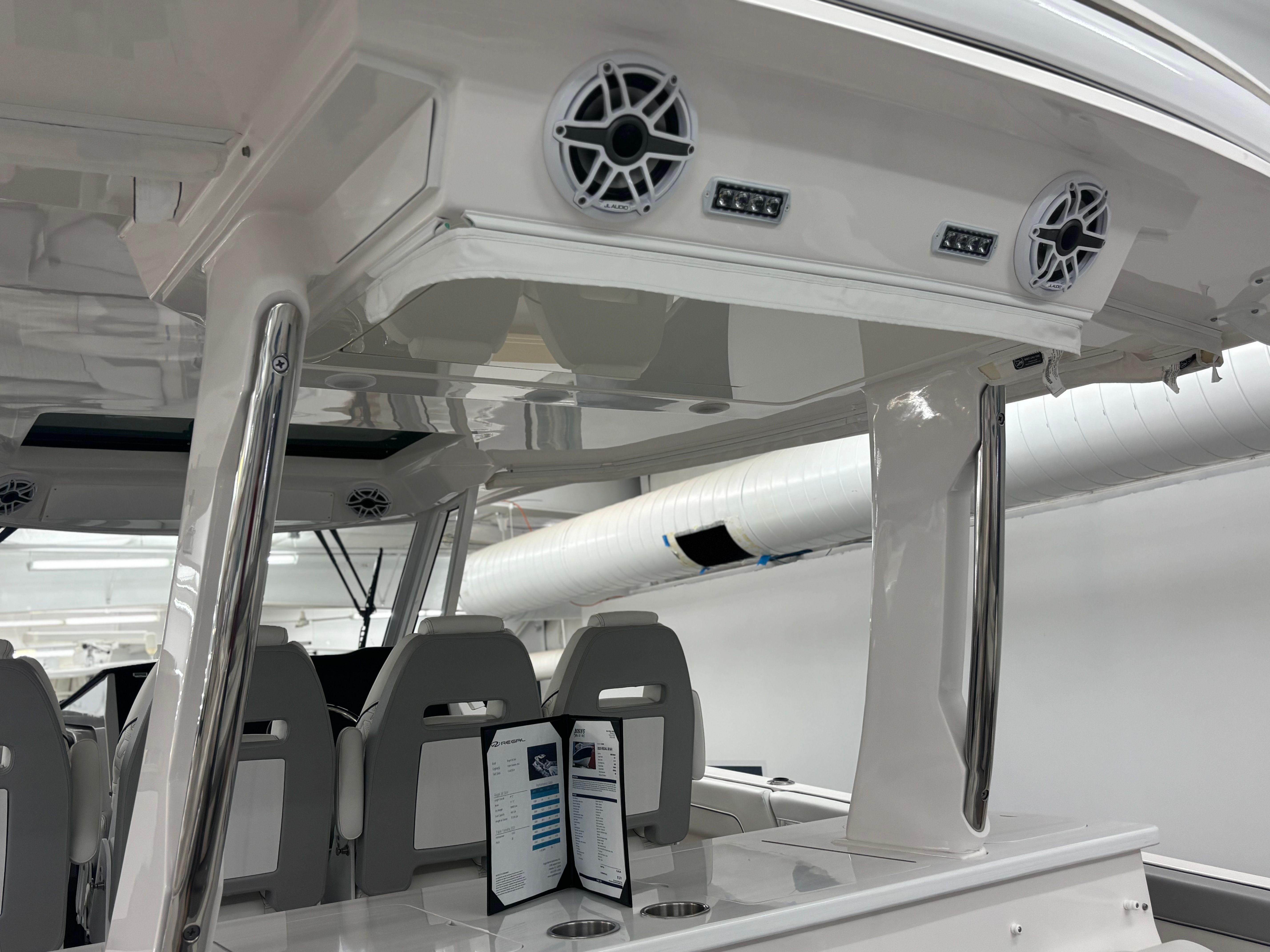 The 2025 Regal 38 SAV stands out with its impressive length of 39.25 feet, offering ample space for relaxation, entertainment, and exploration. This new yacht boasts a sleek and modern profile, highlighted by its Graphite bottom color, Steel Gray bootstripe, and a combination of Pure White, Lunar Grey, and Graphite finishes. The absence of bottom paint ensures a pristine, streamlined look that enhances both aesthetics and performance. As a new yacht, the 38 SAV is in immaculate condition, ready to deliver years of enjoyment on the water.