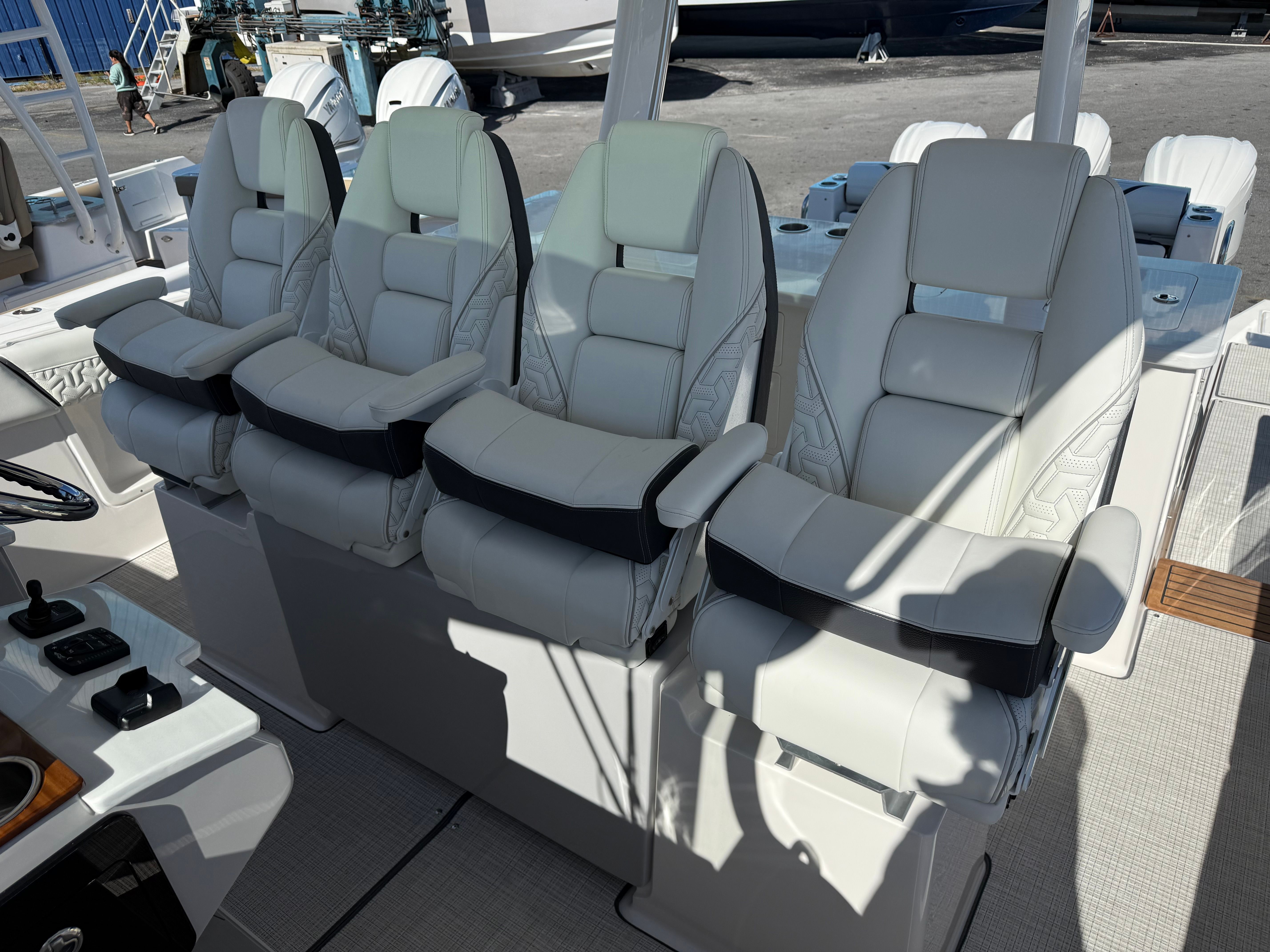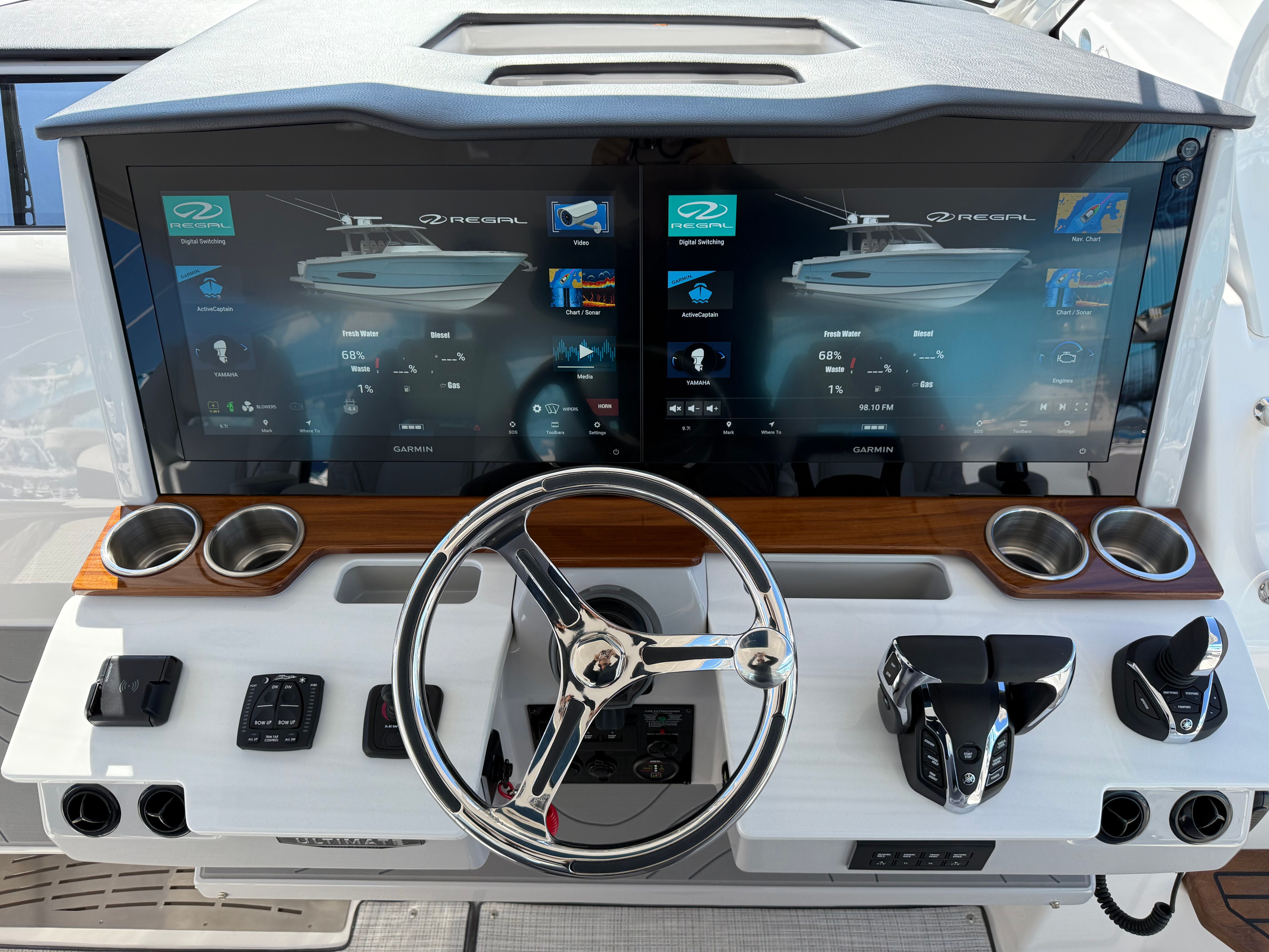 The Regal 38 SAV is packed with special features that elevate your boating experience to new heights. The triple Yamaha F300NSB2 engines provide unmatched power and efficiency, while the integrated steering system ensures precise control. The hull’s Steel Grey finish, Graphite bootstripe, and Tahiti Beach White bottom create a visually stunning exterior that reflects Regal’s commitment to quality and style. The multi-zone color scheme, featuring Pure White, Graphite, Lunar Grey, and Graphite Grey, adds depth and character to the yacht’s appearance, making it a true standout on the water. Every detail of the Regal 38 SAV is crafted to enhance both aesthetics and functionality, ensuring you enjoy every moment aboard.