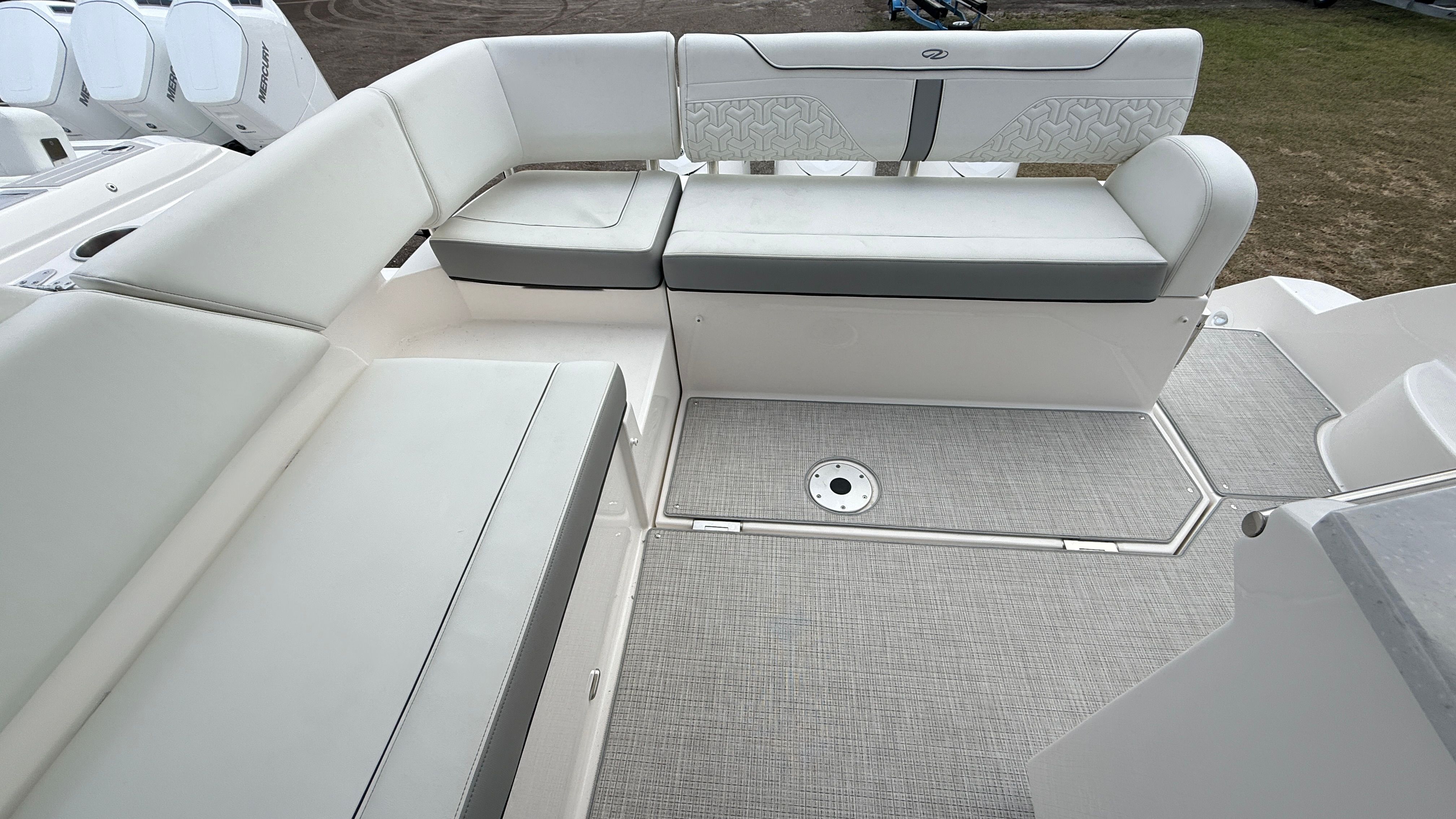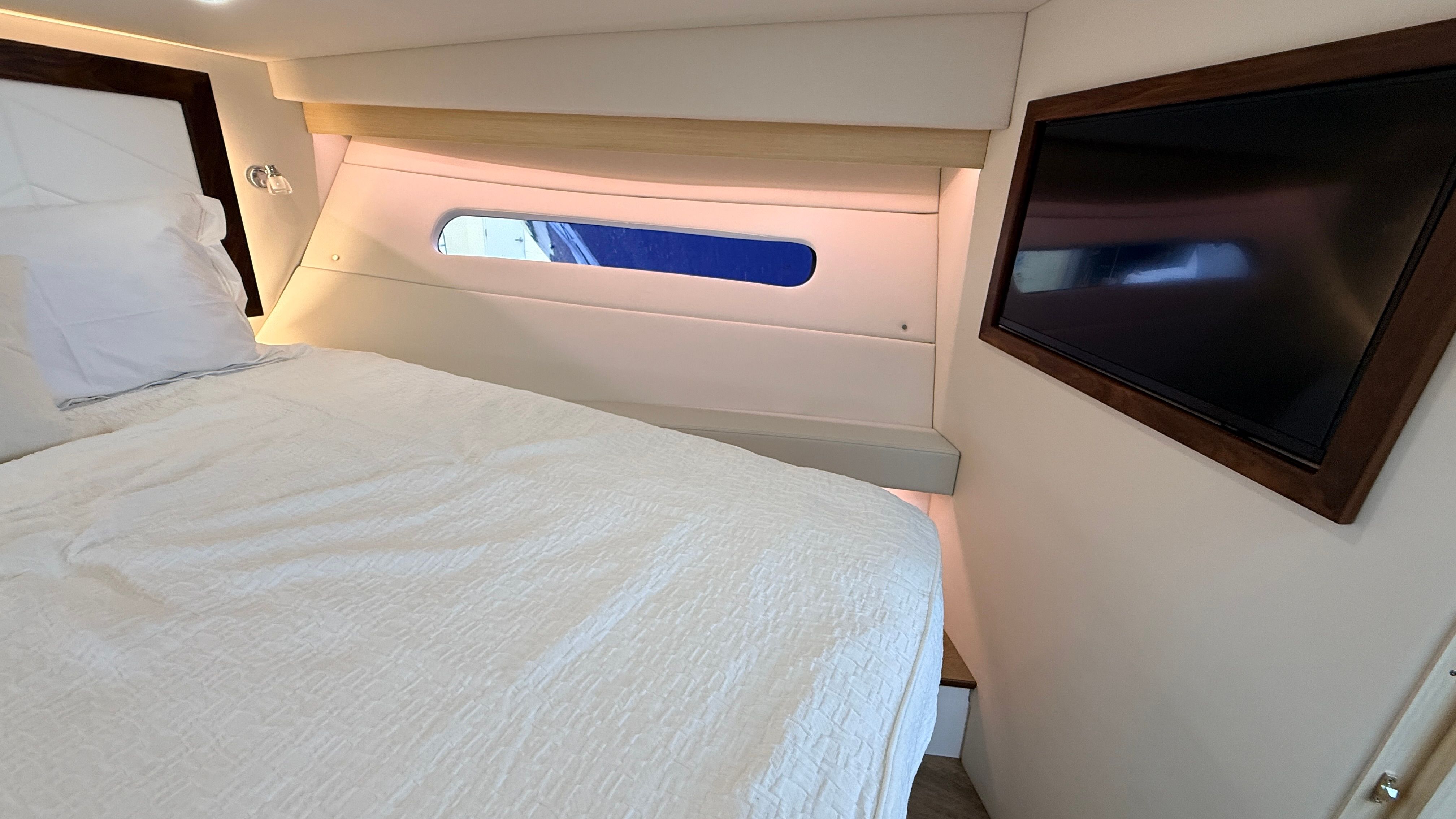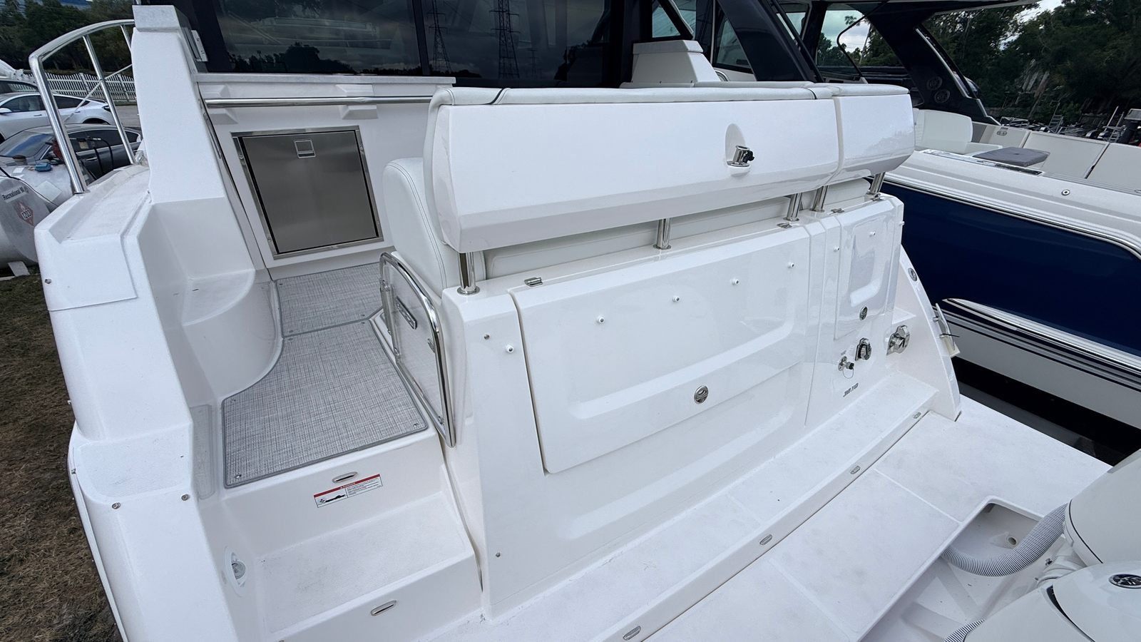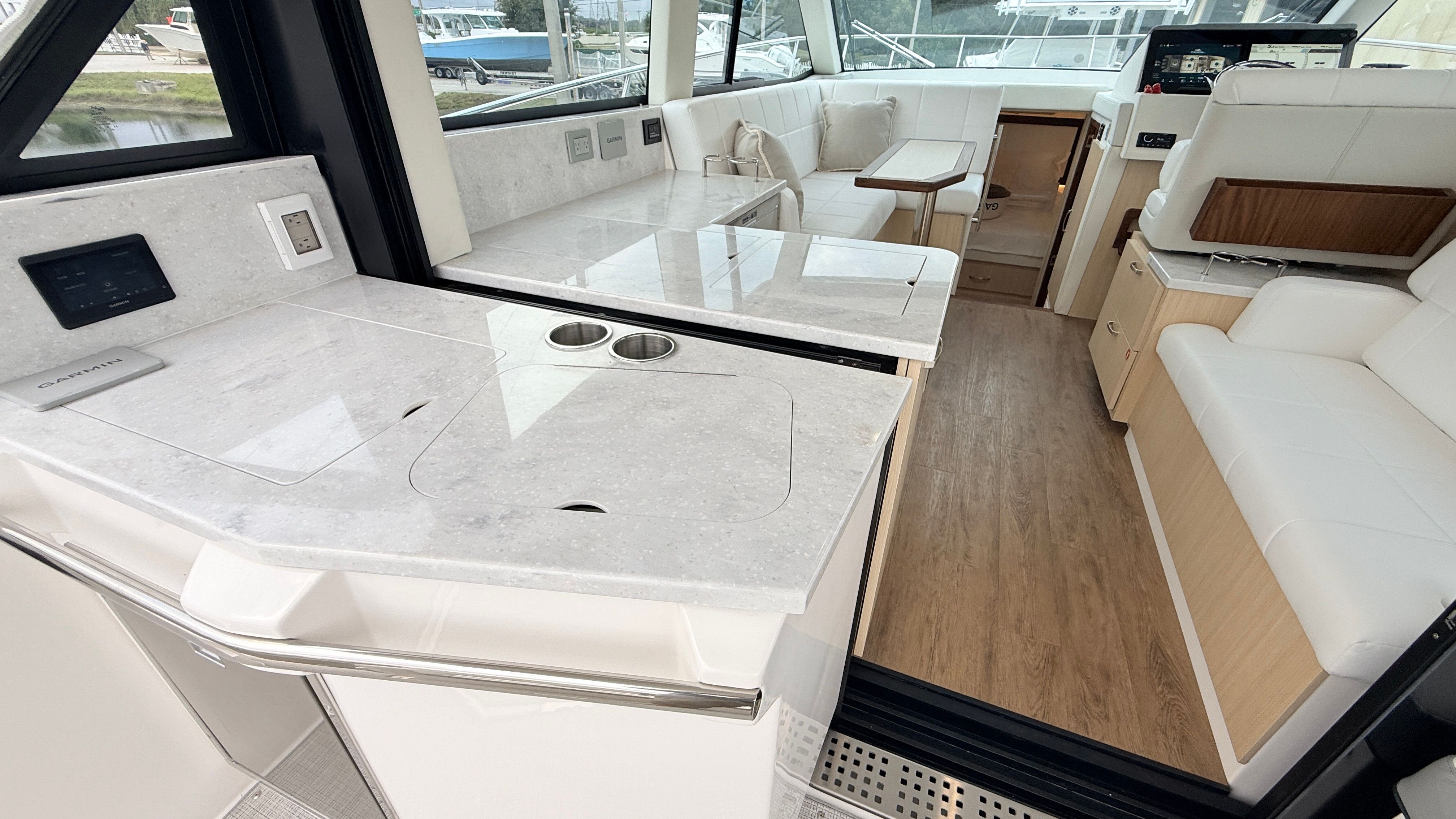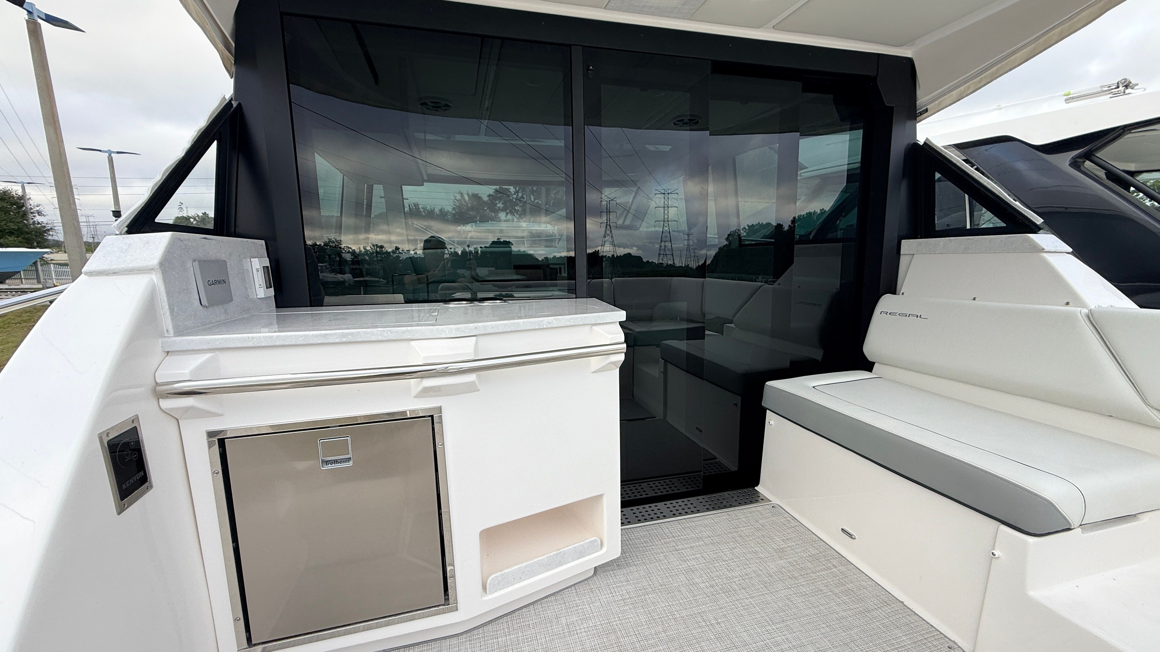 The Regal 38 XO is packed with special features that set it apart from other yacht boats for sale. The hull boasts a striking Tahiti Beach White color, complemented by a Mediterranean Blue bootstripe and matching bottom color. The interior is finished in Titanium, offering a modern and inviting atmosphere for you and your guests. The absence of bottom paint highlights the yacht’s fresh, new condition, while the aft cockpit canvas options, including the transom seat cover and Palm Beach enclosure, provide versatile protection and comfort. The windshield privacy cover and Mediterranean Blue canvas add both style and functionality, ensuring you’re prepared for any weather or occasion.
