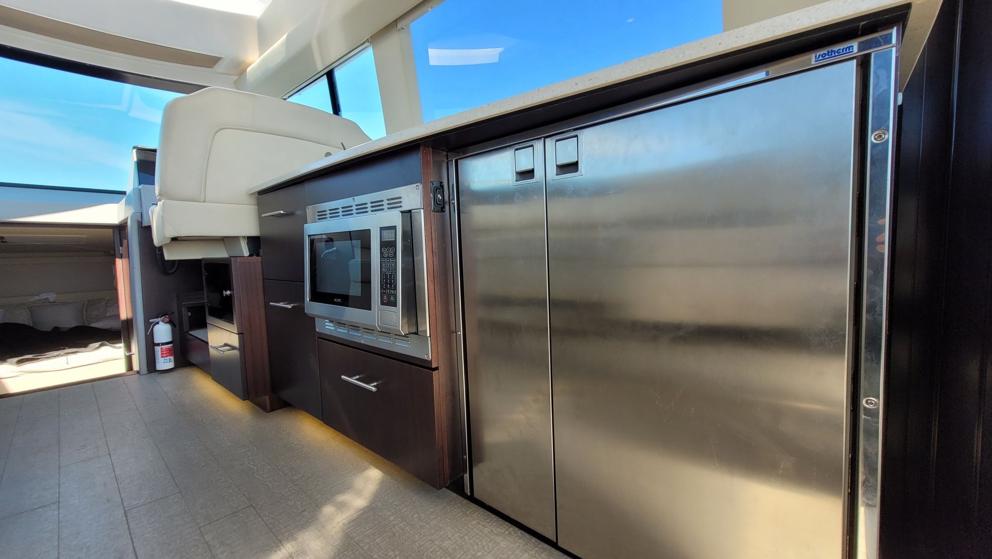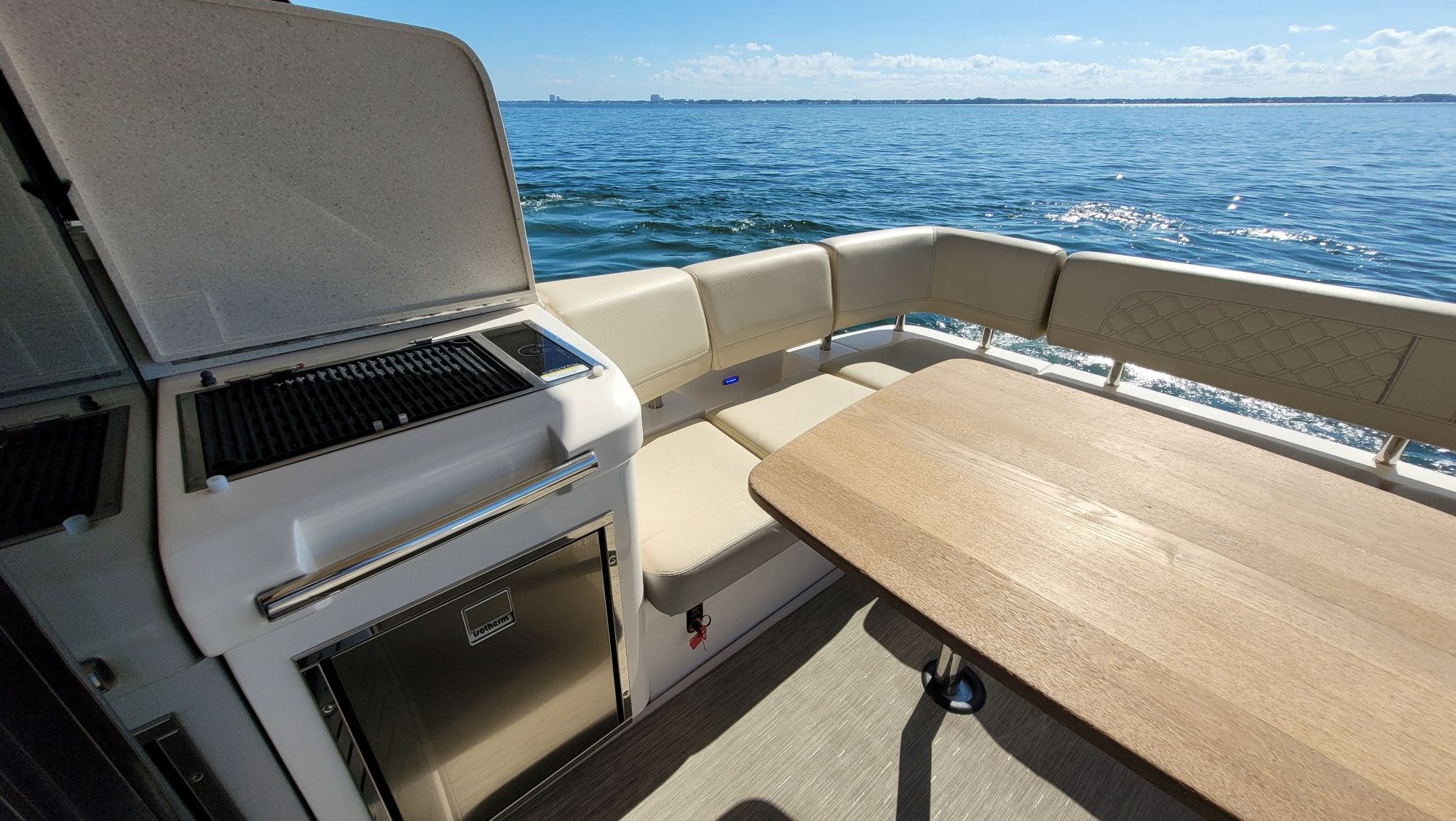 Luxurious Amenities: The boat is equipped with high-end features such as a fully-equipped galley (two-burner stove, microwave, side-by-side refrigerator/freezer), a gourmet grilling station in the cockpit, a hydraulic swim platform with a submersible step and a three-zone air-conditioning system.