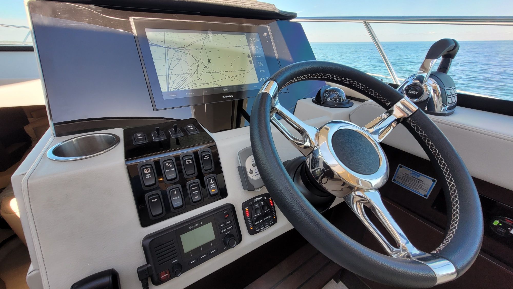 Stored inside since new and professionally maintained and detailed, this is a superb example of this popular luxury motor yacht that only has 164hrs, just had its full annual services and looks incredible! The Grande Coupe is known for blending performance with upscale amenities, including a retractable sunroof and a two-stateroom layout. The vessel emphasizes stability and comfort, making it suitable for both weekend cruising and extended trips.
