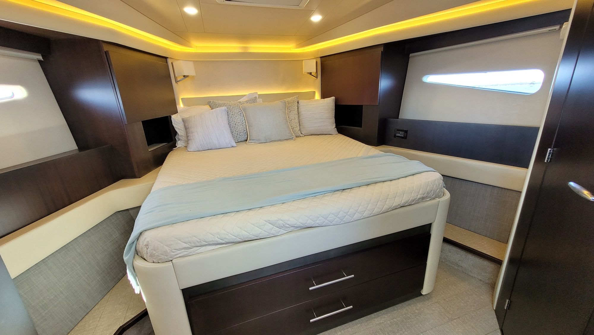 Accommodations: Below deck, the yacht features a two-stateroom layout. The forward master stateroom has an island queen bed with walk-around space, while the aft stateroom offers a large king-size bed that can be converted into twin berths.