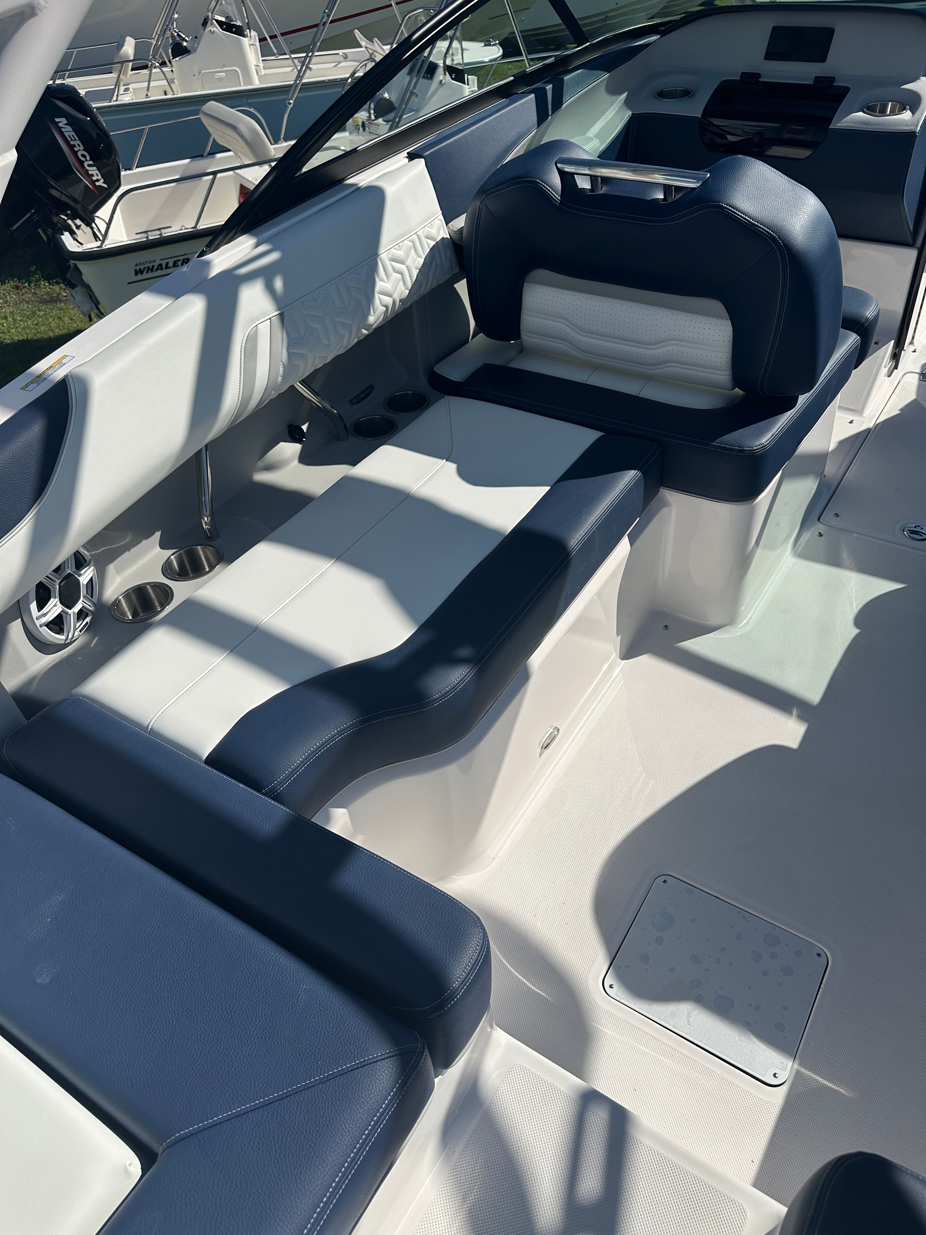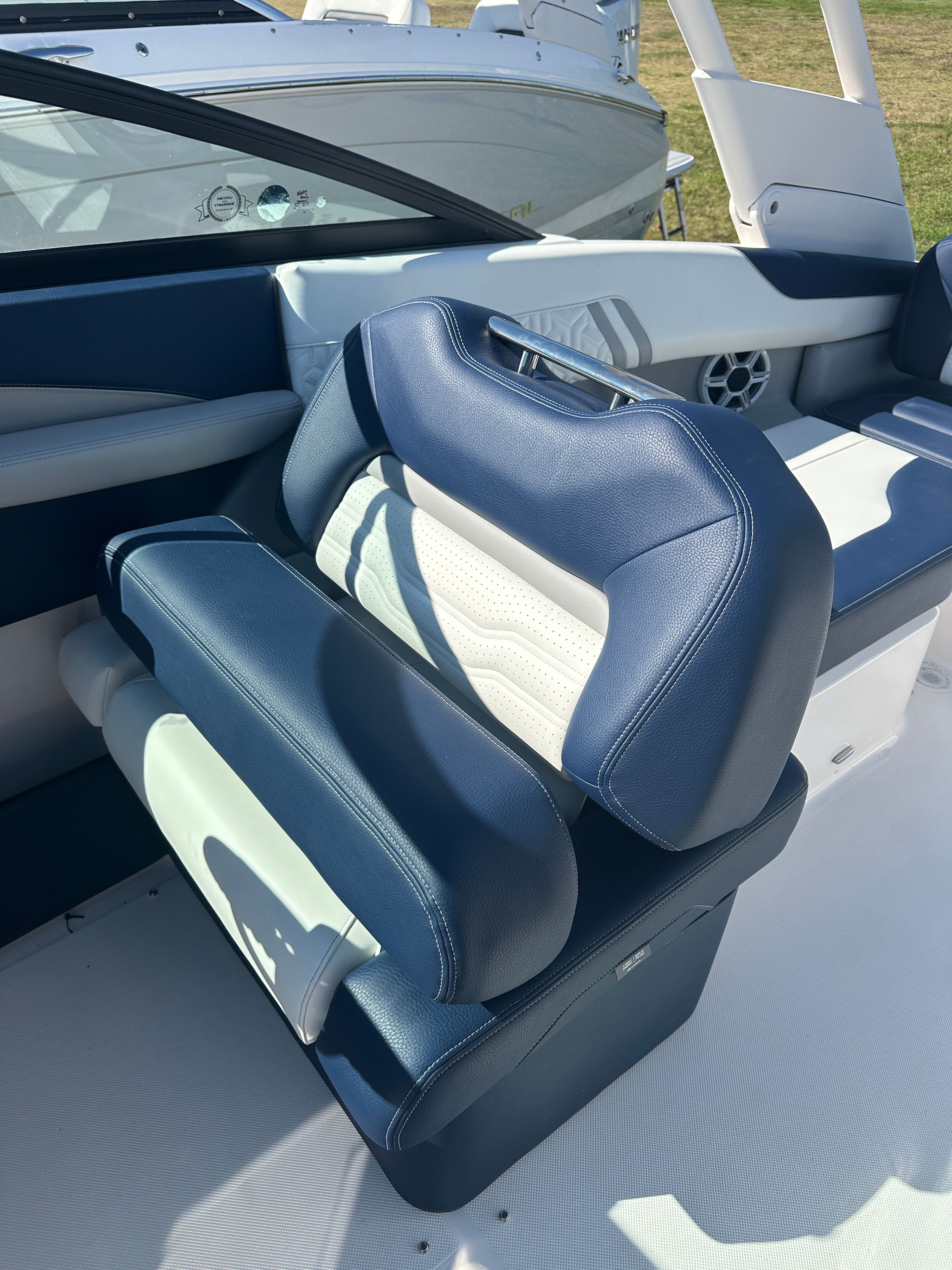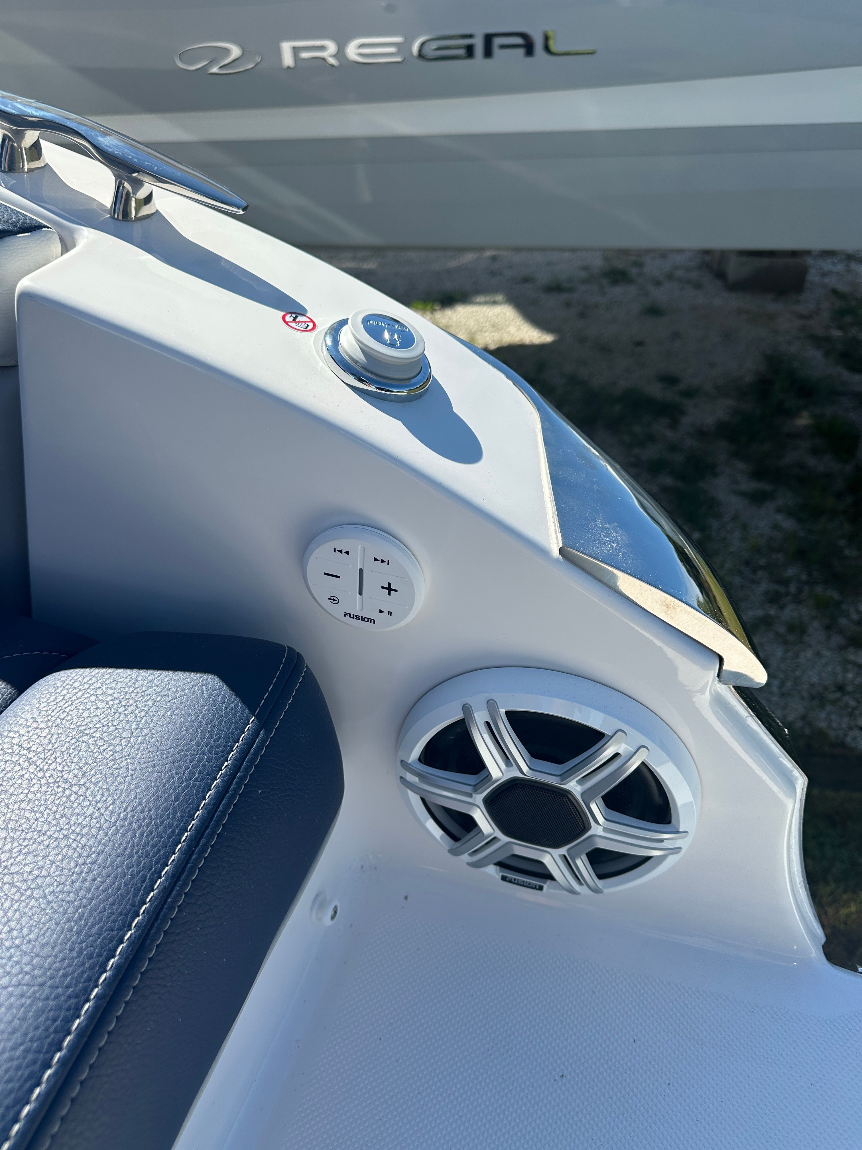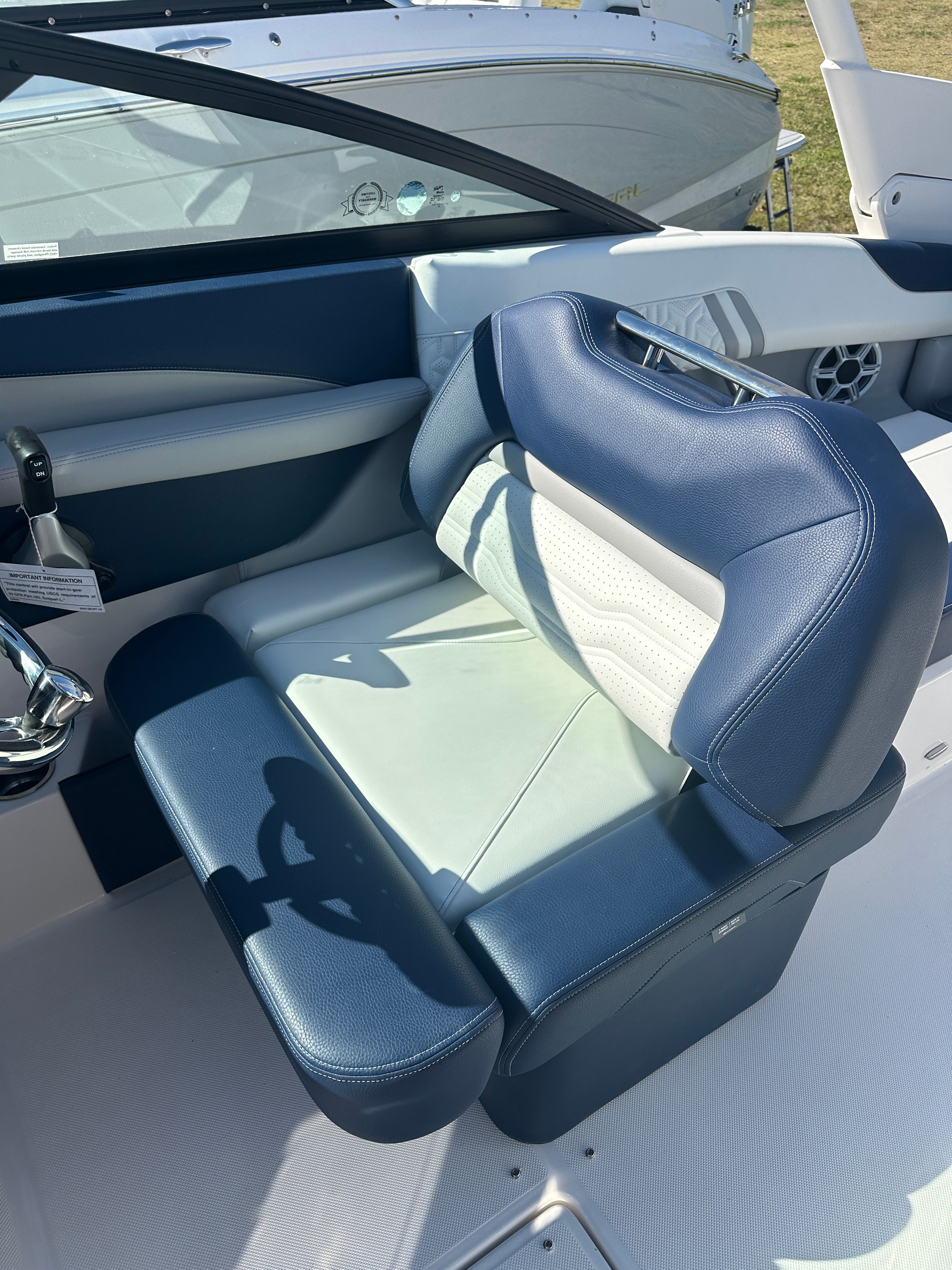 The Regal LX2 is loaded with features that enhance both functionality and enjoyment on the water. The striking Steel Gray hull and Tahiti Beach White bottom create a modern, eye-catching aesthetic, while the Steel Gray boot stripe adds a touch of elegance. The Mediterranean Blue canvas provides stylish protection from the elements, ensuring comfort in any weather. Bow and cockpit covers keep your boat protected when not in use, preserving its pristine condition for years to come.For added convenience and peace of mind, the dual battery switch with tray and cables ensures reliable power management, so you can enjoy longer days on the water without worry. The transom shower and pressure water package make rinsing off after a swim easy and convenient, adding a touch of luxury to your boating experience. The stainless steel upgrade package not only enhances durability but also adds a premium look and feel throughout the boat.Water sports enthusiasts will appreciate the dedicated tow pylon, making it easy to enjoy wakeboarding, tubing, and other activities. The bow walk-thru doors provide seamless access between the bow and cockpit, improving safety and convenience for passengers moving around the boat.