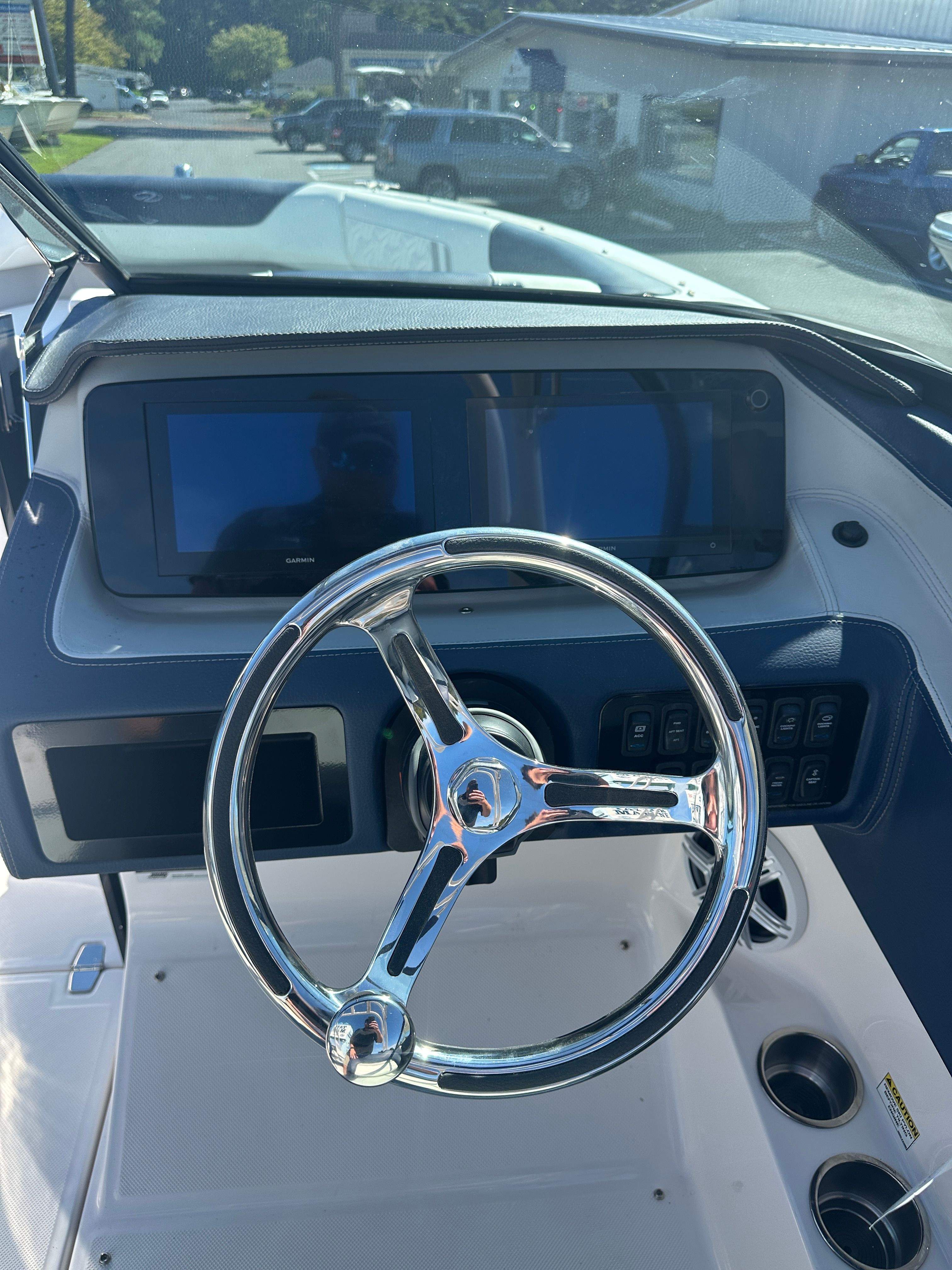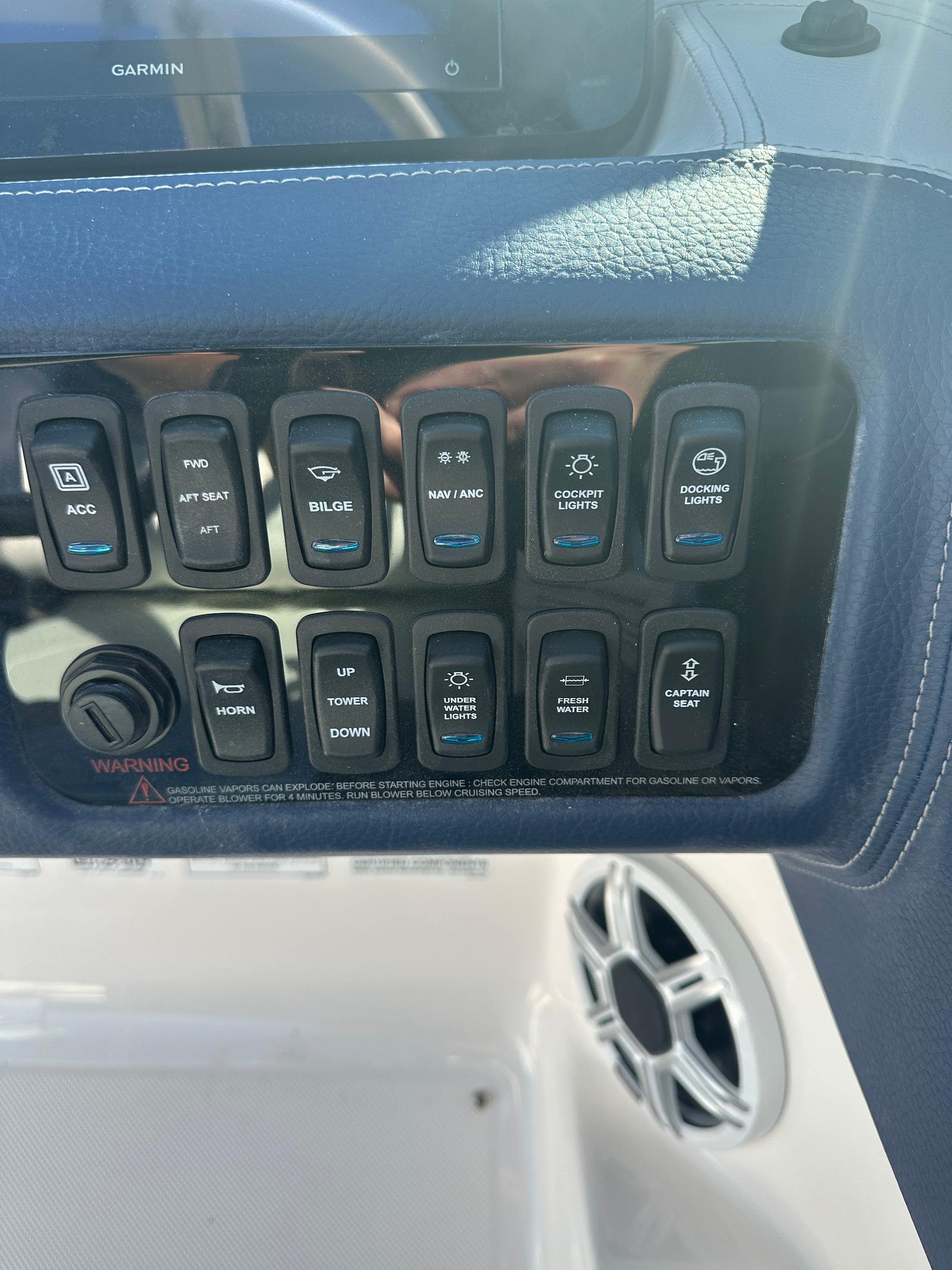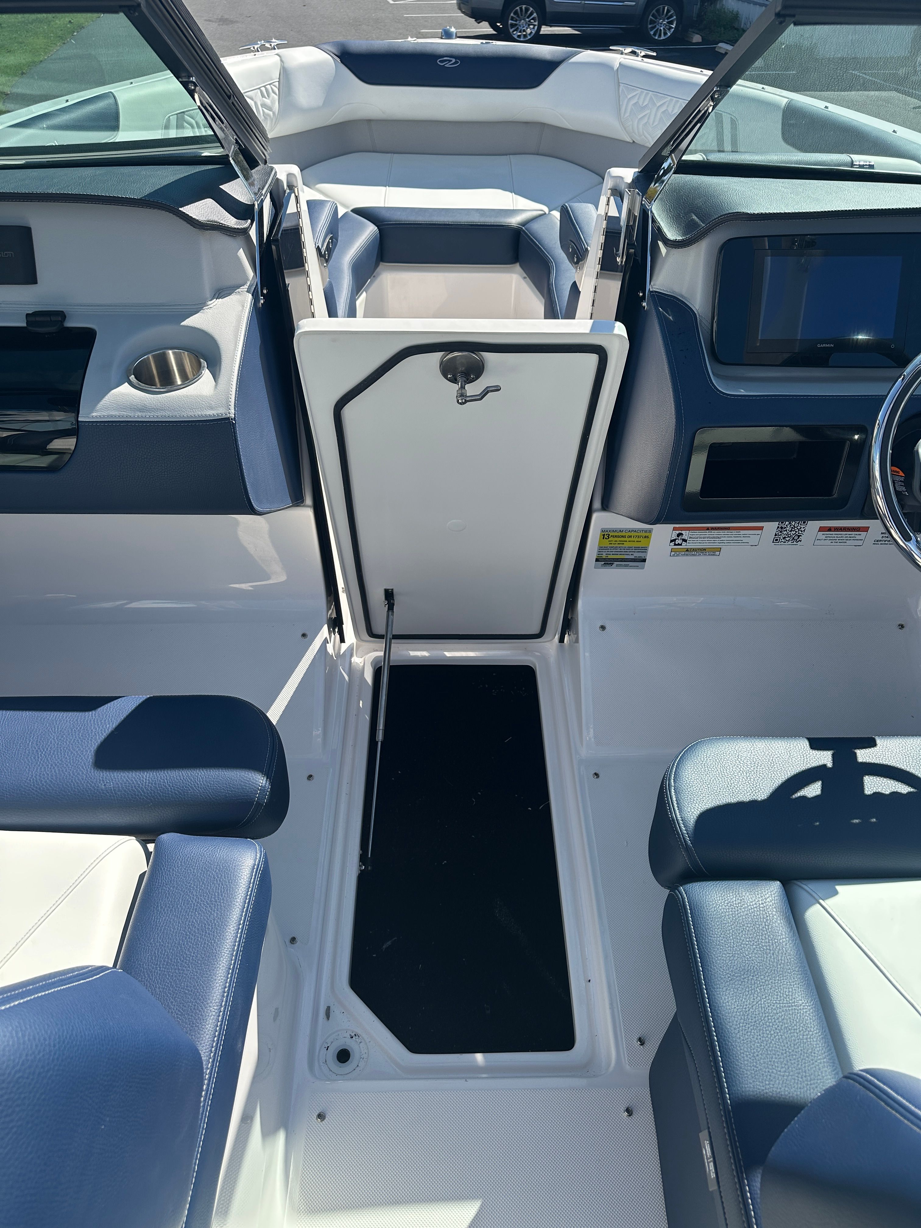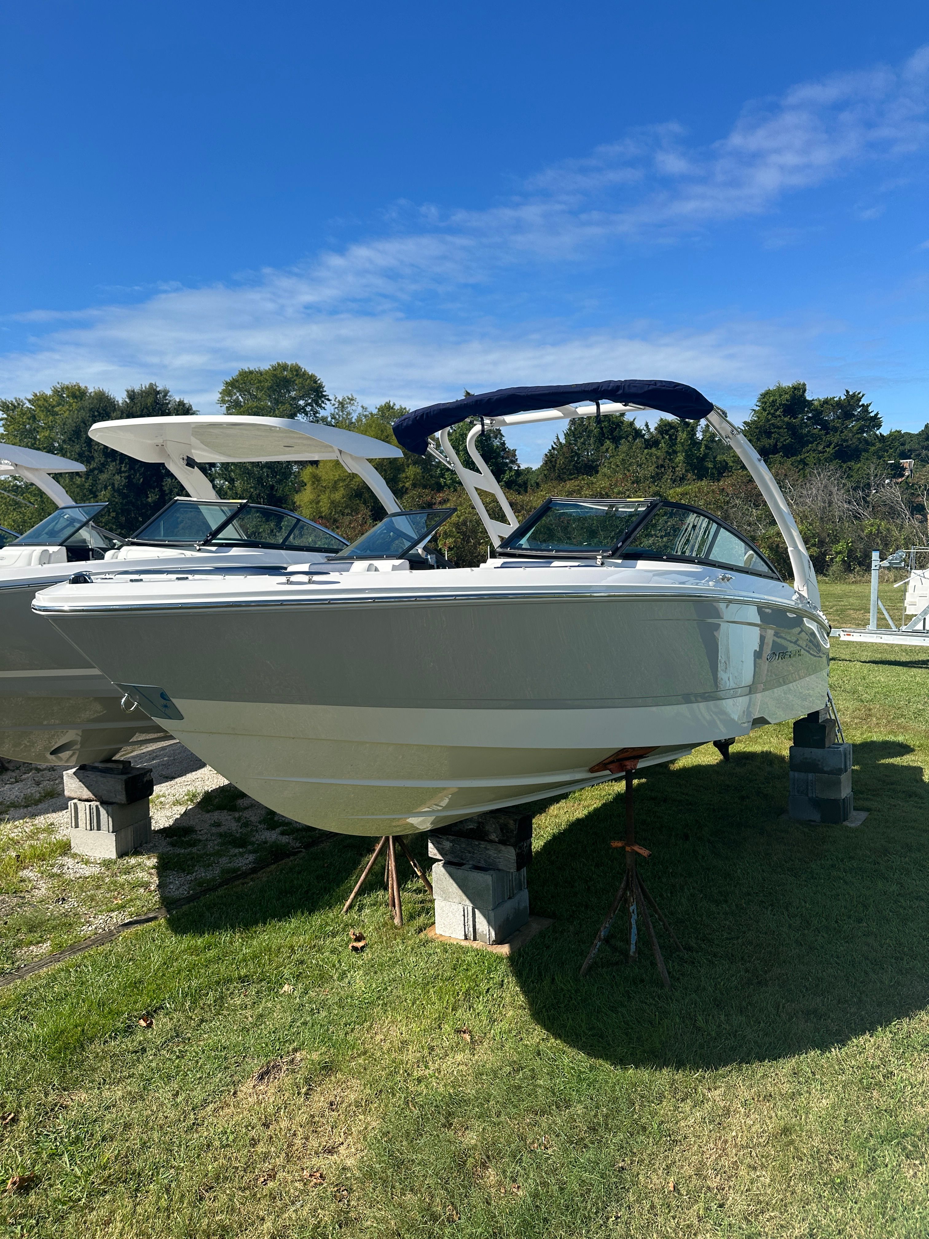 The Regal LX2 is loaded with features that enhance both functionality and enjoyment on the water. The striking Steel Gray hull and Tahiti Beach White bottom create a modern, eye-catching aesthetic, while the Steel Gray boot stripe adds a touch of elegance. The Mediterranean Blue canvas provides stylish protection from the elements, ensuring comfort in any weather. Bow and cockpit covers keep your boat protected when not in use, preserving its pristine condition for years to come.For added convenience and peace of mind, the dual battery switch with tray and cables ensures reliable power management, so you can enjoy longer days on the water without worry. The transom shower and pressure water package make rinsing off after a swim easy and convenient, adding a touch of luxury to your boating experience. The stainless steel upgrade package not only enhances durability but also adds a premium look and feel throughout the boat.Water sports enthusiasts will appreciate the dedicated tow pylon, making it easy to enjoy wakeboarding, tubing, and other activities. The bow walk-thru doors provide seamless access between the bow and cockpit, improving safety and convenience for passengers moving around the boat.