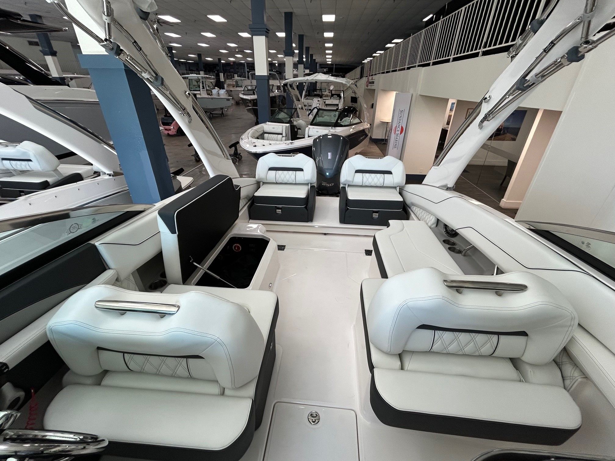 The 2025 Regal LX4 comes loaded with premium features that elevate your boating experience. The dual Garmin 943 displays provide state-of-the-art navigation and system monitoring, giving you confidence and control at the helm. The transom shower and pressure water package add a touch of convenience, allowing you to rinse off after a swim or clean up with ease. The hull’s Steel Grey color is complemented by a black travel storage cover, ensuring your boat stays protected when not in use.The PowerTower in white is a standout feature, offering both style and functionality, while the head compartment adds a level of comfort and privacy for longer outings. The inclusion of a premium package ensures that every detail, from upholstery to hardware, meets the highest standards of luxury. The port light in a half-moon design brings in natural light and enhances the cabin’s ambiance. With black canvas accents, the LX4’s aesthetic is both modern and timeless, making it a Regal boat for sale that truly stands out.