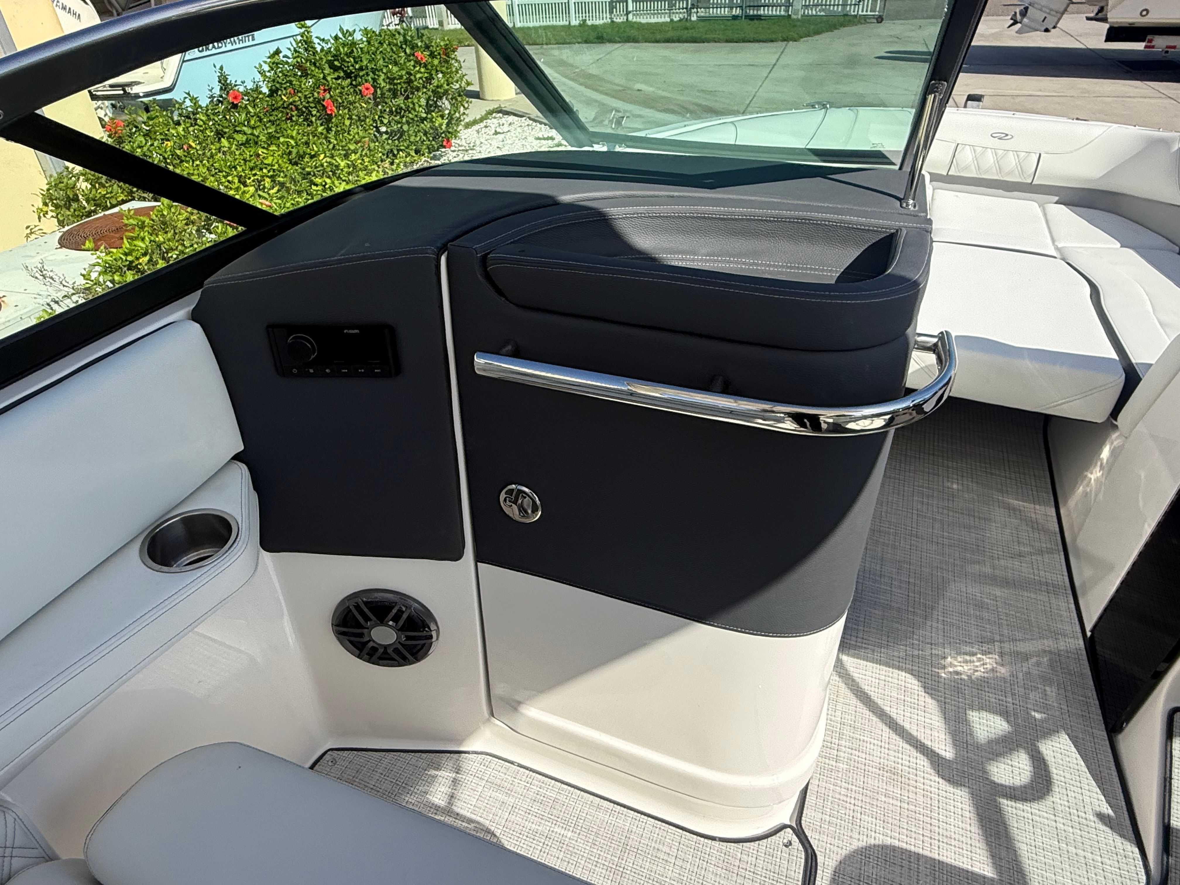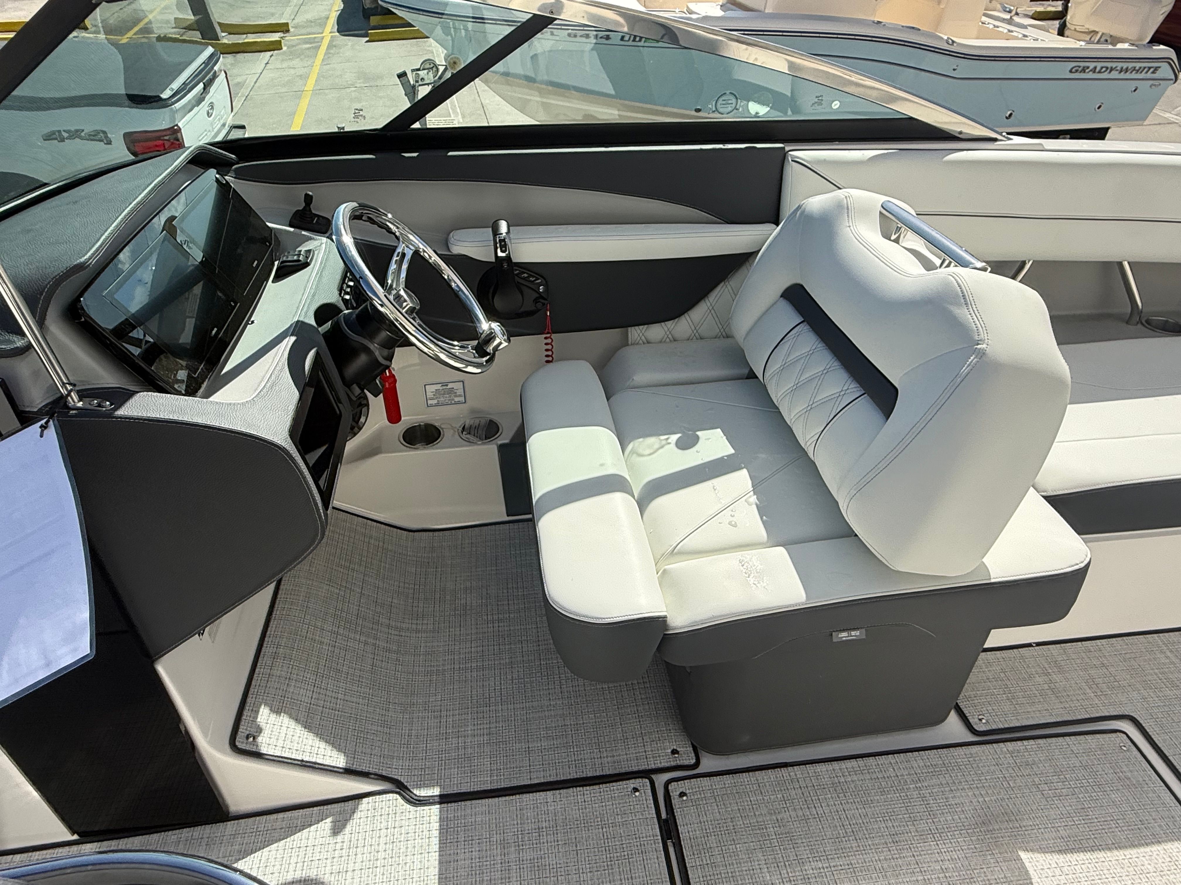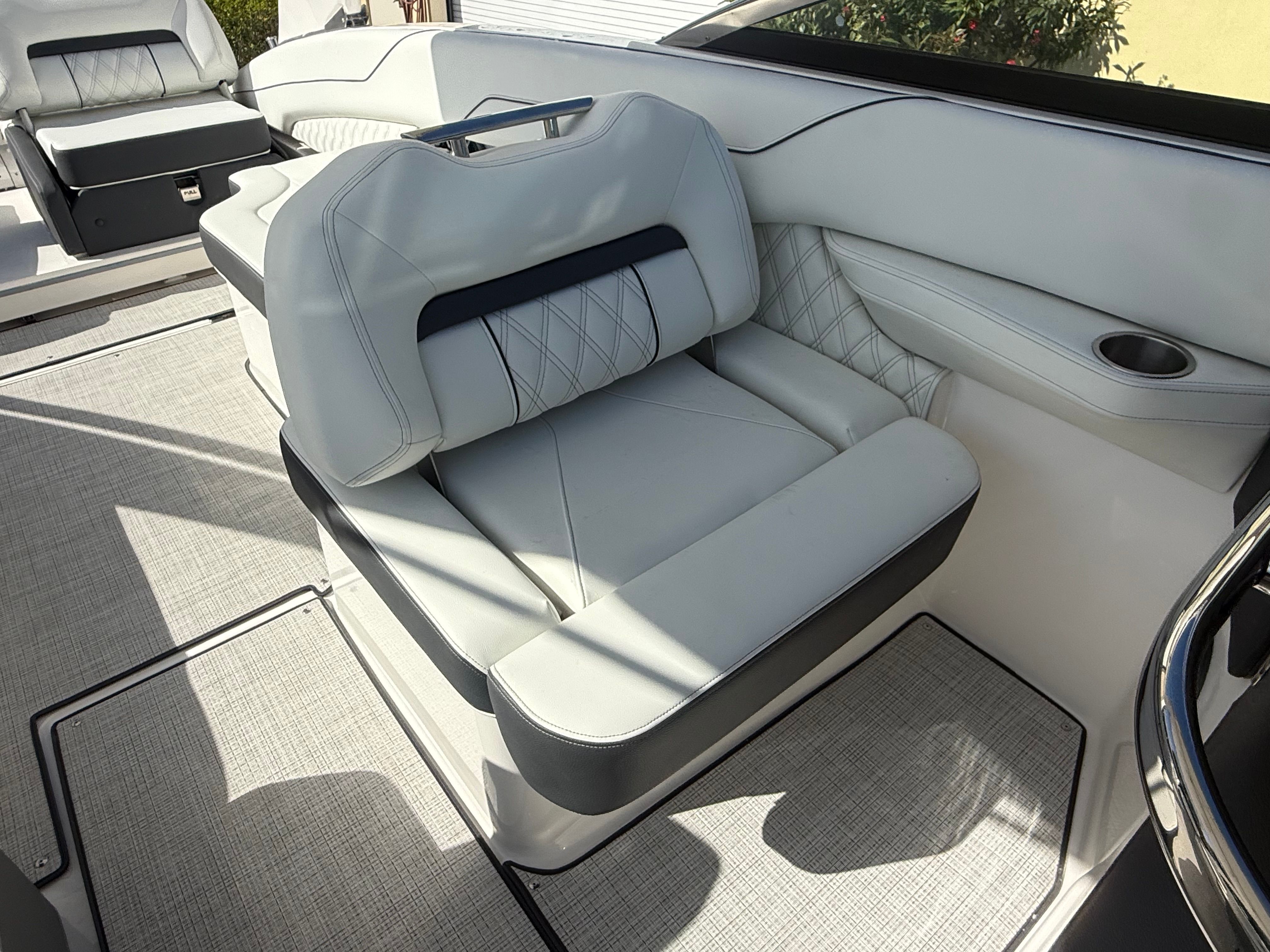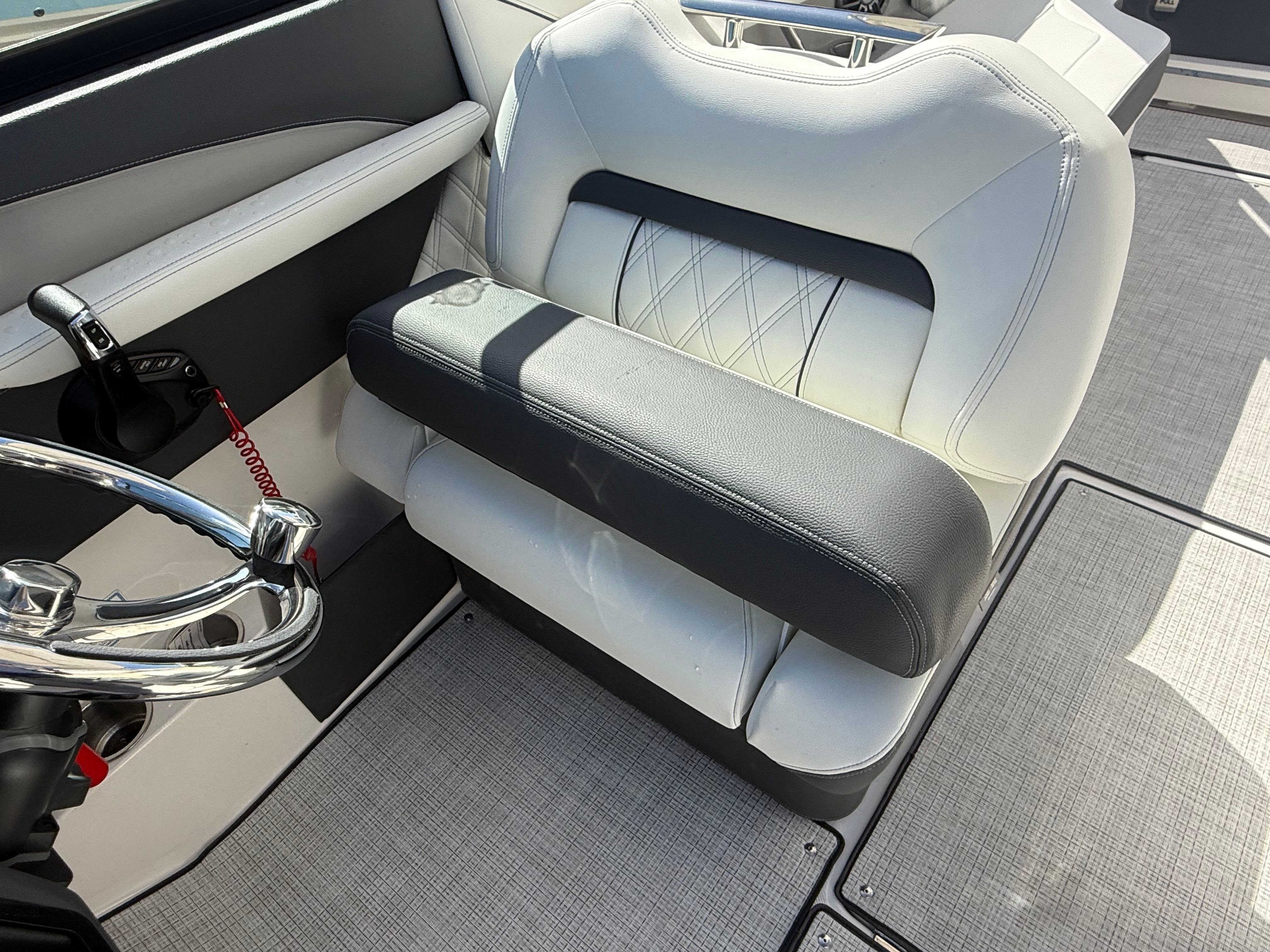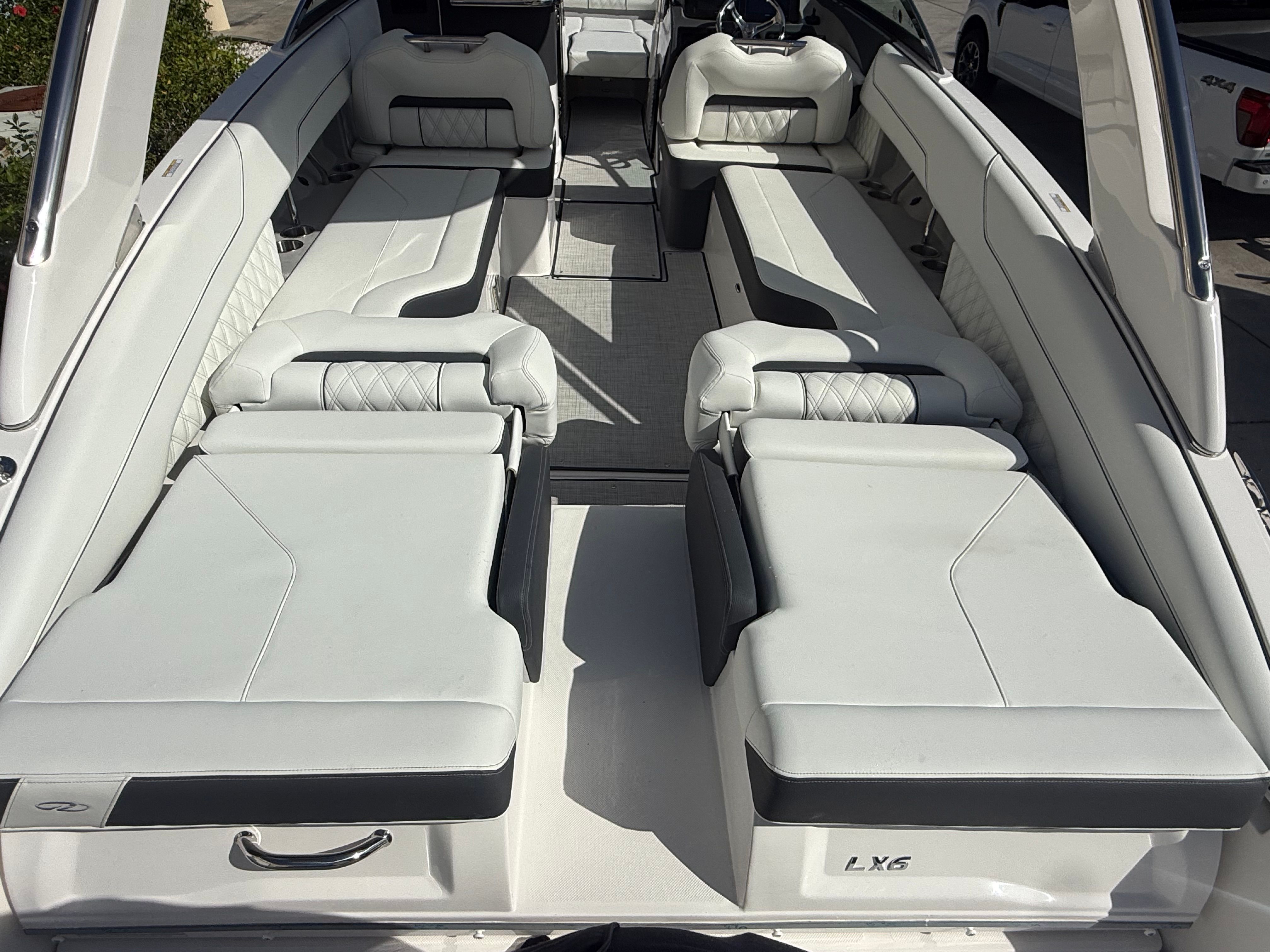 The Regal LX6 is loaded with premium features designed to enhance your boating experience. Bow and cockpit covers provide essential protection from the elements, keeping your boat looking pristine and ready for action. The manual bow and cockpit sunshade system, finished in a stylish steel gray canvas, offers customizable shade options, ensuring comfort during sunny days on the water. Step onto the cockpit seagrass mat and enjoy a soft, non-slip surface that adds a touch of elegance and practicality to the deck.For peace of mind and convenience, the LX6 includes a dual battery switch with tray and cables, as well as a battery charger, ensuring reliable power for all your onboard systems. The bow thruster makes maneuvering in tight spaces a breeze, while the transom shower and pressure water package provide refreshing convenience after a swim or water sports session. With these thoughtful features, the LX6 stands out as a top choice among bowrider boats for sale.