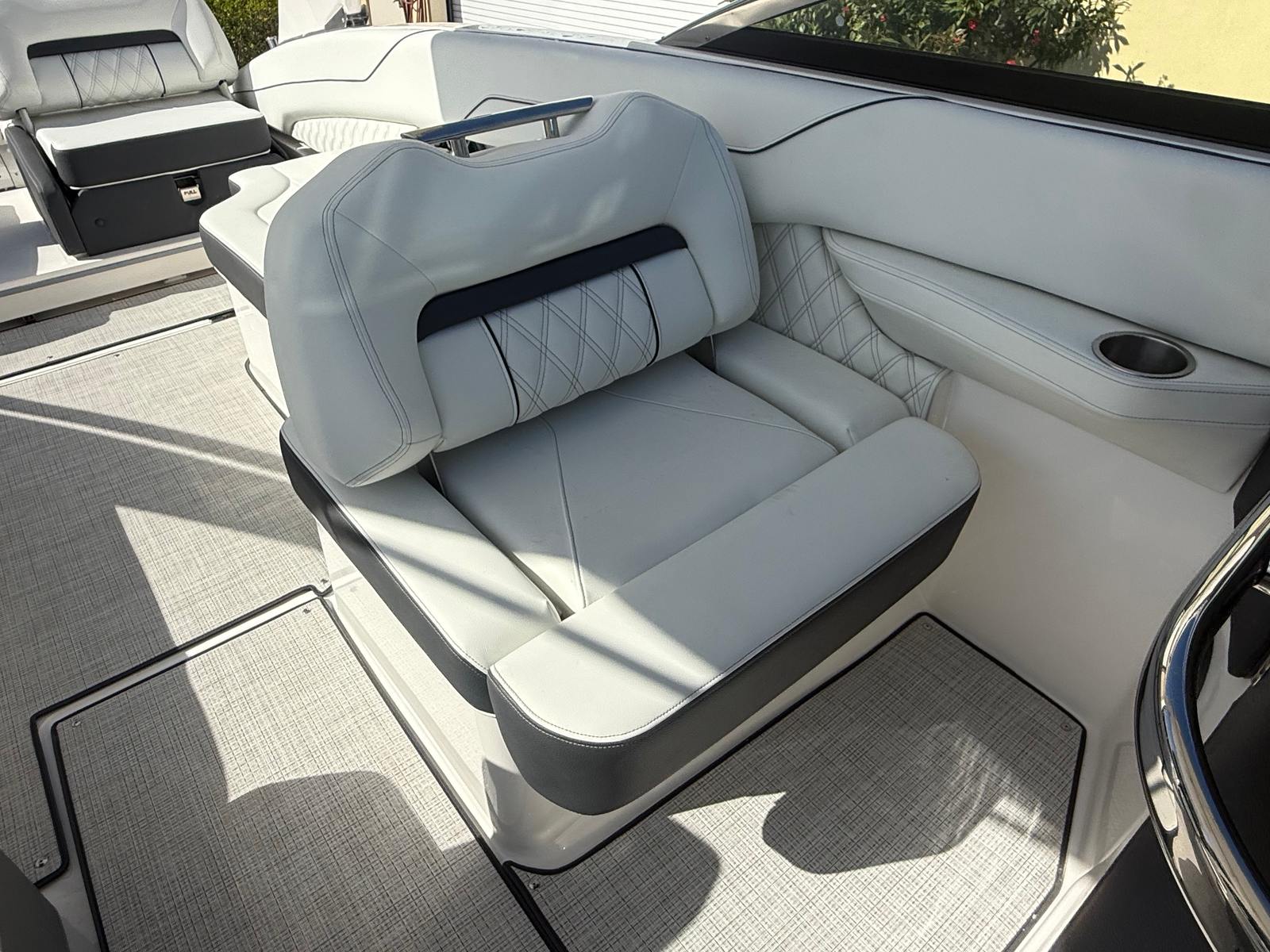 Beyond its impressive performance and luxurious features, the Regal LX6 is designed with practicality in mind. The dual battery system ensures that you have reliable power for extended outings, while the battery charger keeps everything running smoothly. The bow thruster simplifies docking and maneuvering in marinas, making it easy for boaters of all experience levels to handle the LX6 with confidence.The cockpit seagrass mat not only enhances comfort but also makes cleaning and maintenance a breeze. The bow and cockpit covers protect your investment from sun and weather, preserving the boat’s appearance and value. With the trim tabs, you can easily adjust the boat’s attitude for optimal fuel efficiency and ride comfort, ensuring that every trip is as enjoyable as possible.