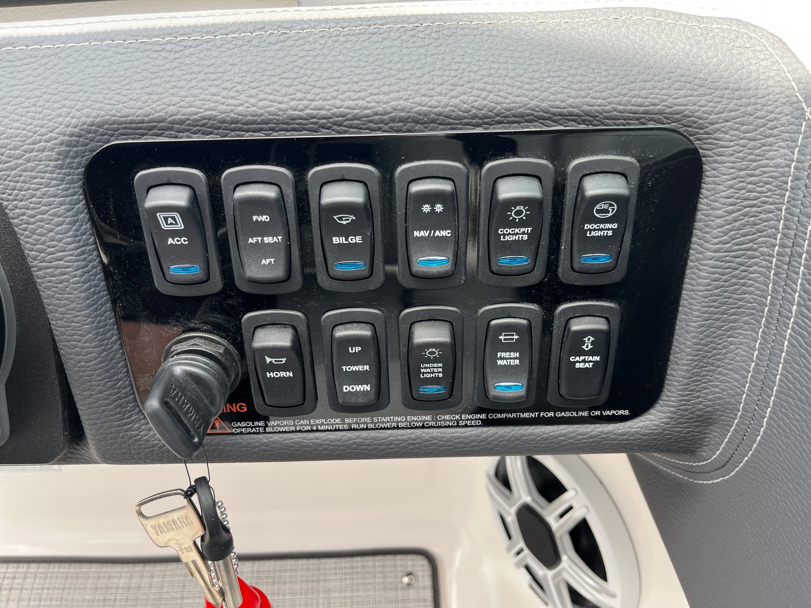 The 2026 Regal LX6 is equipped with a host of special features that elevate your boating experience. Bow and cockpit covers provide essential protection from the elements, keeping your boat in pristine condition. The manual bow and cockpit sunshade system, crafted in a stylish steel gray canvas, offers flexible shade options for sunny days, ensuring comfort for everyone on board. The cockpit seagrass mat adds a touch of elegance and comfort underfoot, creating a welcoming environment for lounging and socializing.For added convenience and peace of mind, the LX6 includes a dual battery switch with tray and cables, as well as a battery charger, ensuring you have reliable power for all your onboard systems. The bow thruster enhances your control during docking and close-quarters maneuvering, making every trip stress-free. The transom shower and pressure water package provide the luxury of rinsing off after a swim or cleaning up with ease. Trim tabs are also included, allowing you to fine-tune your ride for optimal performance and comfort in varying water conditions.