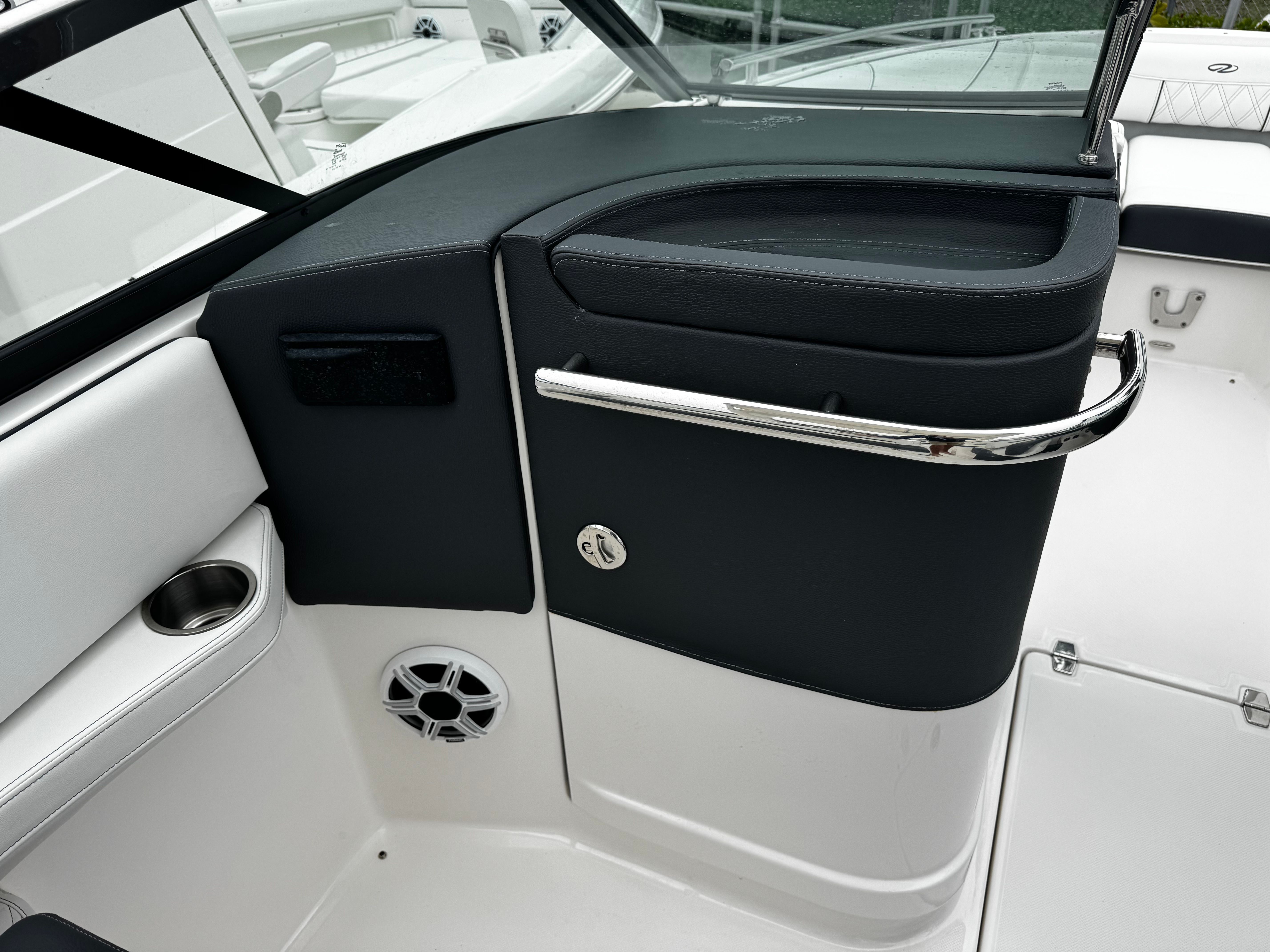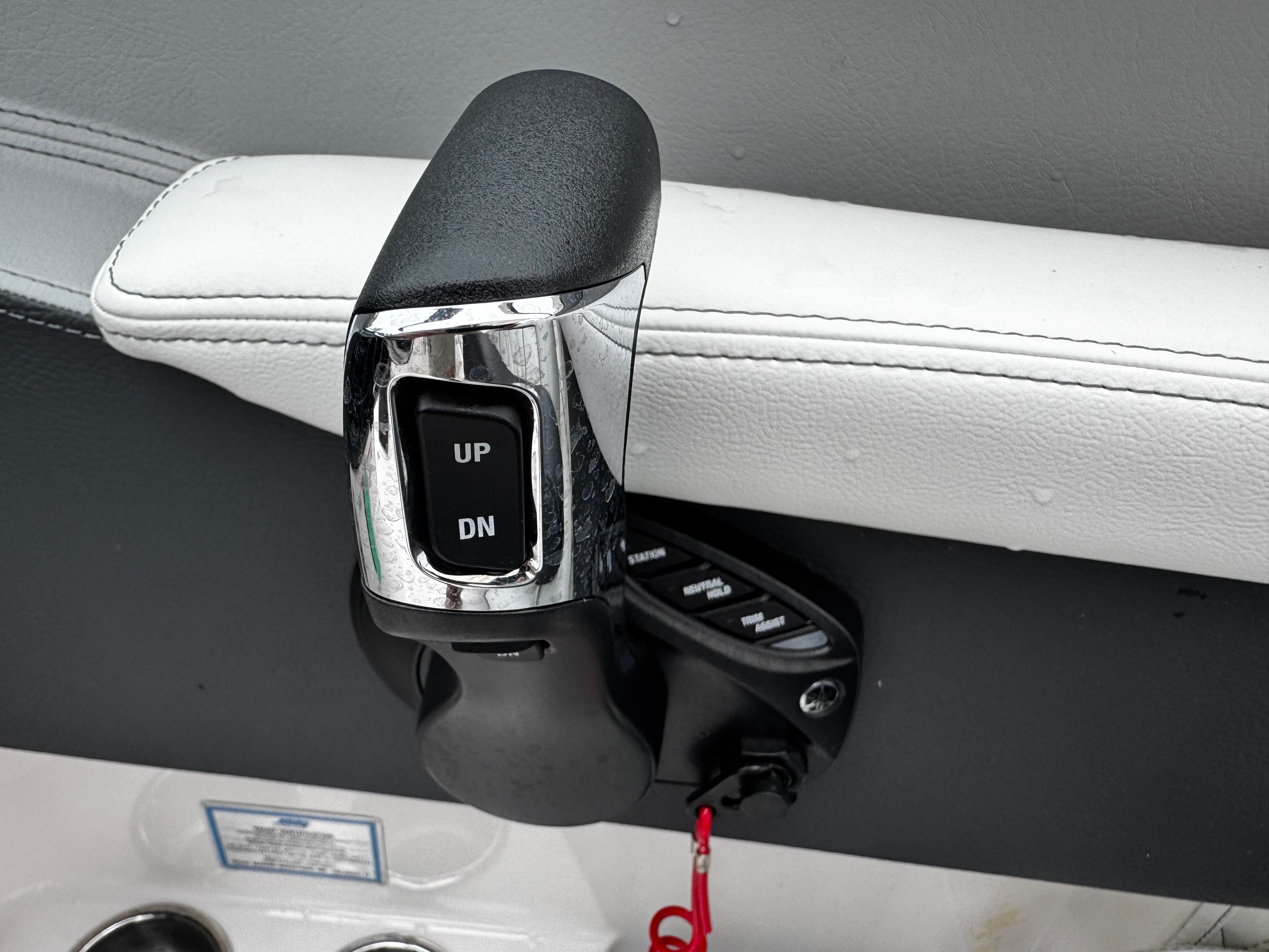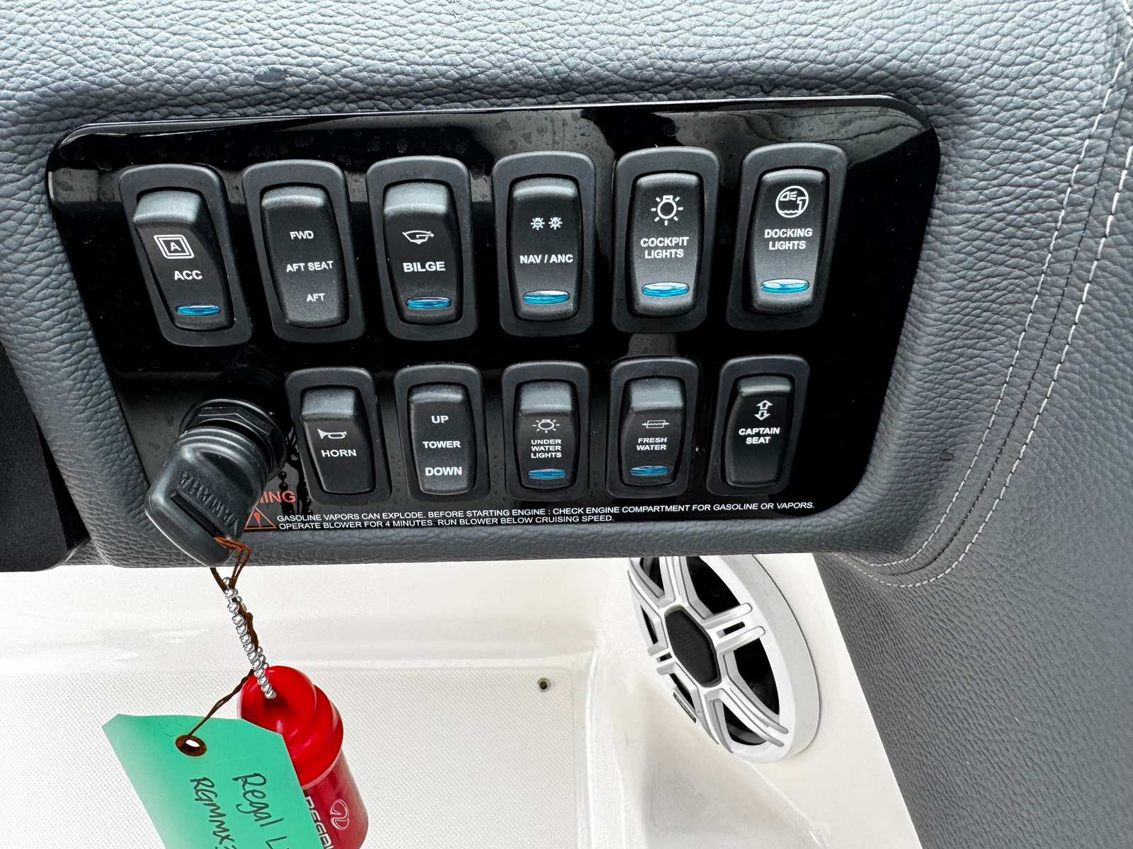Practicality meets luxury in the Regal LX6 Bowrider. The dual battery switch and charger provide peace of mind, ensuring your electronics and accessories remain powered throughout your adventures. The bow thruster makes docking and maneuvering in crowded marinas a breeze, reducing stress and enhancing safety. The Bimini Top offers shade and protection, allowing you to enjoy longer days on the water without worrying about sun exposure.Storage solutions are thoughtfully integrated, making it easy to stow gear, water toys, and personal items. The pressure water package and transom shower add convenience for rinsing off after swimming, keeping the boat clean and comfortable. With its efficient engine and streamlined design, the LX6 offers excellent fuel economy, so you can spend more time enjoying the water and less time refueling.