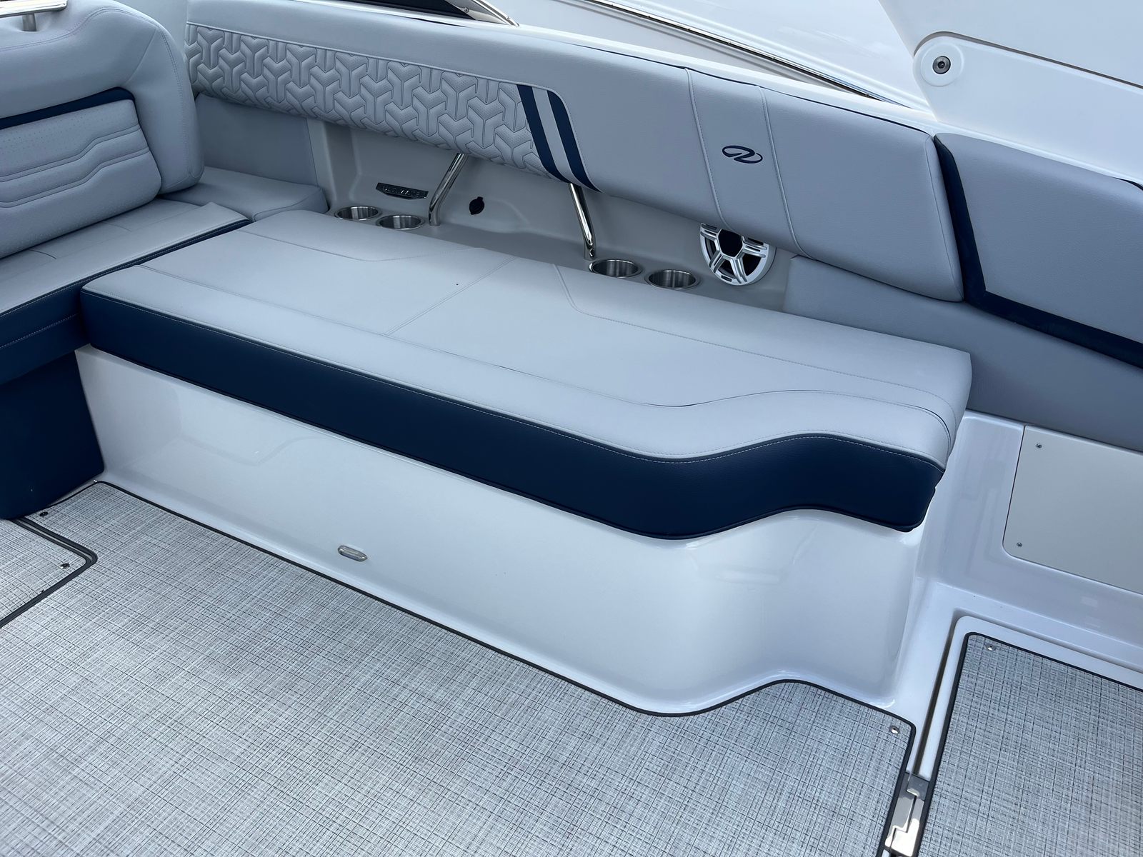 The Regal LX9 Ultimate is designed to turn heads and elevate your time on the water. Its Mediterranean Blue hull, accented by a Steel Gray bootstripe and Tahiti Beach White bottom, creates a striking visual statement that stands out in any marina. The interior features a sophisticated color palette, with Lunar Gray and Mediterranean Blue zones that provide a cool, inviting atmosphere for you and your guests. Each seating zone is crafted for comfort, ensuring everyone on board enjoys the ride as much as the destination.Special features of the LX9 Ultimate include the powerful twin Yamaha F200XSA2 engines, a hull color in Mediterranean Blue, a Steel Gray bootstripe, a bottom color in Tahiti Beach White, and a multi-zone interior with Lunar Gray and Mediterranean Blue accents. Every detail is meticulously chosen to enhance both aesthetics and functionality, making this bowrider as beautiful as it is practical.