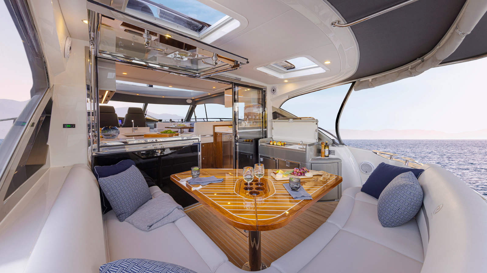 The Riviera 4600 Sport Yacht is designed with practicality in mind, offering features that make ownership both easy and enjoyable. The advanced battery systems and dual fresh water pumps provide peace of mind for longer trips, while the dual fuel filters and water separators help maintain engine performance and reliability. The Volvo Assisted Docking System and Dynamic Positioning System make docking and maneuvering in tight spaces a breeze, reducing stress and increasing confidence for captains of all experience levels. The yacht’s efficient engines and interceptor system contribute to fuel savings and a smoother ride, allowing you to focus on enjoying your time on the water.