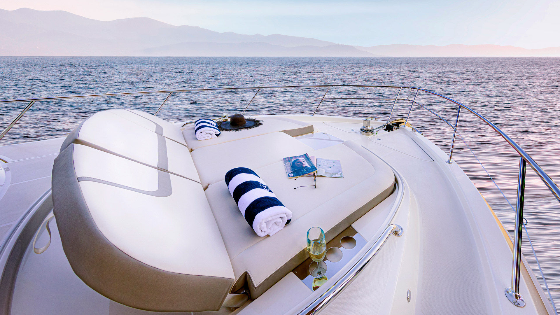 - Upholstery upgrade to cockpit lounge and foredeck sun pad - Sunbrella - R logo embroidery on transom lounge to compliment fabric selection (Inc White Stamoid cover)
