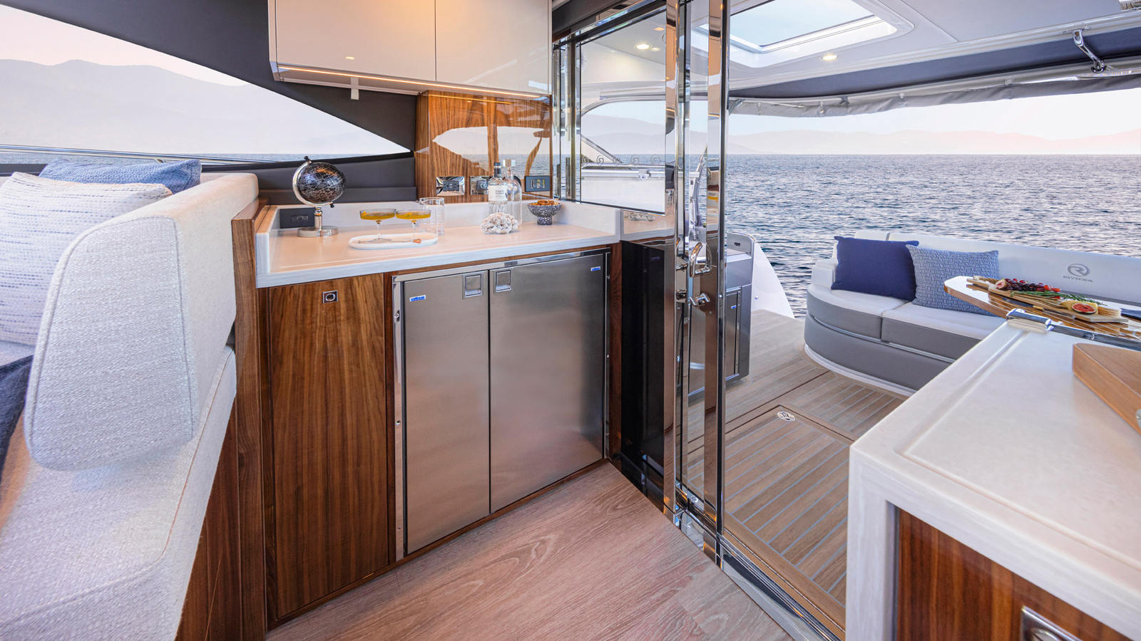 - Waterfall galley benchtop ends in solid surface to match galley benchtop selection (