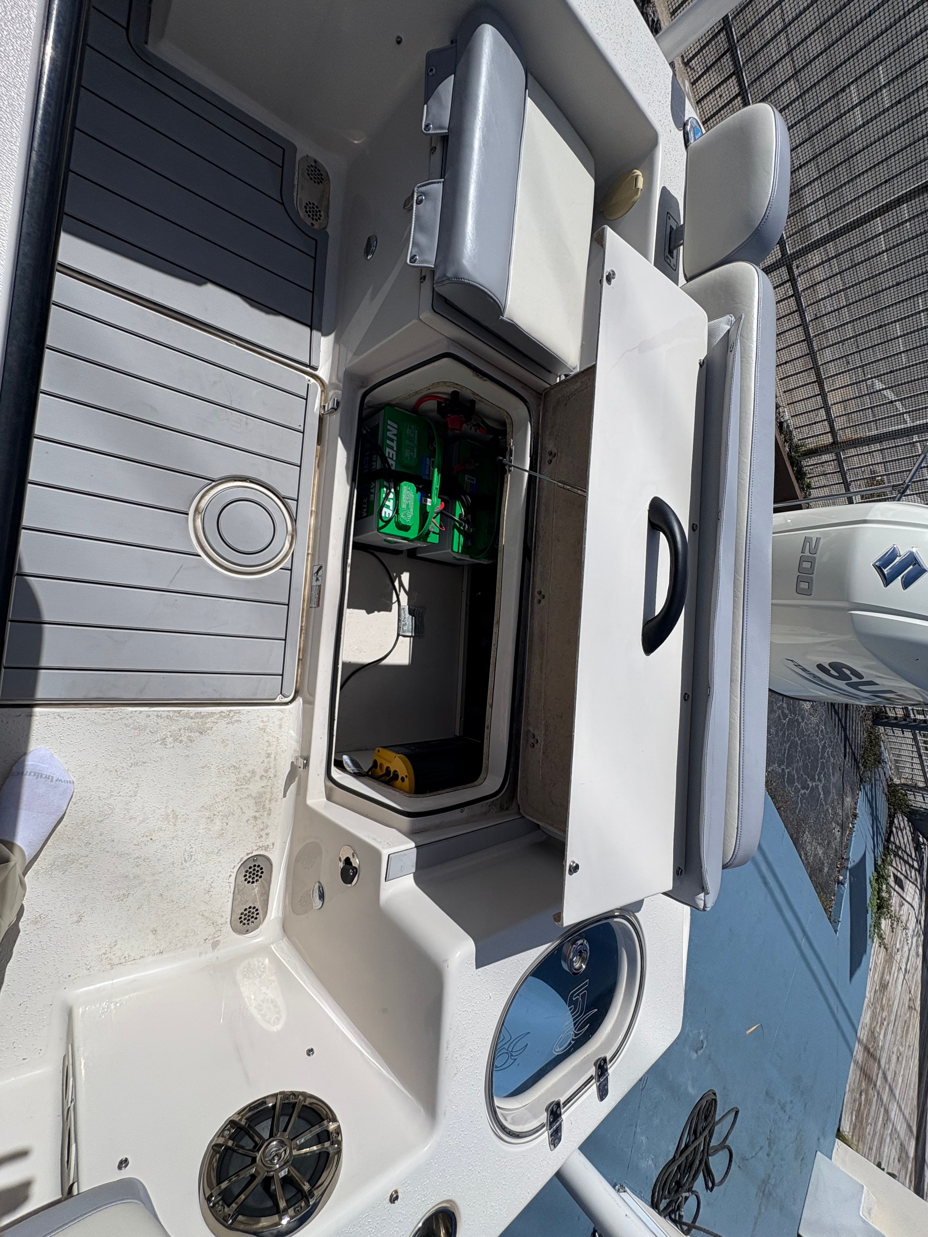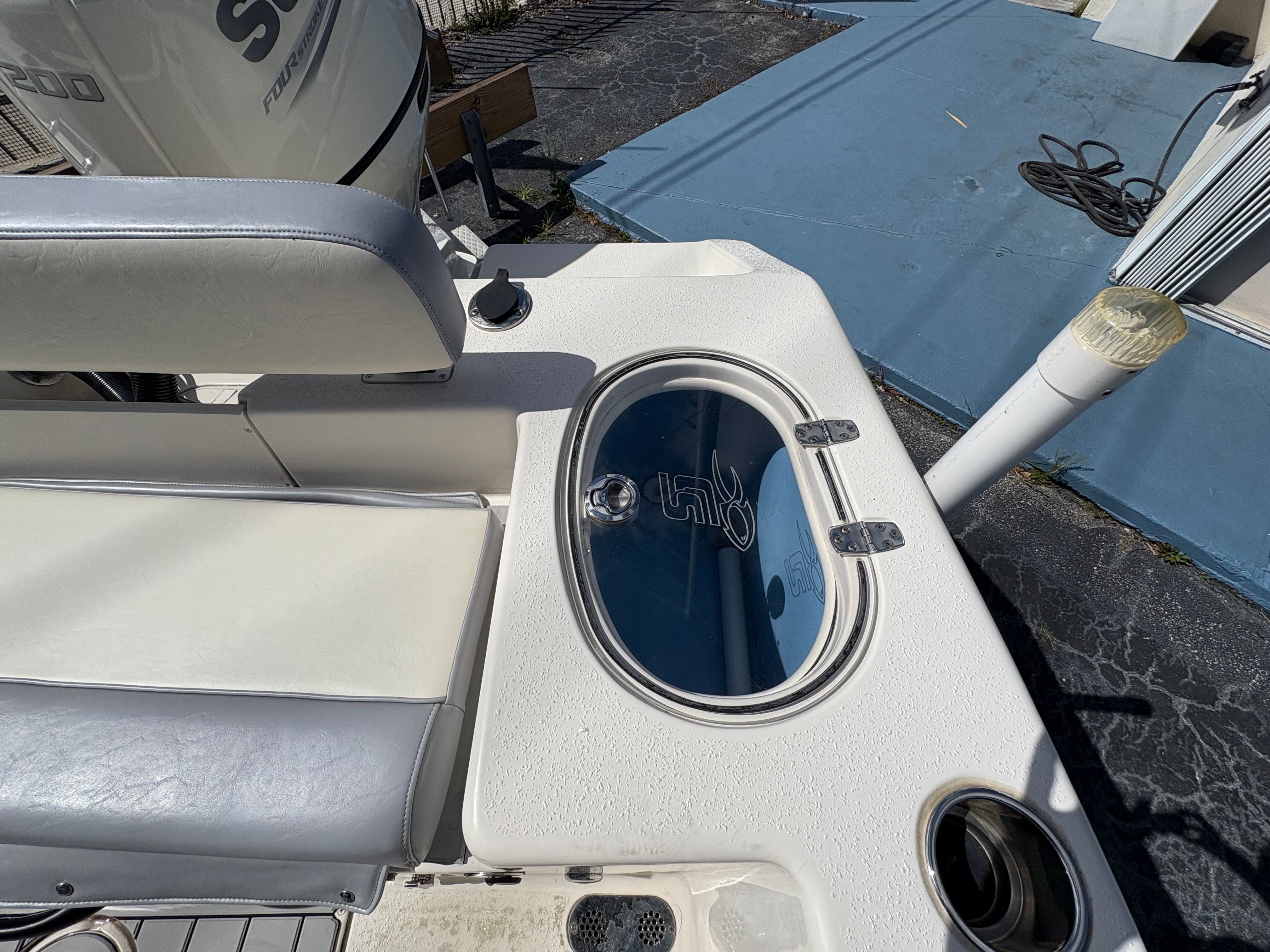 Fishability: 25-gallon LED-lit stern livewell with a high-speed pickup and Max Air system, under-gunnel rod storage, multiple stainless flush-mount rod holders, a raw water washdown, and a large insulated in-deck fish box.